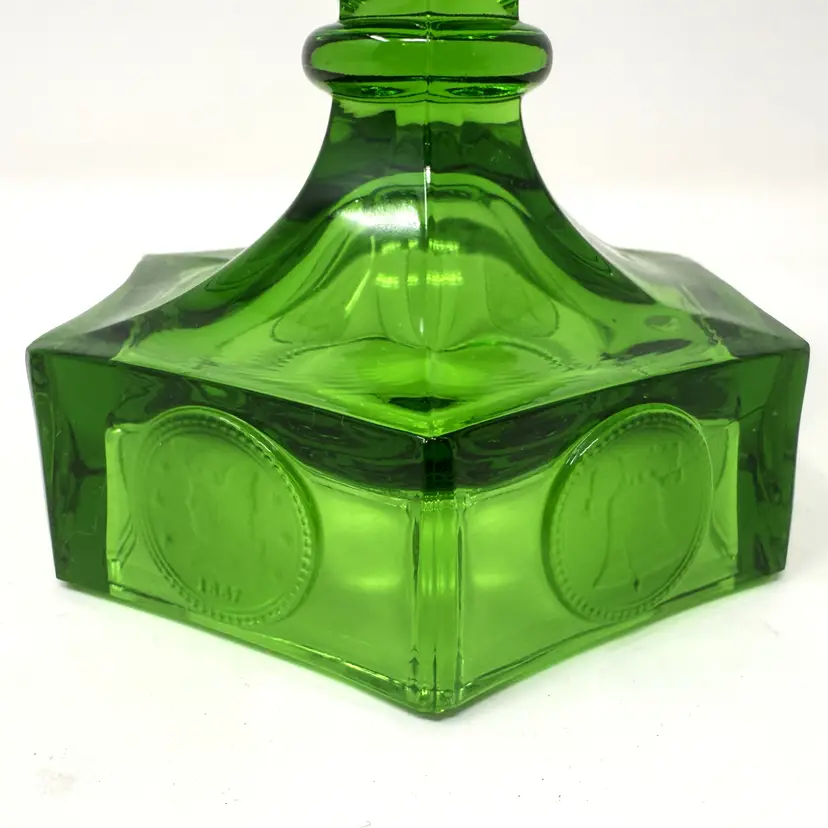 Details: • Manufacturer: Fostoria Glass Co., Moundsville, WV • Markings: Unmarked (typical for mid-1960s production) • Date/Era: Circa 1965–1972 • Design Style: Colonial Revival, Traditional, Mid-Century Modern • Shape & Style: Hexagonal base with scalloped tulip top; molded commemorative coin detail • Material & Color: Pressed glass, emerald green • Dimensions: 5 in tall × 3.5 in base diameter • Weight (pair): 1 lb 12 oz