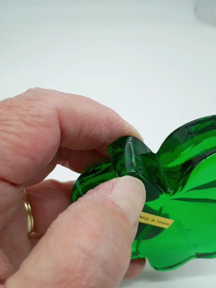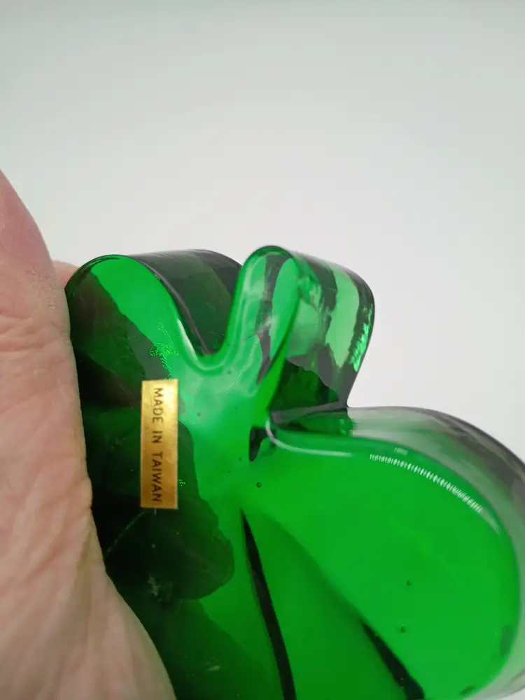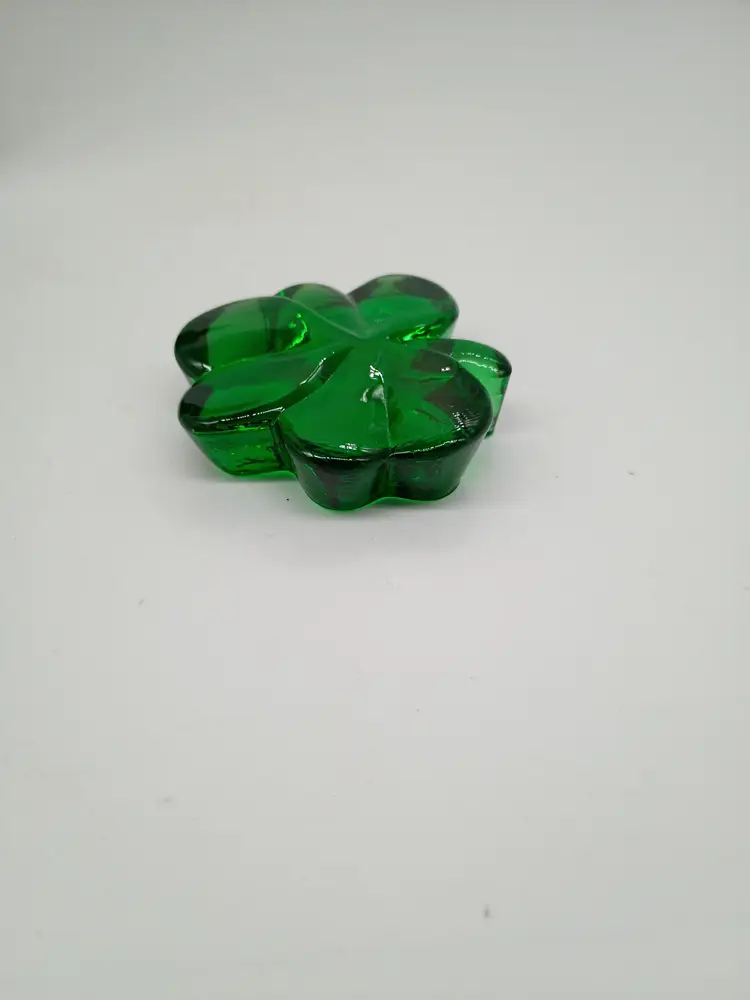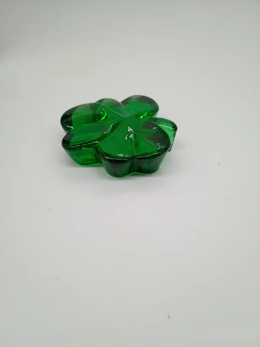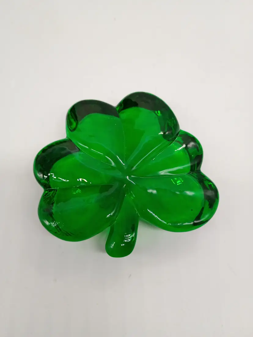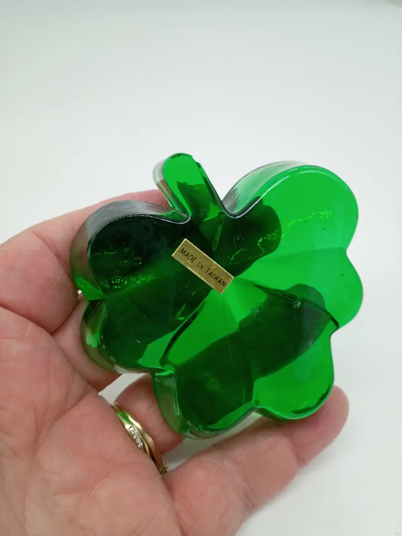 Emerald Green Shamrock Clover Art Glass Irish St Patrick Paperweight . Made by Roman Inc.in Taiwan Circa 1990's. This is 0.75 inches thick and about 3 inches in diameter. This is preowned, No cracks there is a tiny chip on bottom of stem on 1 side see last 2 photo. It is not visible when viewed from above and it's more of a flea bites or scrap then a true chip . You can feel a slight roughness easier then seeing it. Good usable displayable condition. Ships USPS domestically and UPS/ USPS International Shipping globally