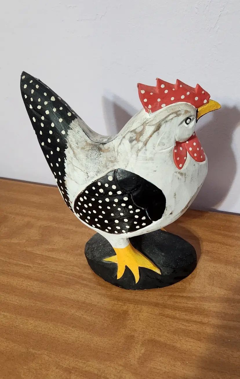 This guy was made to look a little shabby. I believe he is made of resin. He really wants to find a home where he might meet a nice hen. He stands approximately 10 1/2 inches tall and 7 3/4 long.