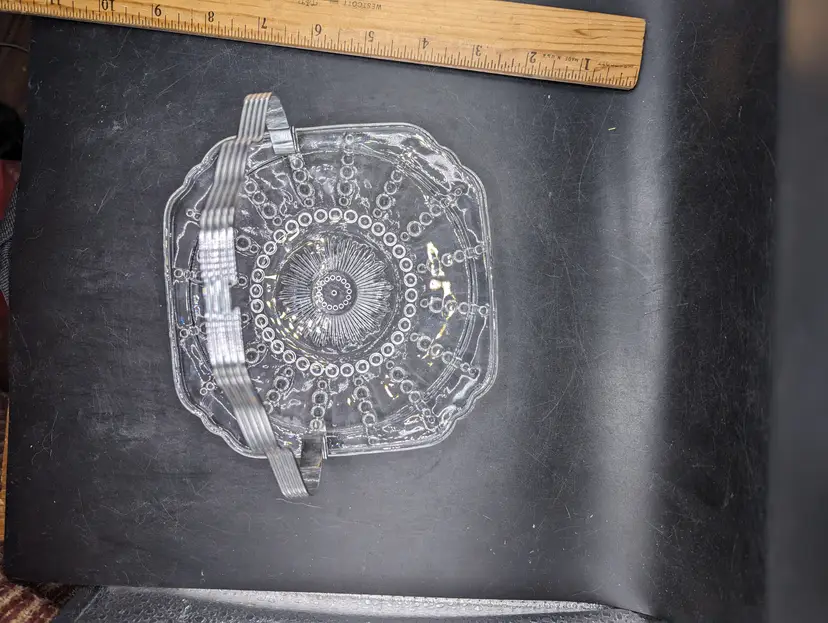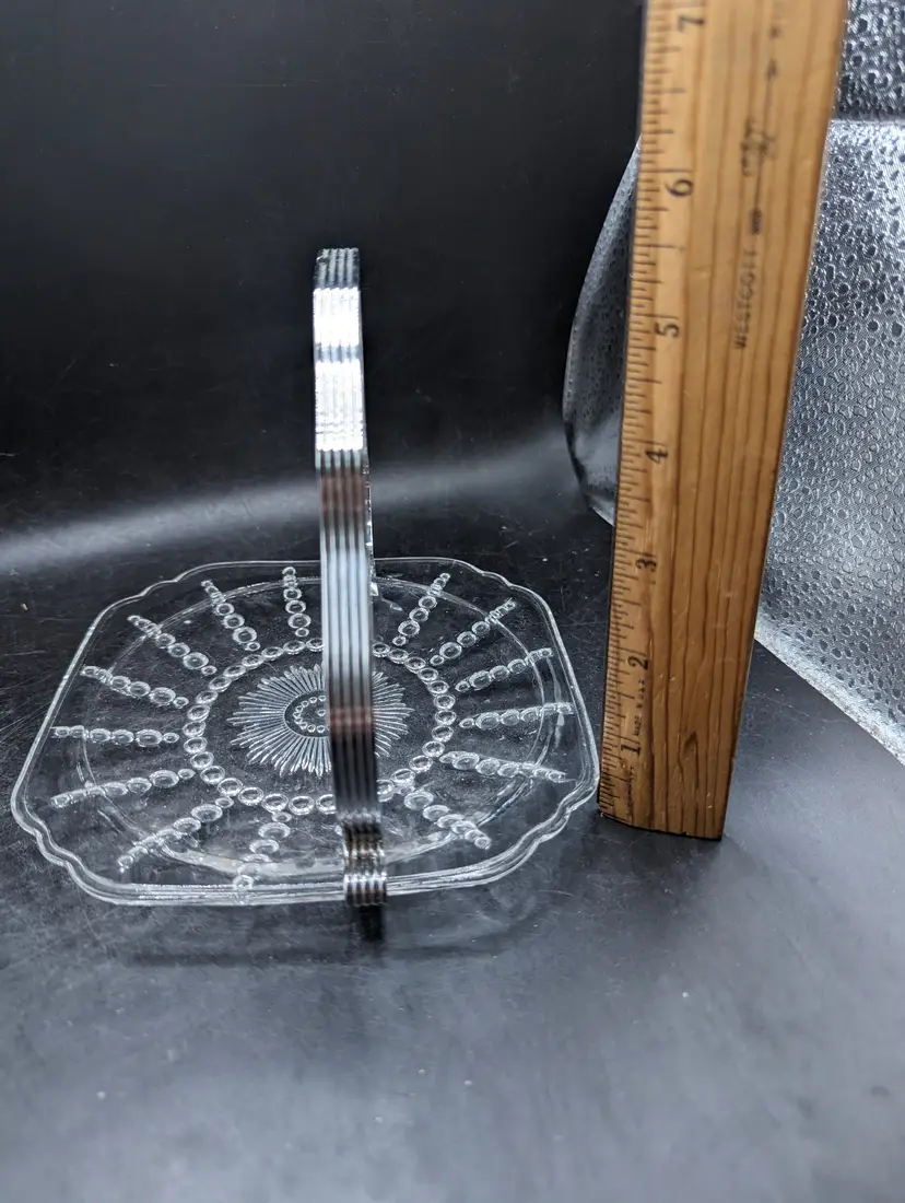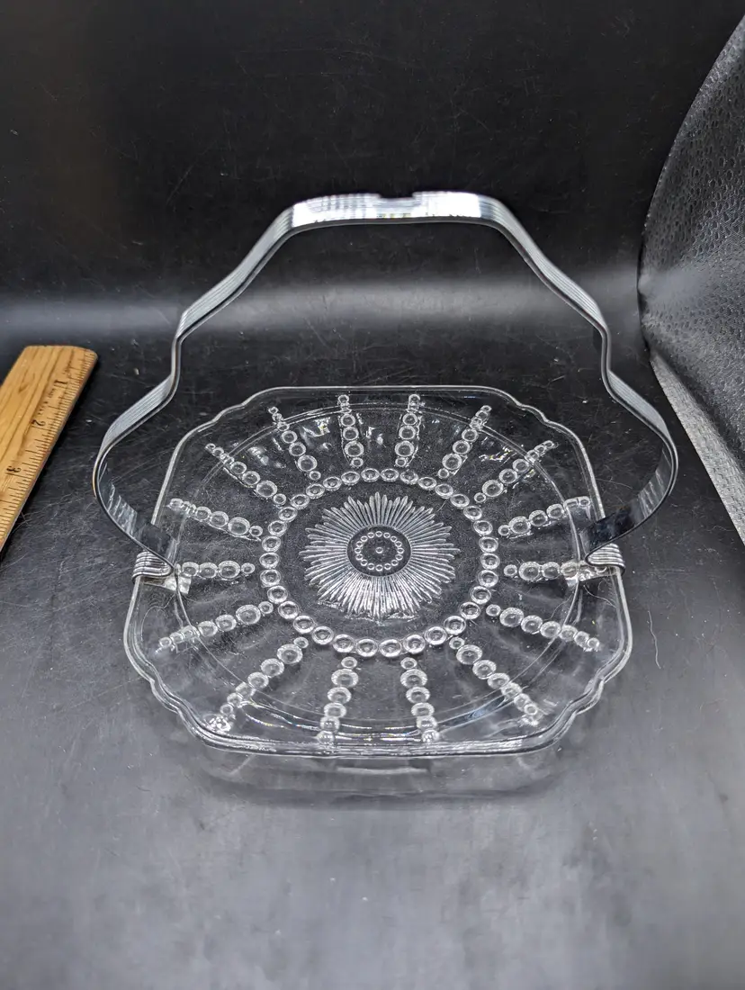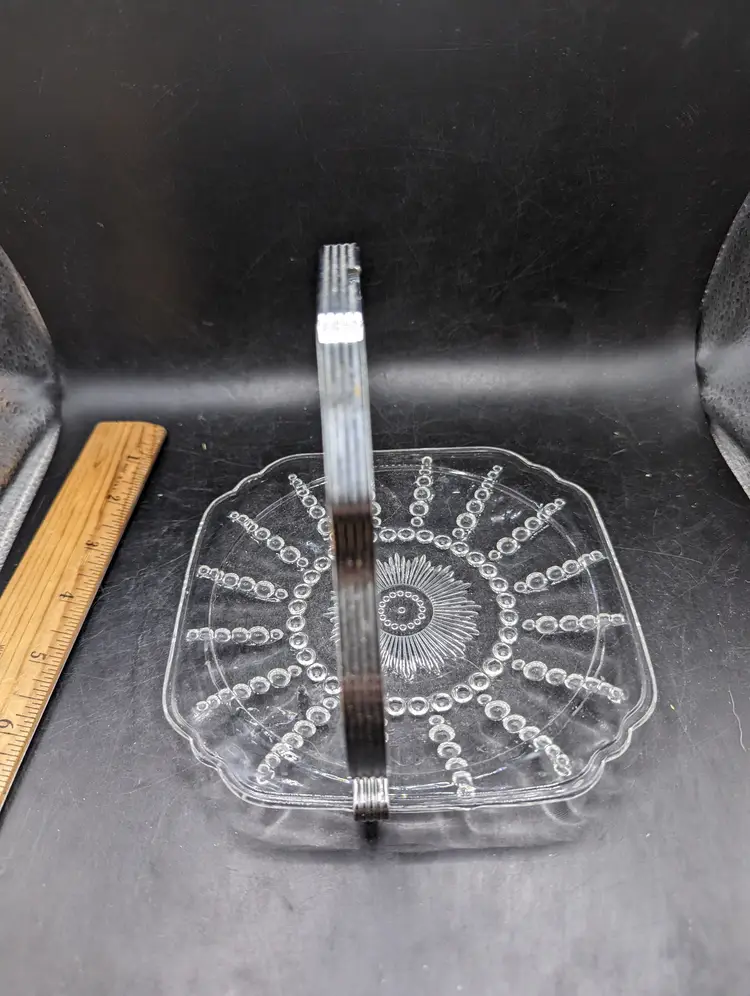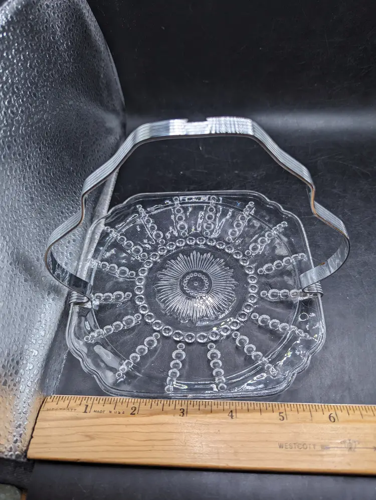 This is a lovely Federal Glass Columbia Clear Serving Dish from the Depression Era (1938-1942) with Metal Handle. It's made of clear glass and features a distinctive pattern of circles and bubbles. No chips or cracks. Please see all pictures for condition and measurements.