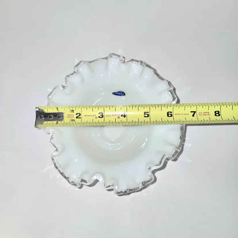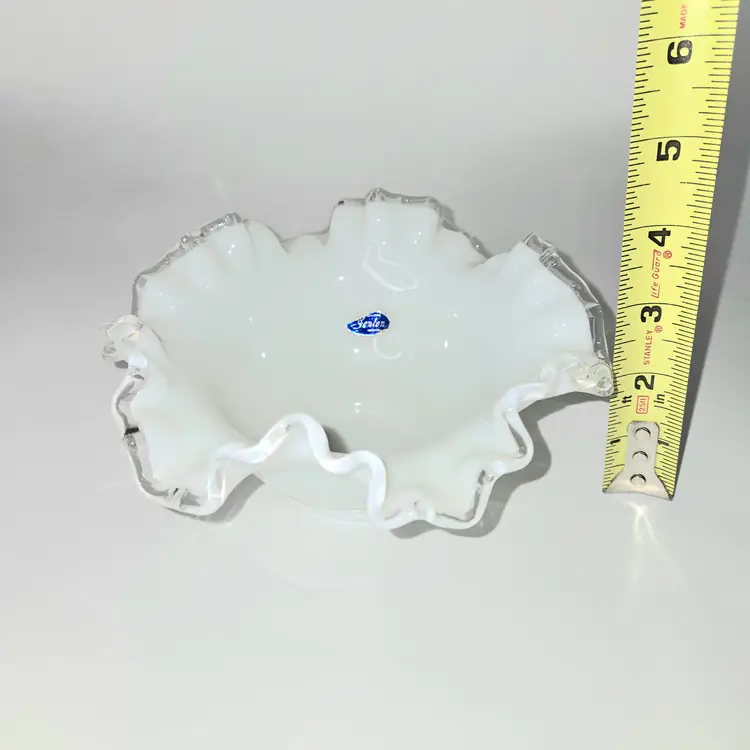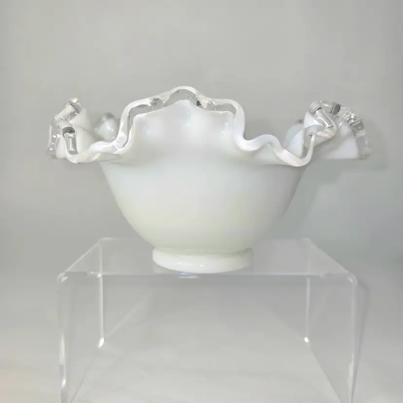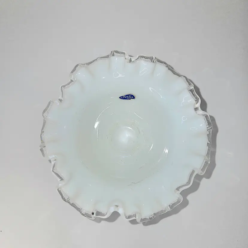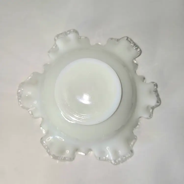 No chips, fleabites, cracks, or repairs. Pre 1970's. Has Fenton label. Silver crested milk glass.