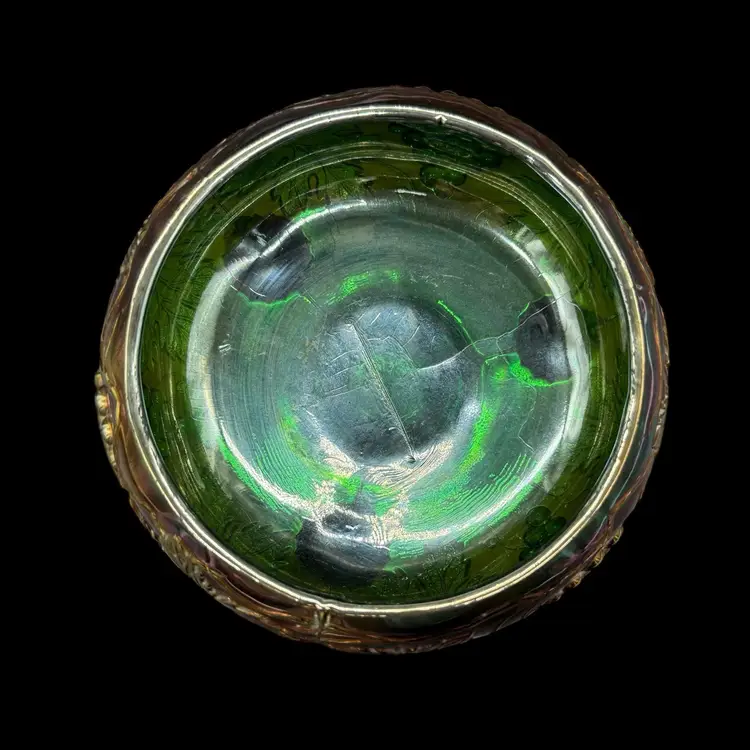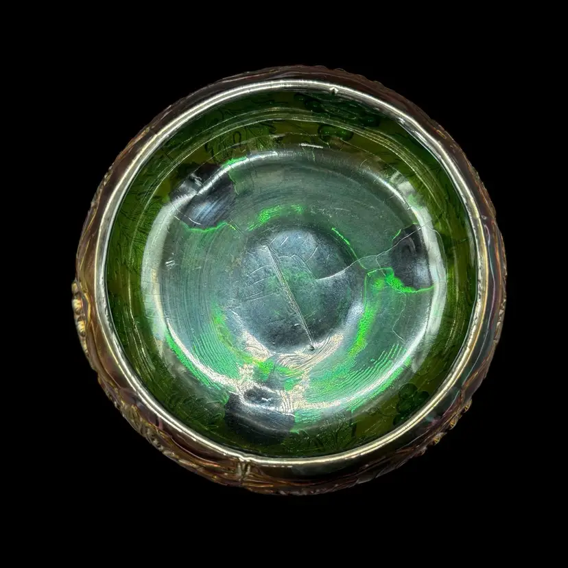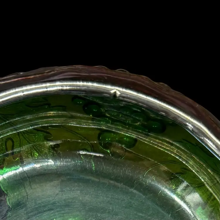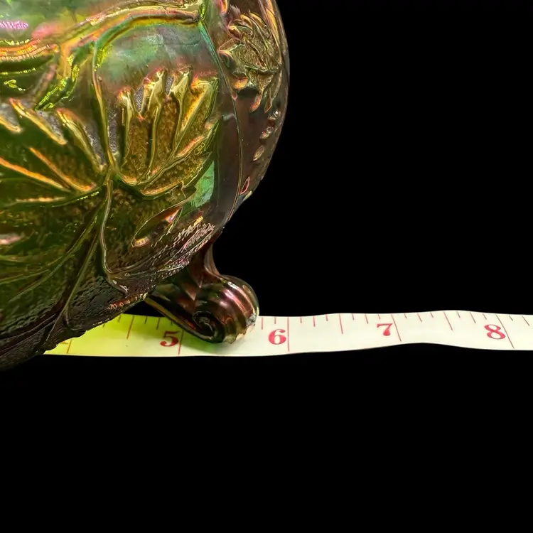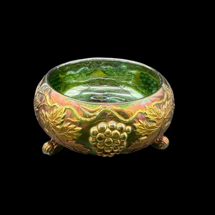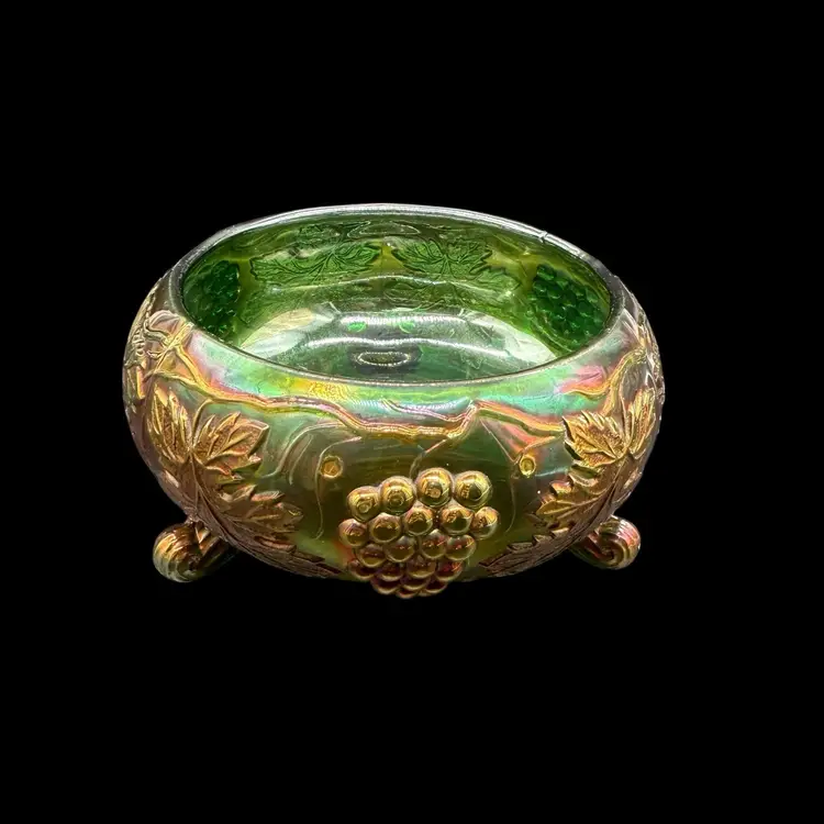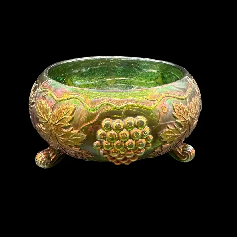 The Fenton Vintage Green Carnival Glass 3 Footed Fernery Bowl is a beautiful antique piece from the early 1900s. Made in North America, this vintage bowl features intricate designs of grapes and leaves in an art nouveau style. Crafted from pressed glass, this unique fernery bowl is adorned with an iridescent finish, making it a decorative and striking addition to any collection of antique glassware.