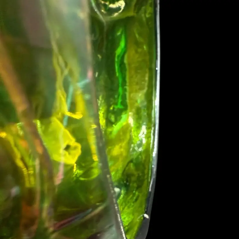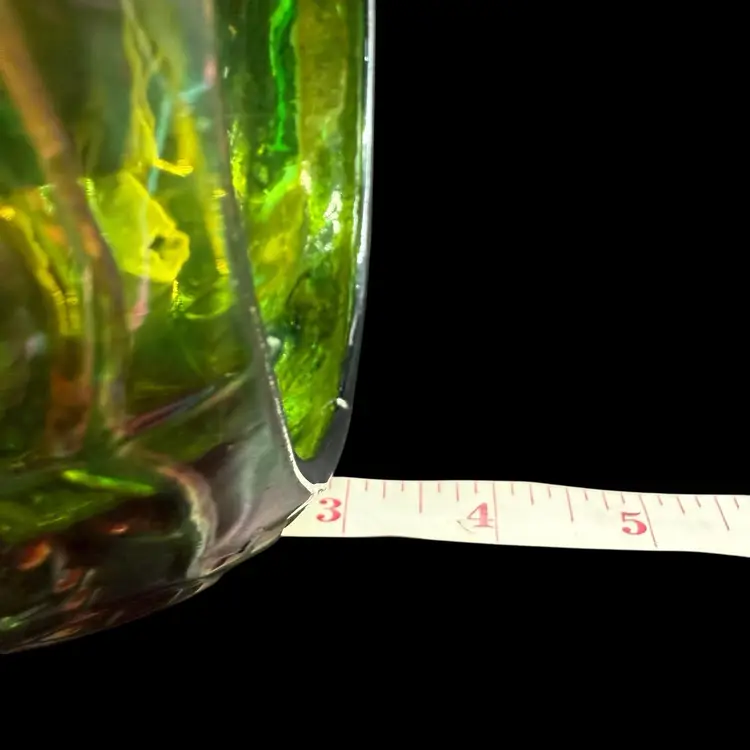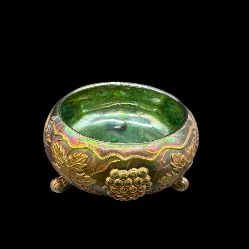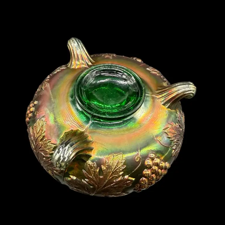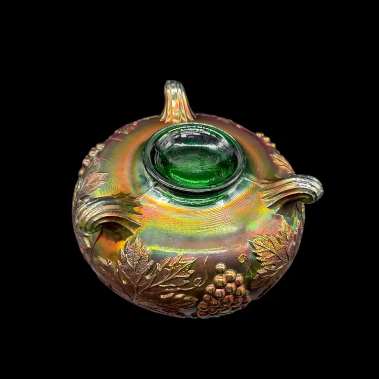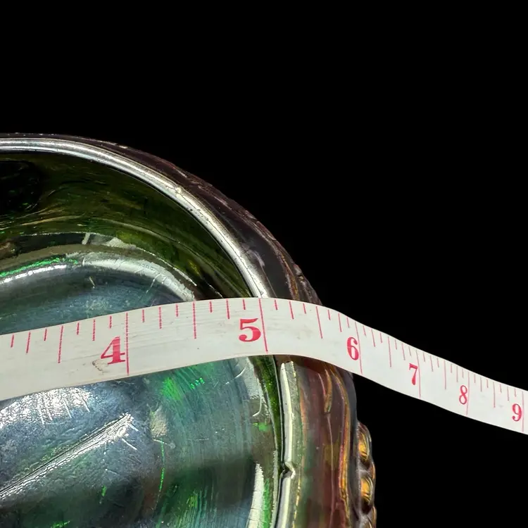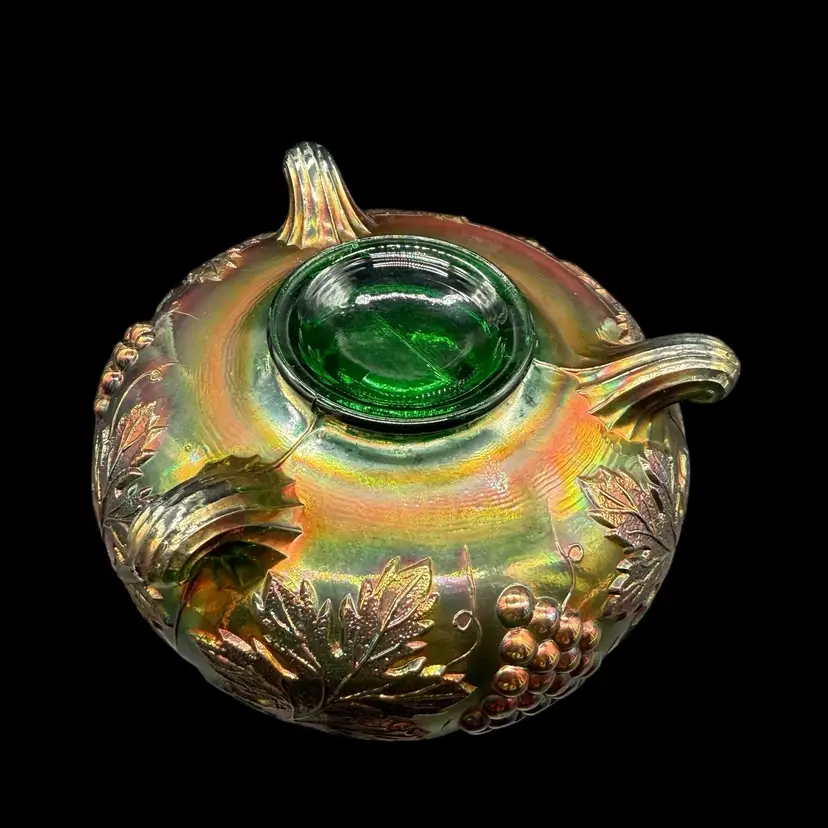 The Fenton Vintage Green Carnival Glass 3 Footed Fernery Bowl is a beautiful antique piece from the early 1900s. Made in North America, this vintage bowl features intricate designs of grapes and leaves in an art nouveau style. Crafted from pressed glass, this unique fernery bowl is adorned with an iridescent finish, making it a decorative and striking addition to any collection of antique glassware.