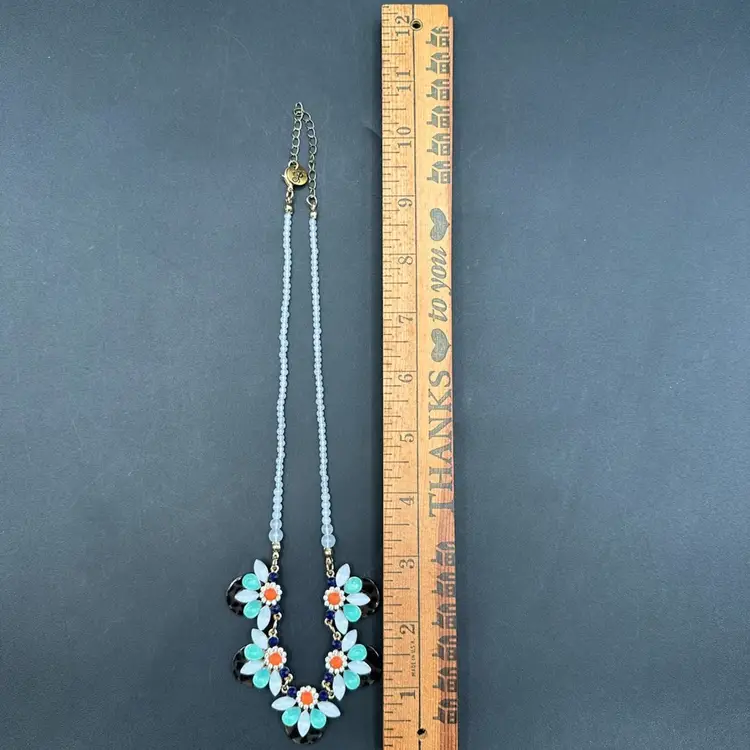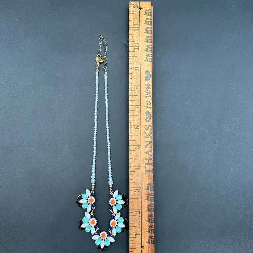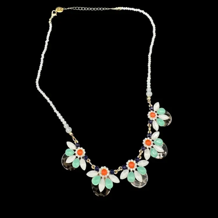 This is a Plunder Design statement bib necklace featuring pastel flower-shaped pendants with white, peach, and green faux gems, set in a gold-tone metal with a white beaded chain. Excellent condition.