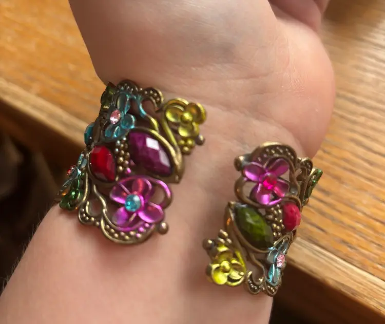 Elegant floral bracelet featuring vibrant multicolored stones. Perfect for adding a pop of color to any outfit. Does not clasp closed, but is still wearable. Fits a 6” - 7” wrist.