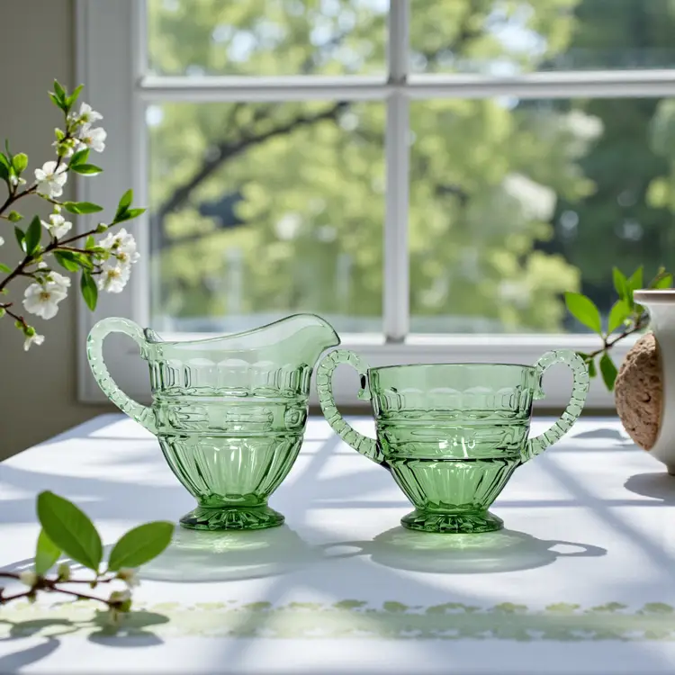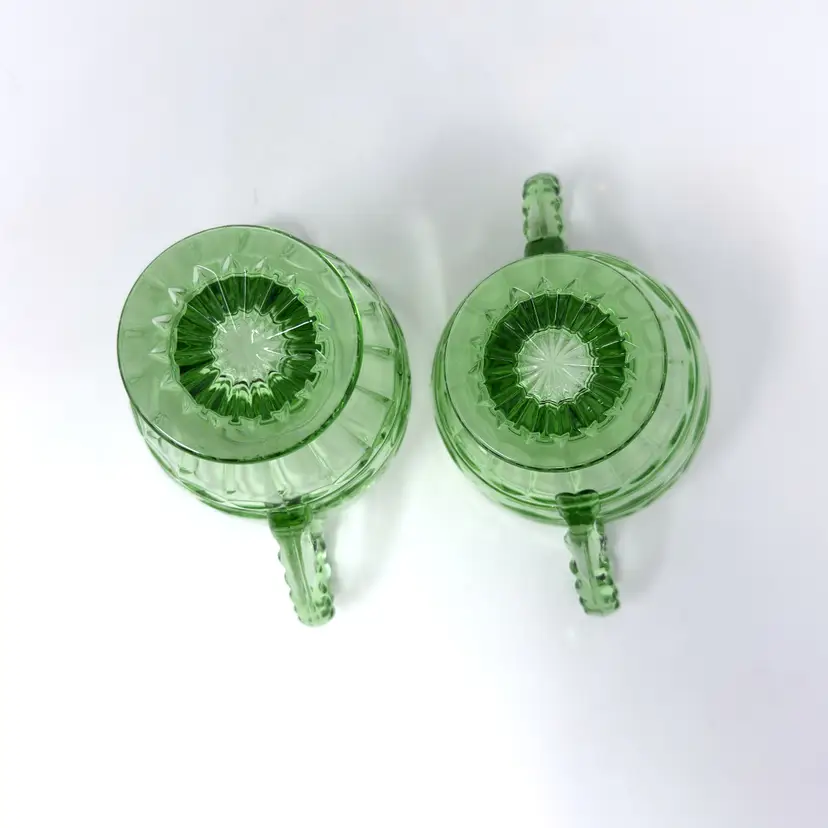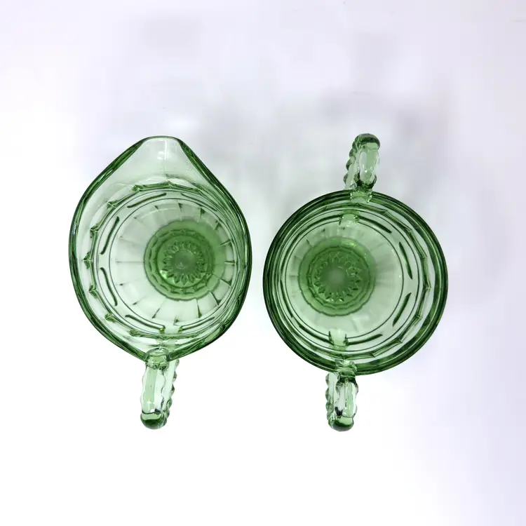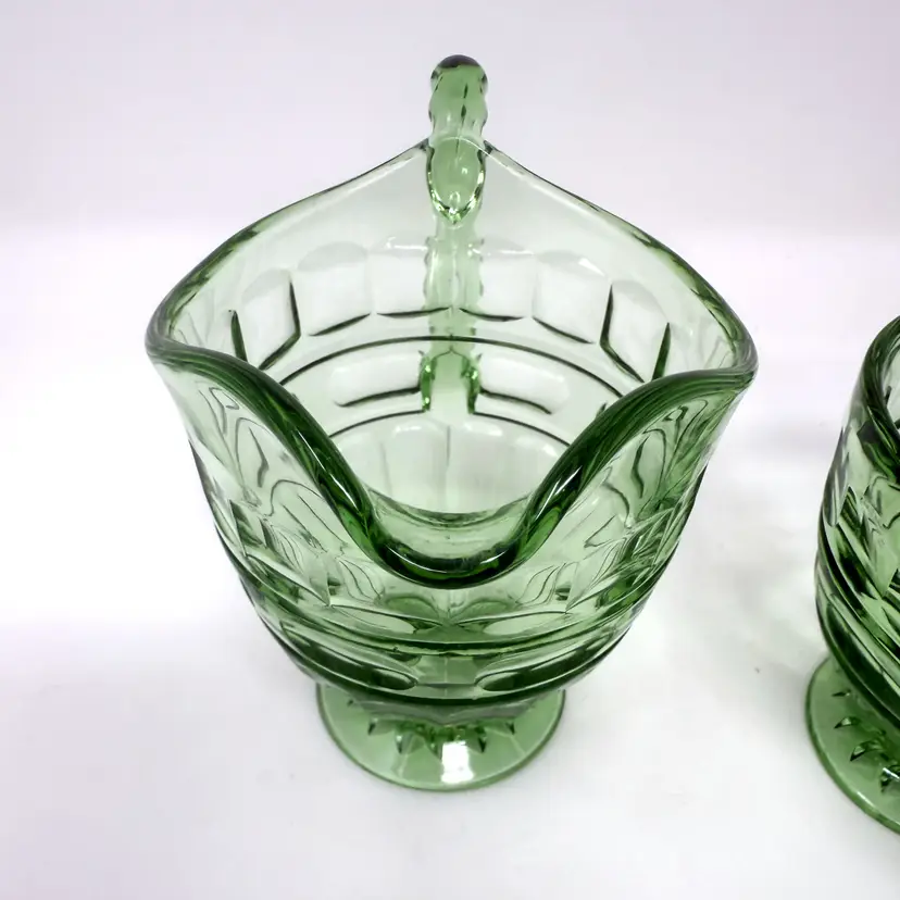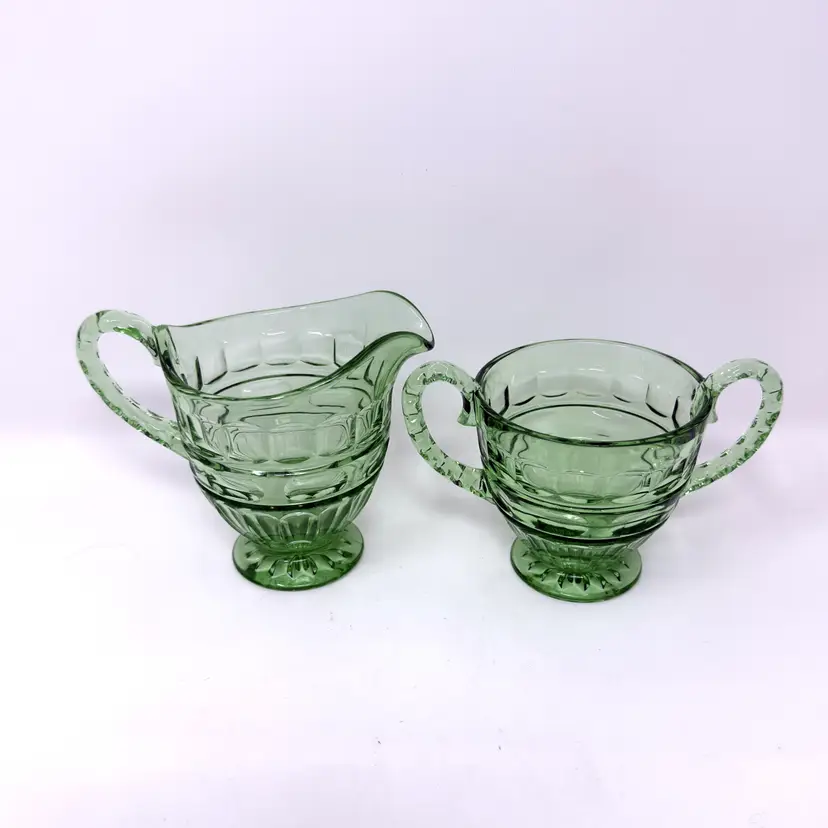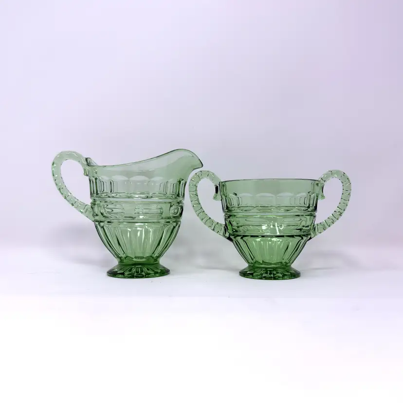 Add a glowing splash of vintage charm to your breakfast table with this 1930s Fostoria Hermitage cream and sugar set in vivid green uranium glass. Crafted in the Depression-era No. 2412 Hermitage pattern, these pieces feature bold Art Deco fluting, radiant green clarity, and classic looped handles with pressed ribbing.