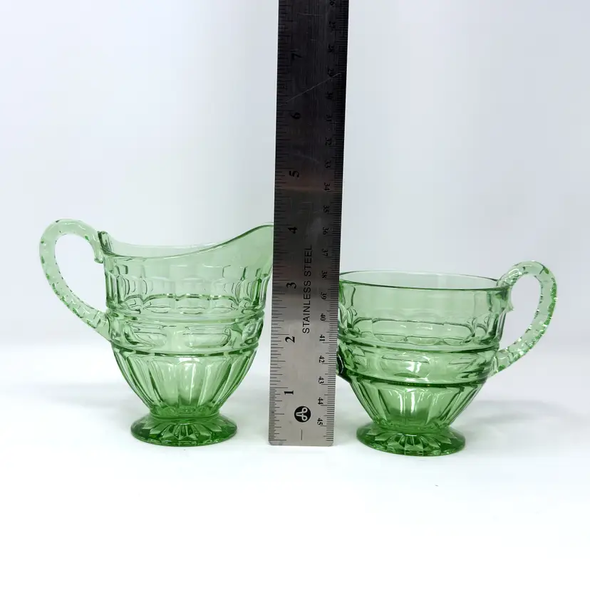 Details • Maker: Fostoria Glass Co. (unmarked) • Pattern: Hermitage (No. 2412) • Date: Circa 1930–1938 • Style: Art Deco / Depression Glass • Material: Pressed uranium glass • Color: Green (glows under UV) • Total Weight: 1 lb 1 oz • Measurements: Creamer - Height: 4.25", Width (handle to spout): 5", Depth: 3", Sugar Bowl - Height: 3.5", Width (handle to handle): 5.5", Diameter (top): 3.25" • Condition: Excellent vintage condition — no chips, cracks, hairlines, or repairs. Glows strongly under UV light. Light expected signs of age but no damage