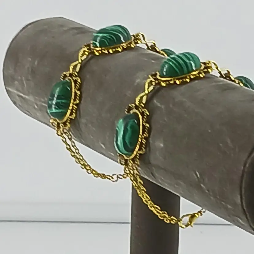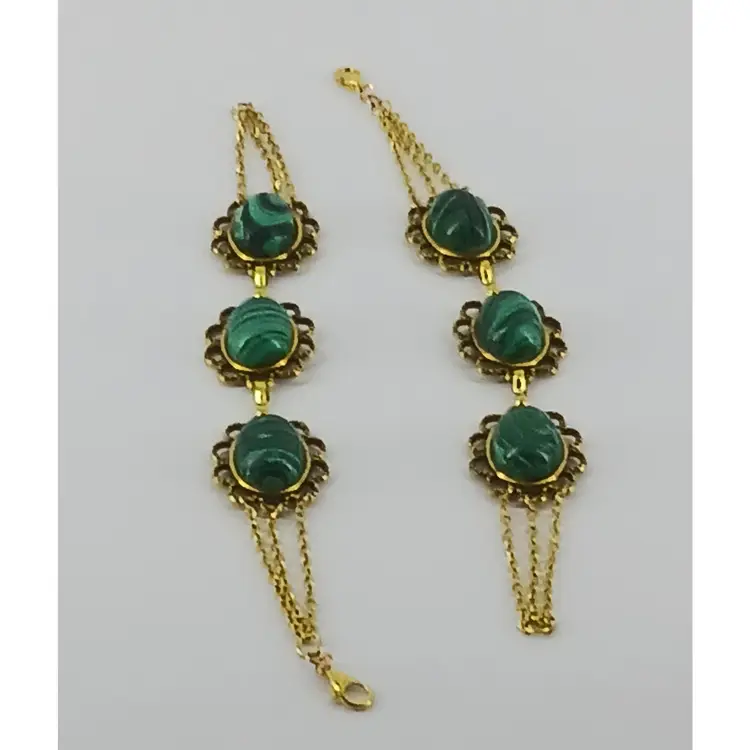 Qty 2 - BM423 – Three Malachite gem stones that measures 3/4x1/2 x 5/16 inches have been mounted into antique gold plated opened back cabochon settings that measures 1 x 7/8 inches and these have been linked together. Three strands of gold plated chain finish off this 7 1/2 inch bracelet.
