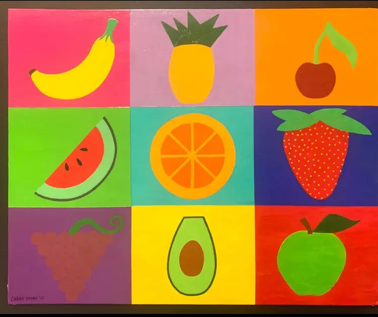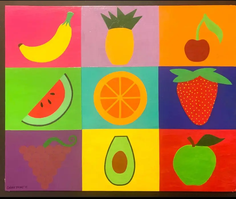 -"Cute Fruit" by Candace Bryant, 2025. -Framed with a plexiglass cover. -There is a hook on the back for wall hanging. -Acrylic paint on canvas board with satin gloss varnish. -16x20" -Signed on bottom left corner