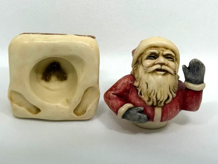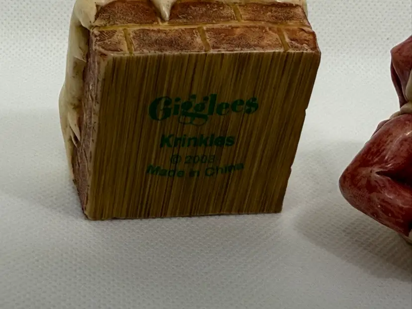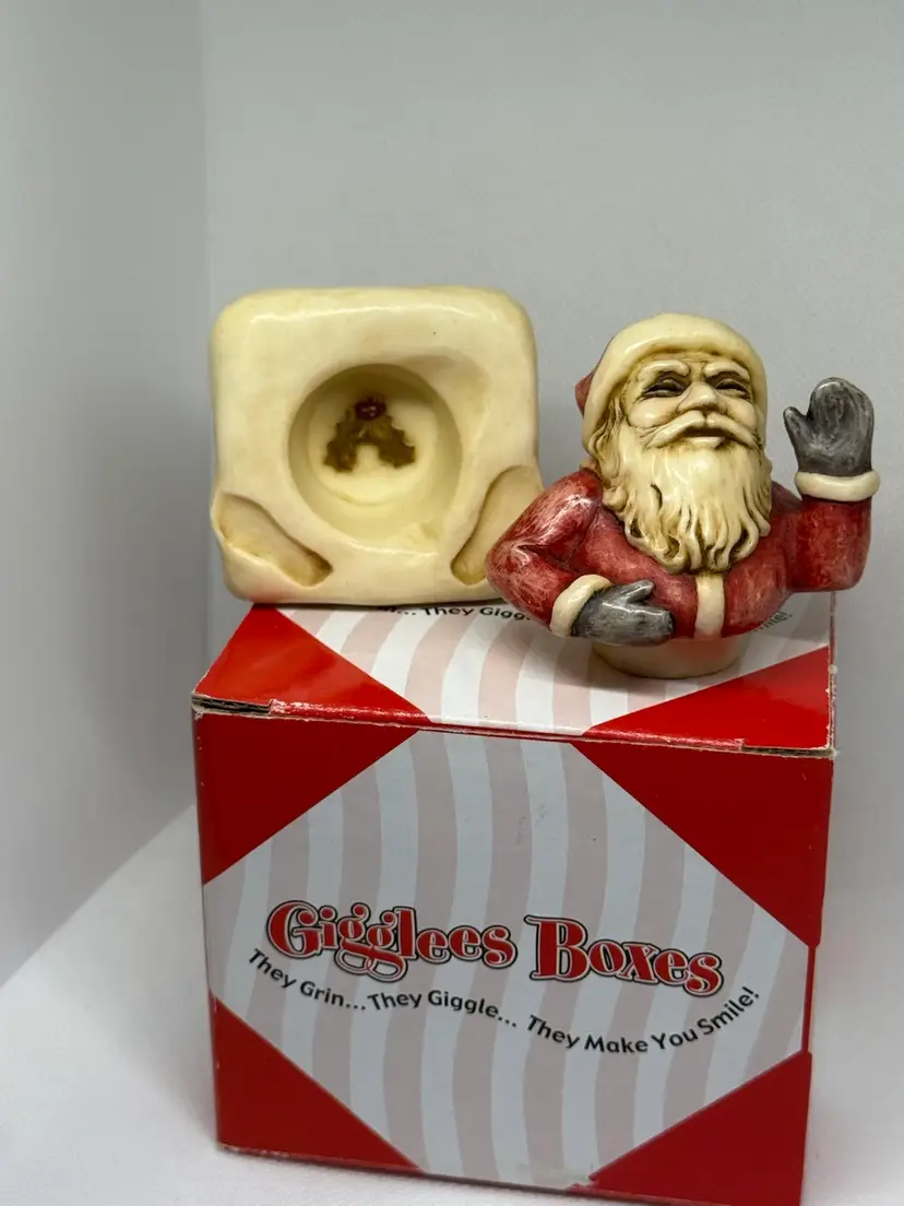 Hand-painted resin design with the signature whimsical Gigglees style. “Kringles” Santa figurine with a hidden trinket compartment with a holly design inside.Includes the original display box.. No chips or cracks noted.