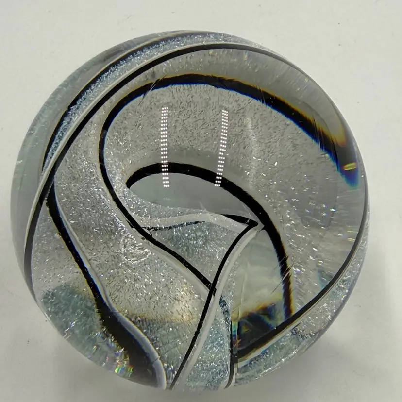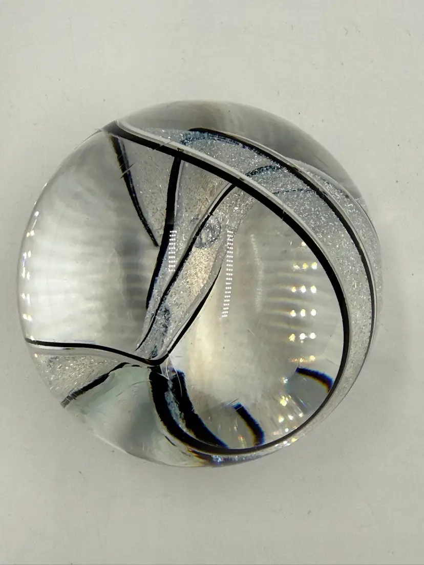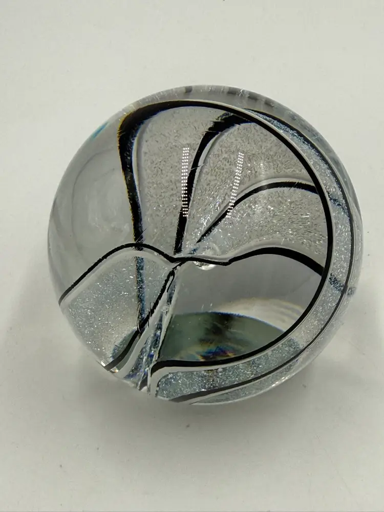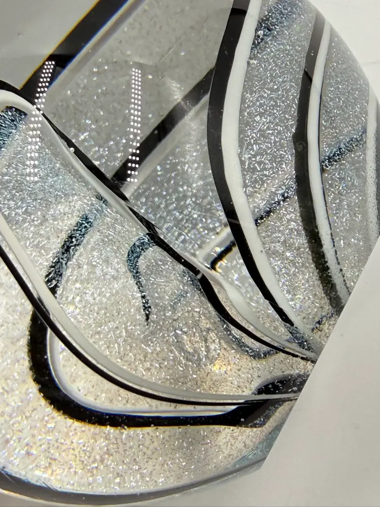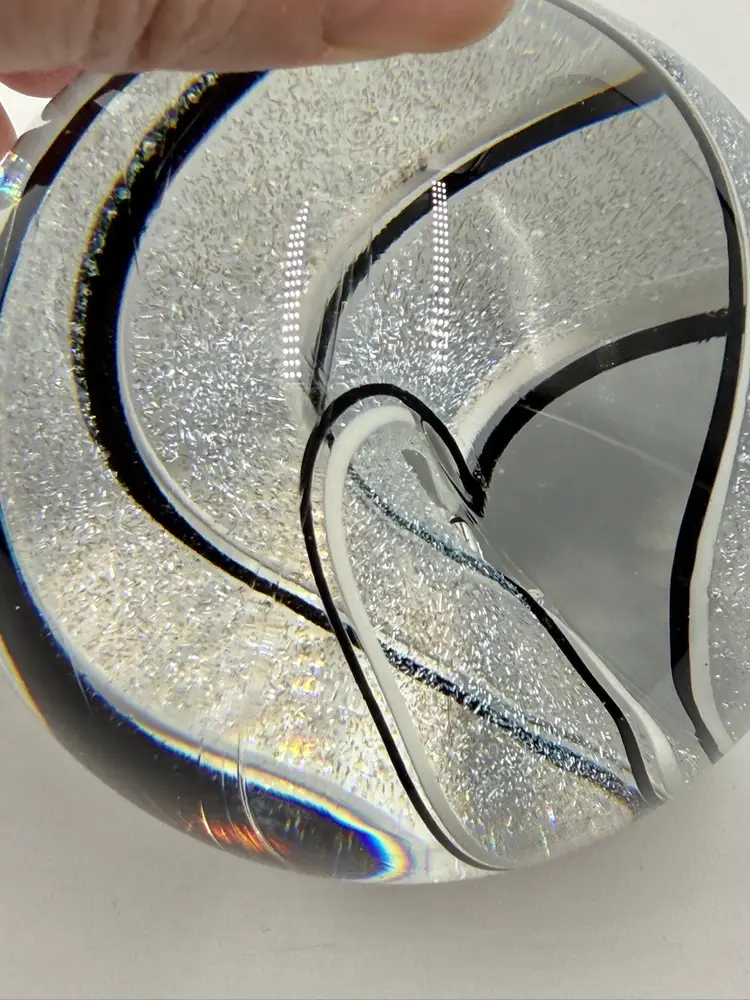 Clear glass paperweight with black and white ribbons with dichroic sparkle. In good condition. Does not have any chips or cracks. Measures 3 inches tall and 3 inches in diameter.