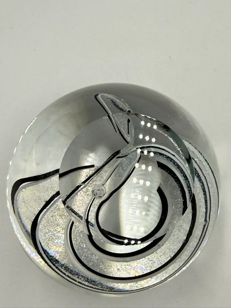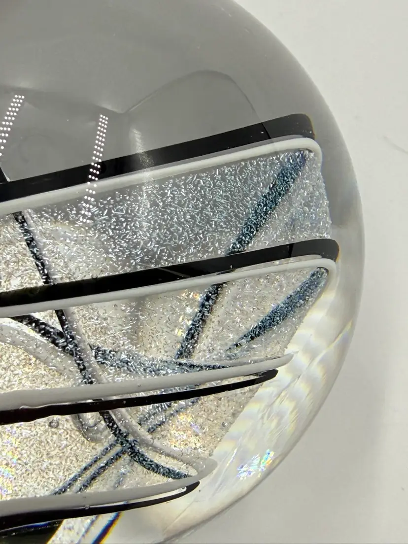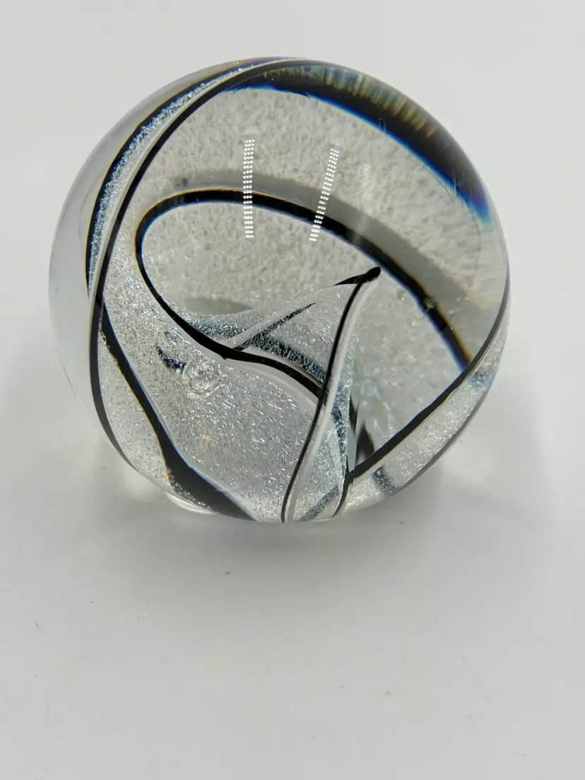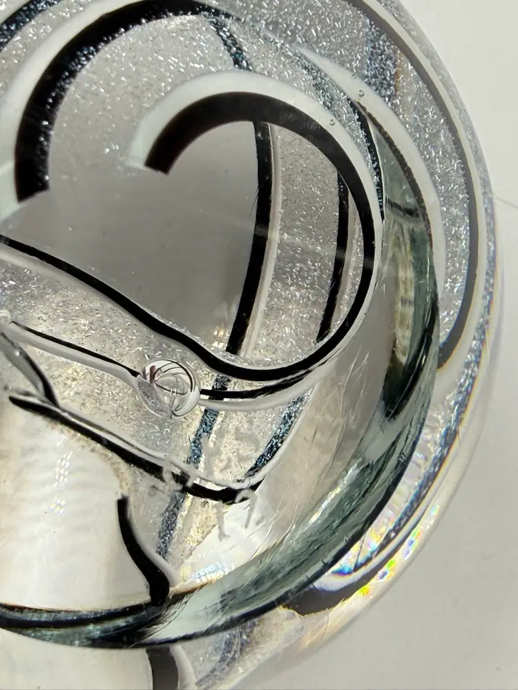 Clear glass paperweight with black and white ribbons with dichroic sparkle. In good condition. Does not have any chips or cracks. Measures 3 inches tall and 3 inches in diameter.