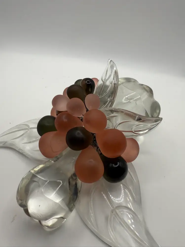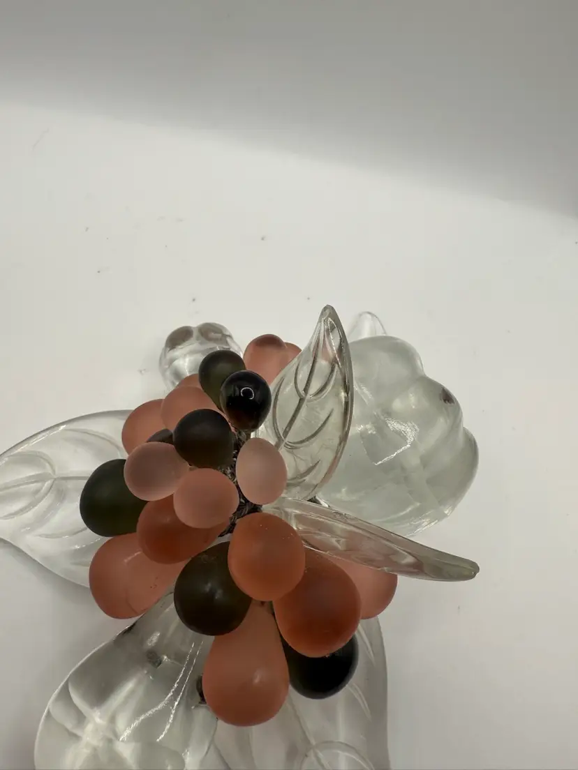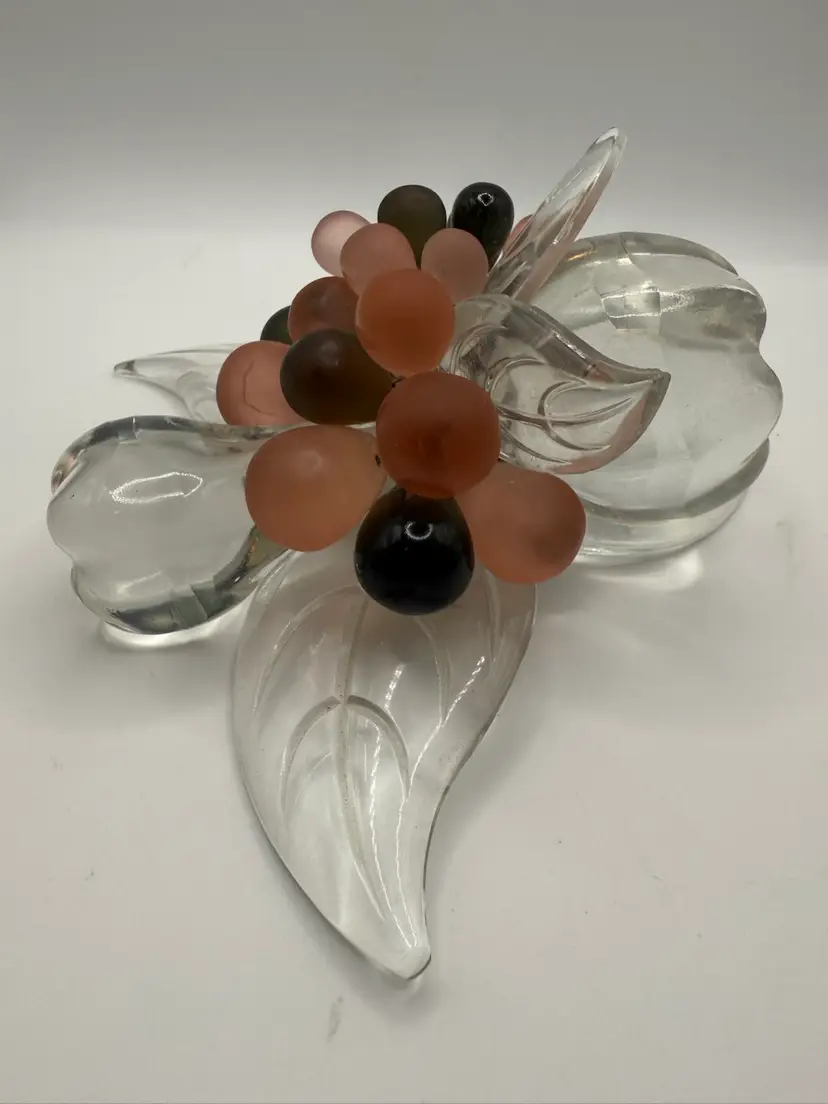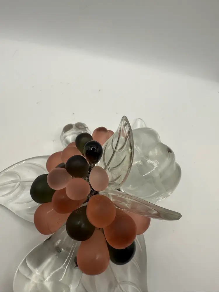 I believe these were once part of a lighted basket. You plugged the basket in and the glow came through the fruit. Apple, leaves, pears and grapes. The grape cluster is a really pretty pink and purple satin finish. The leaves and fruit is clear.