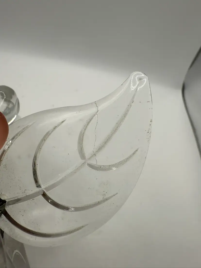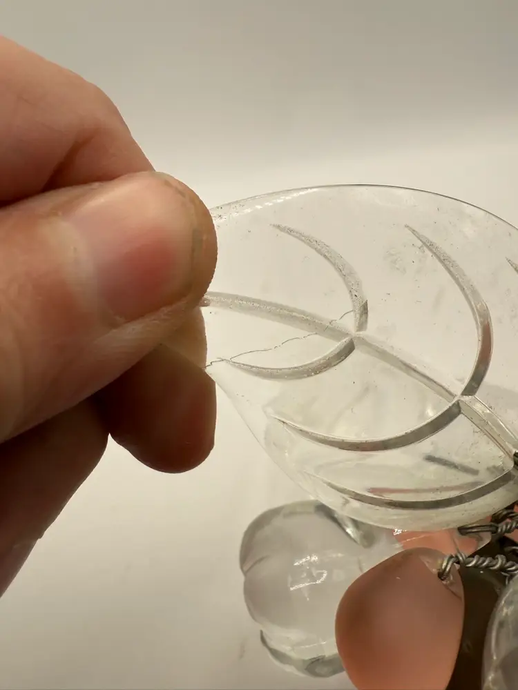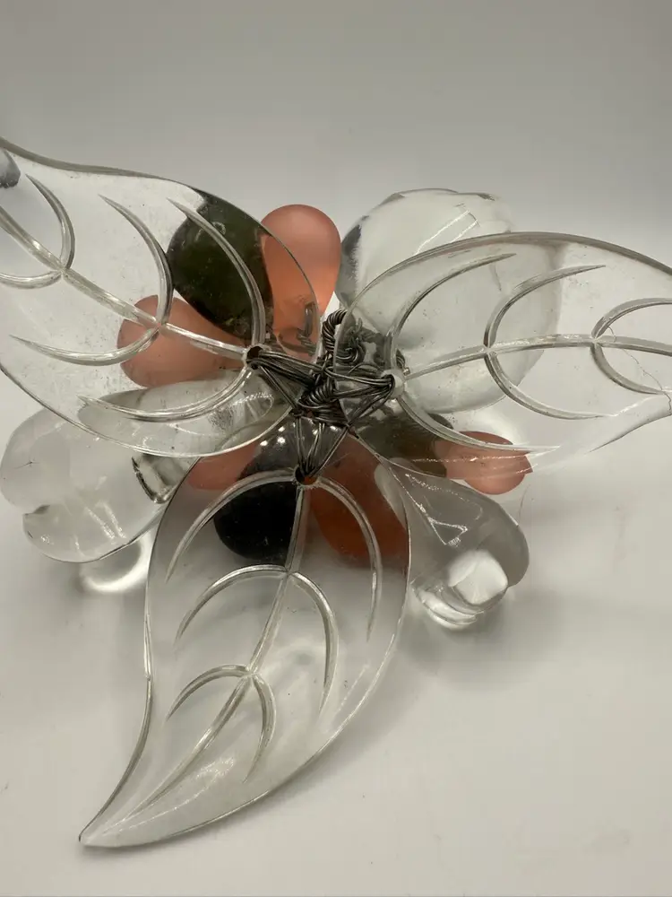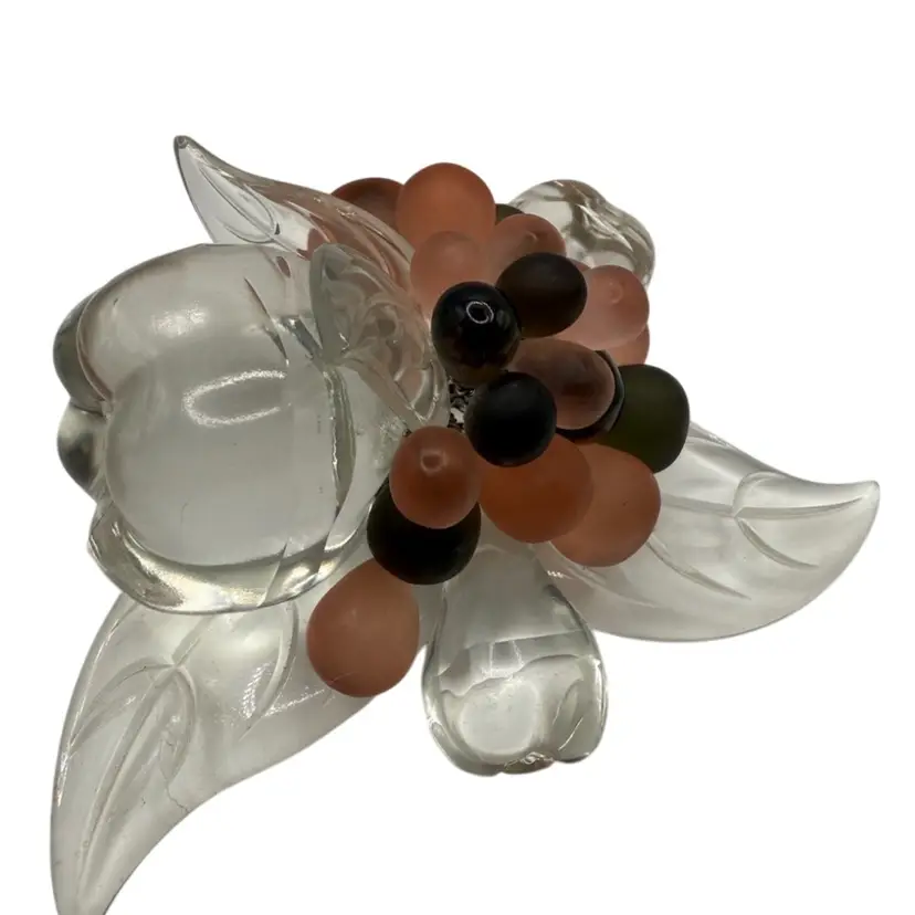 I believe these were once part of a lighted basket. You plugged the basket in and the glow came through the fruit. Apple, leaves, pears and grapes. The grape cluster is a really pretty pink and purple satin finish. The leaves and fruit is clear.