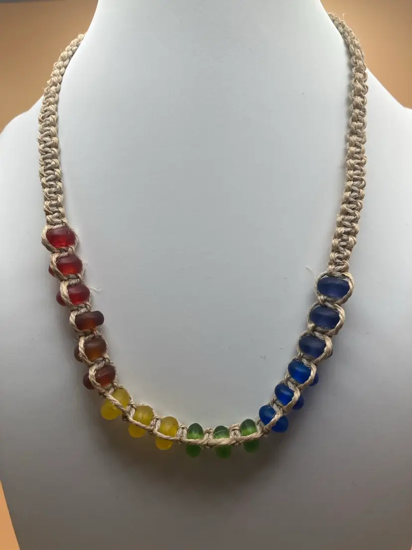 Handmade hemp necklace features a rainbow of glass beads strung along the middle front of the piece. Each bead is made of sturdy, satin finish glass. Necklace features a bead and loop toggle style closure. Necklace measures 18 inches.