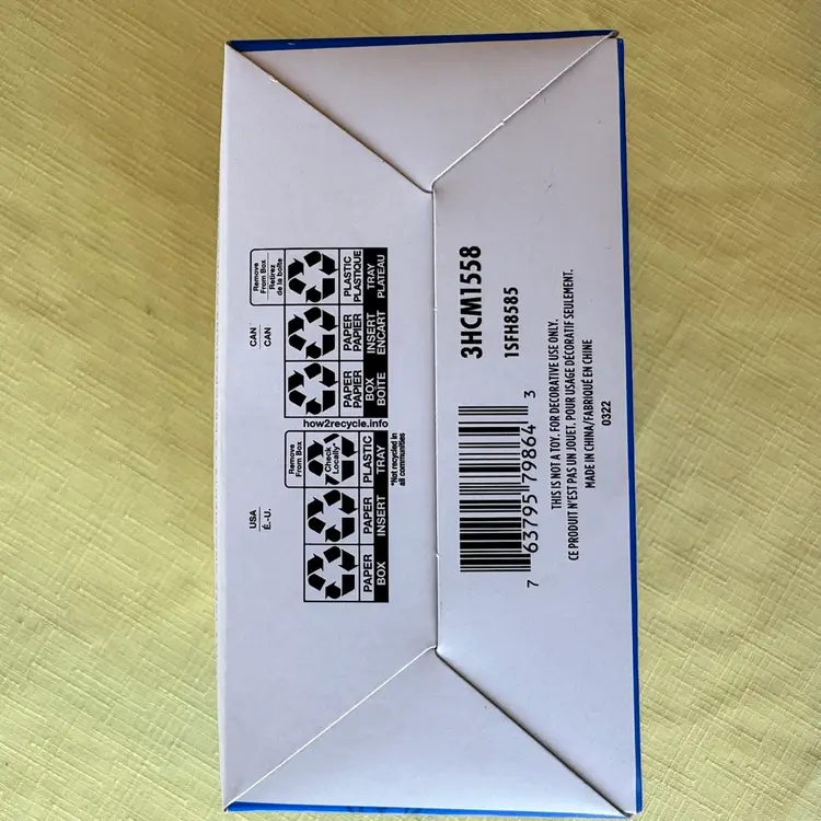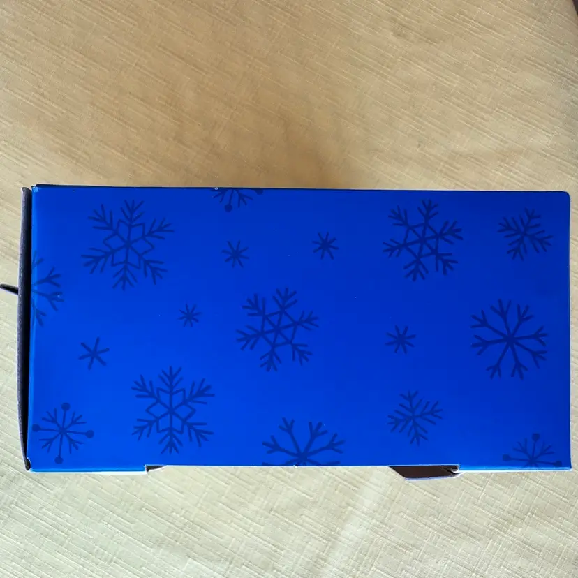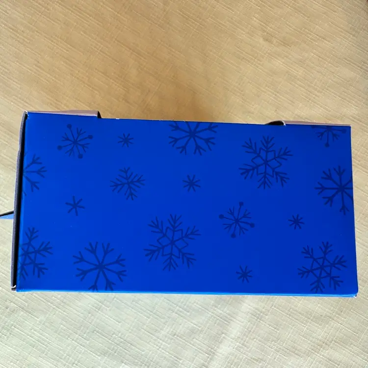 Bright, colorful holiday box with blue snowflake pattern on all sides.