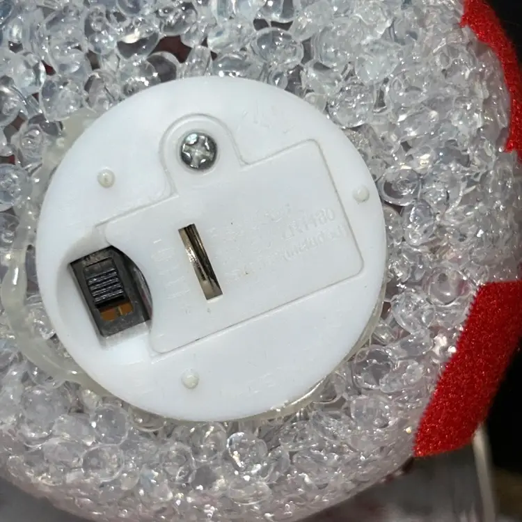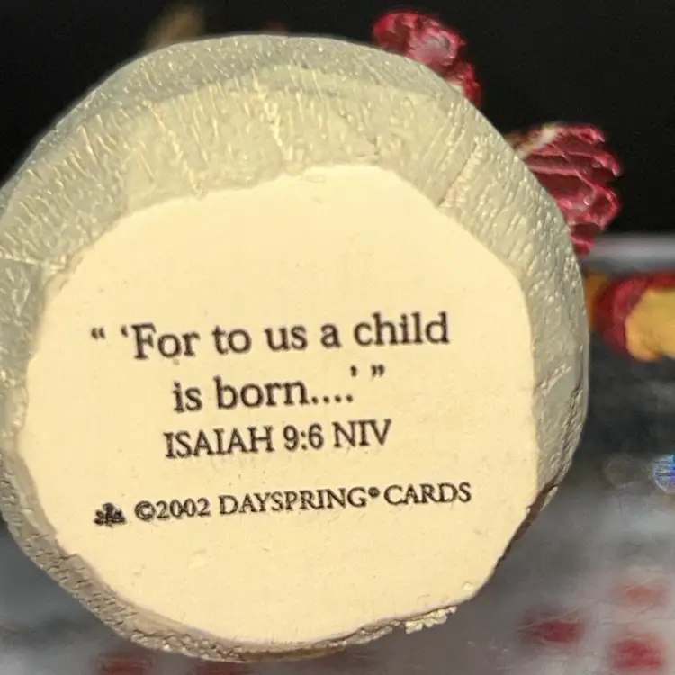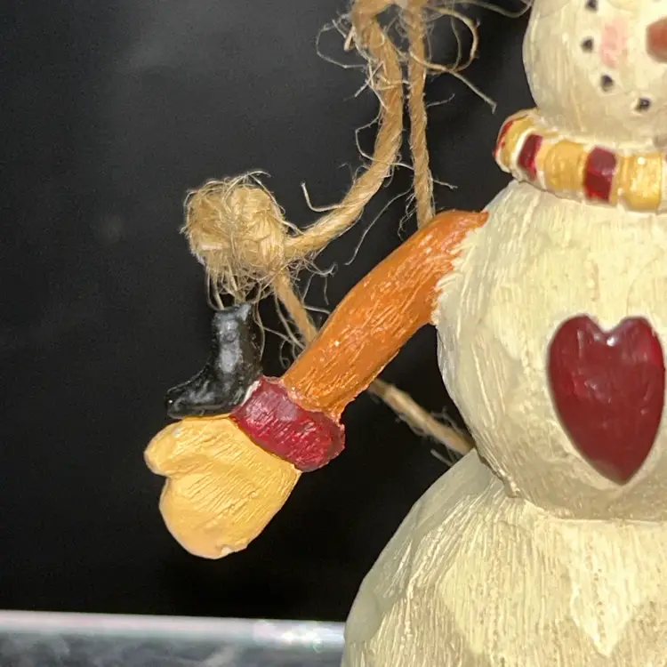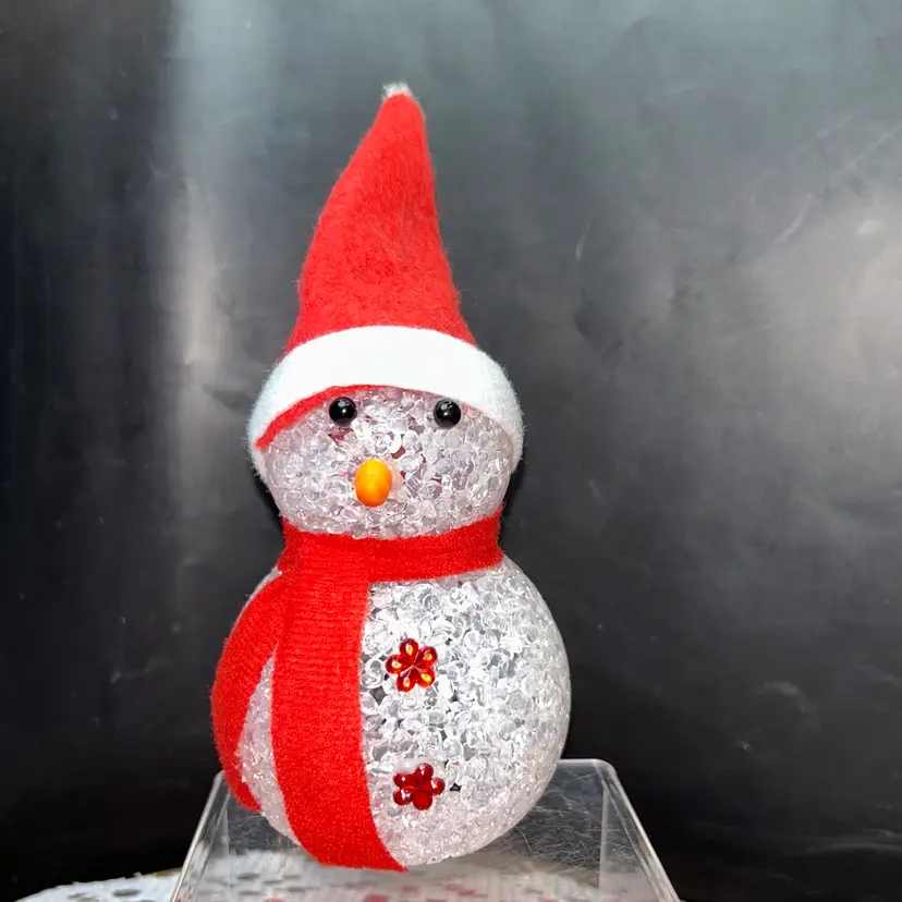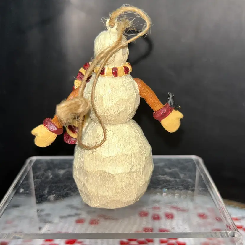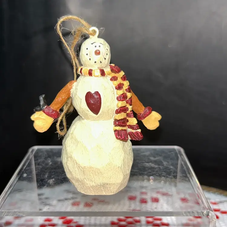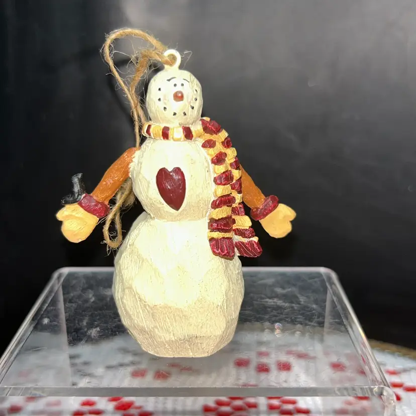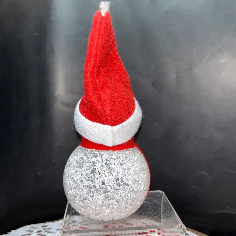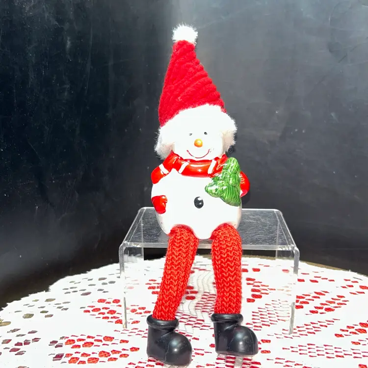 Ceramic shelf-sitter with knit legs and fleece hat. Body is 5 inches tall from bottom to top of hat. The legs add an additional 2.5” and hang over shelf. Ornament snowman, with bird and scarf, has string for hanging. It is 3.25” tall, and 2.25” in diameter across bottom. Made by Dayspring Cards, 2002. Verse on bottom is” For to us is born. . . “ Isaiah 9:6 NIV. Large melted plastic snow man is battery operated. It takes3 1.5V (LT 1130) batteries. It is 7.75” tall to top of hat. It is 3.25” in diameter at widest. All three snowmen are in excellent condition.