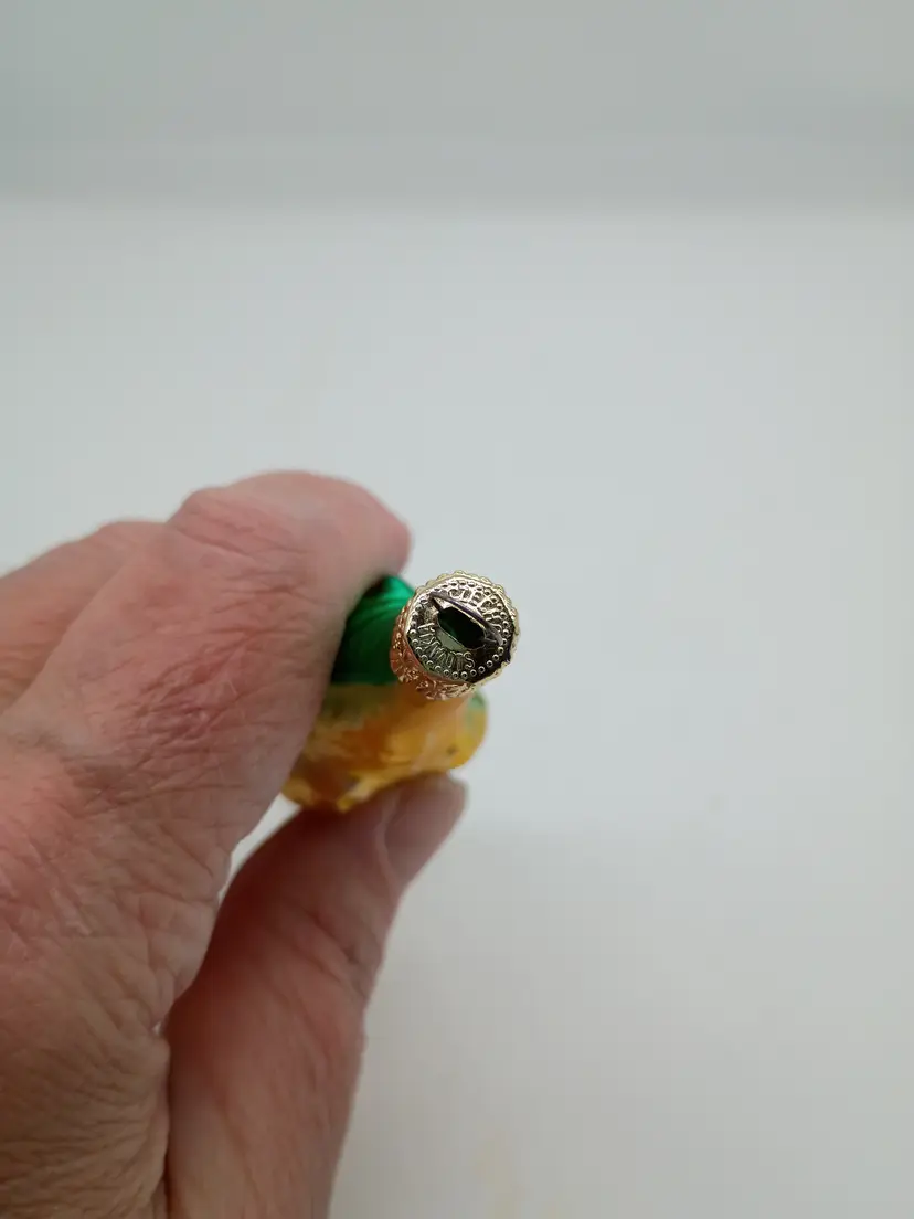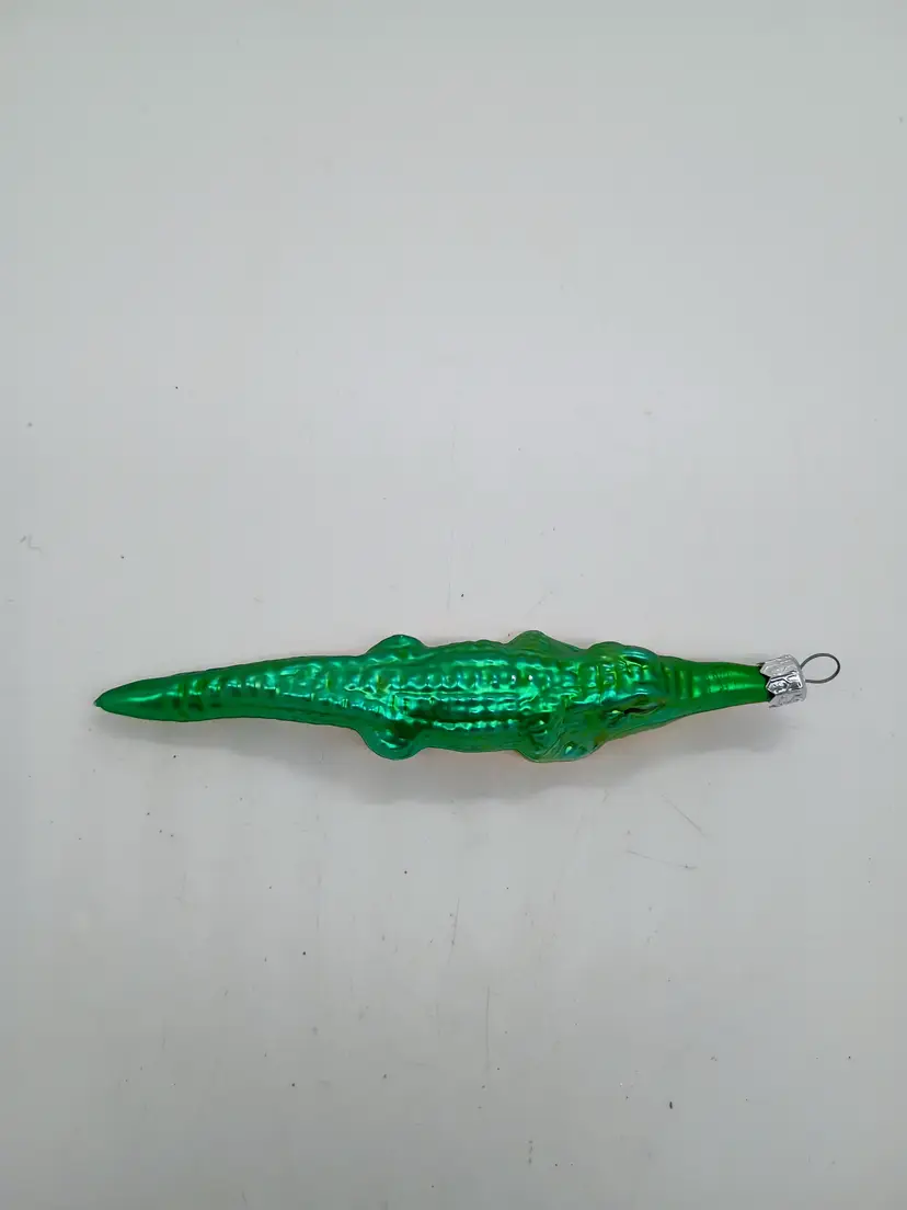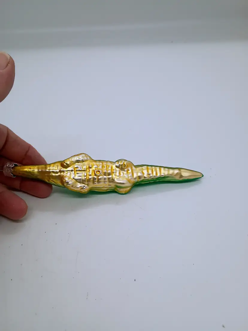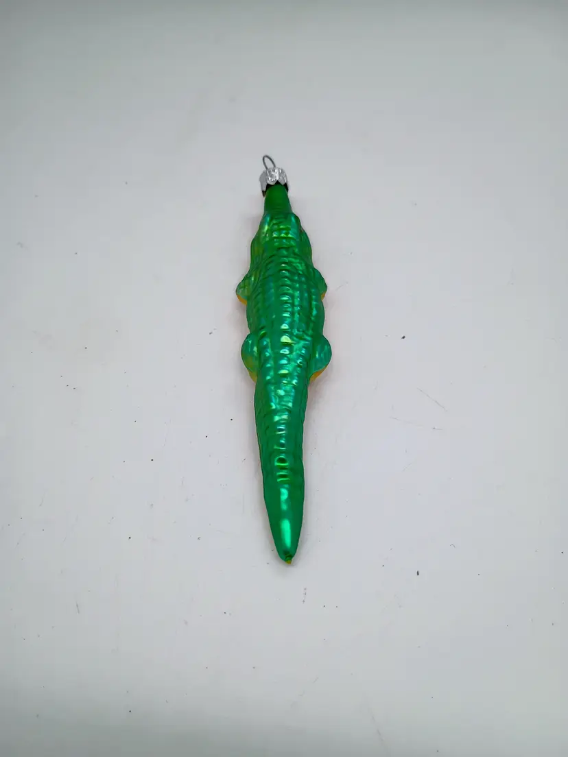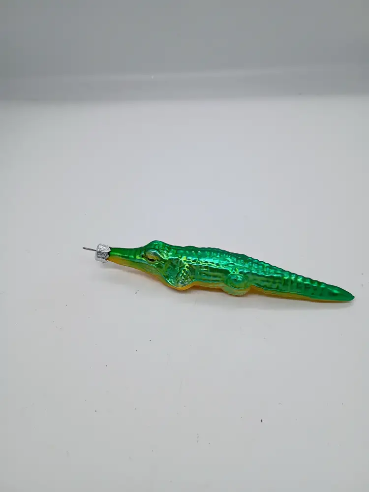 Hand Blown Mercury Glass Alligator Christmas Ornament Choose Polish or Czech made. Nose to tail is 6 inches belly to back 1 inch and side to side 1 in. Green tones on top and yellow on bottom. This is preowned. These are Kurt Adler brand. During the 1990's for a time he had factories in both Czechia/ Slovakia and in Poland. Multiple factories made the same ornaments. These are the exact same ornaments just crowned them with crowns stamped with the country of origin ( I have 1 marked Poland 1 marked Slovakia / Czechia). Each is sold individually the crowned with silver metal marked Poland other crowned with gold metal marked Czechia/ Slovakia. Both are undamaged with hangers and crowns intact. No color loss no chips cracks or flea bites. Excellent preowned condition. If you want a specific colored crown message me when buying and tell me which color crown you want . Ships USPS domestically and UPS/ USPS International Shipping globally