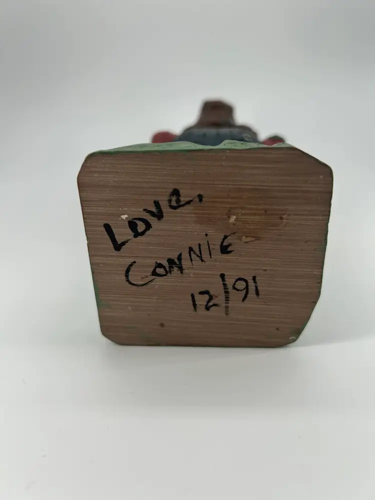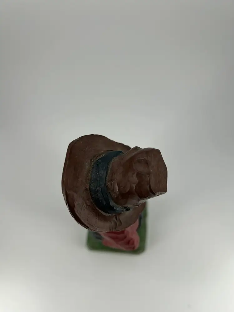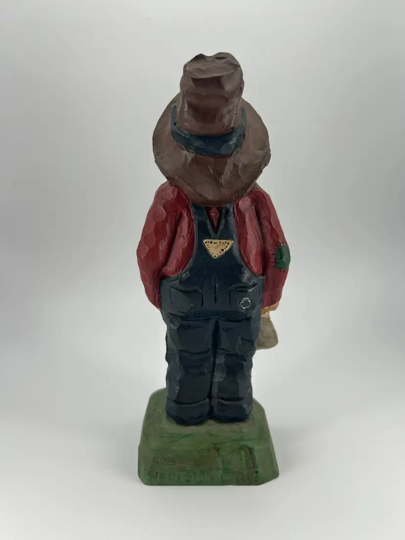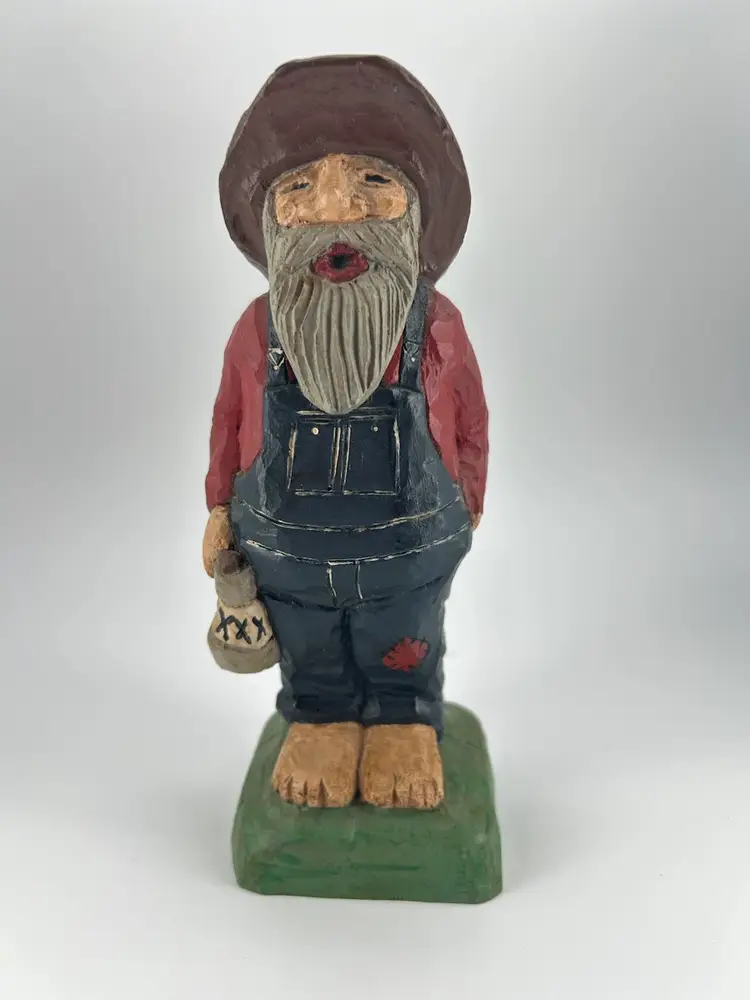 This is a piece of folk art depicting a barefooted man holding a jug marked XXX. It is hand carved from wood There is no damage on this piece. It has been personalized on the bottom, It stands 7.5 inches tall