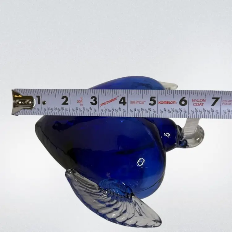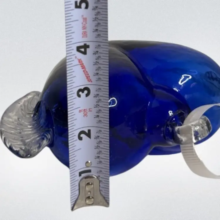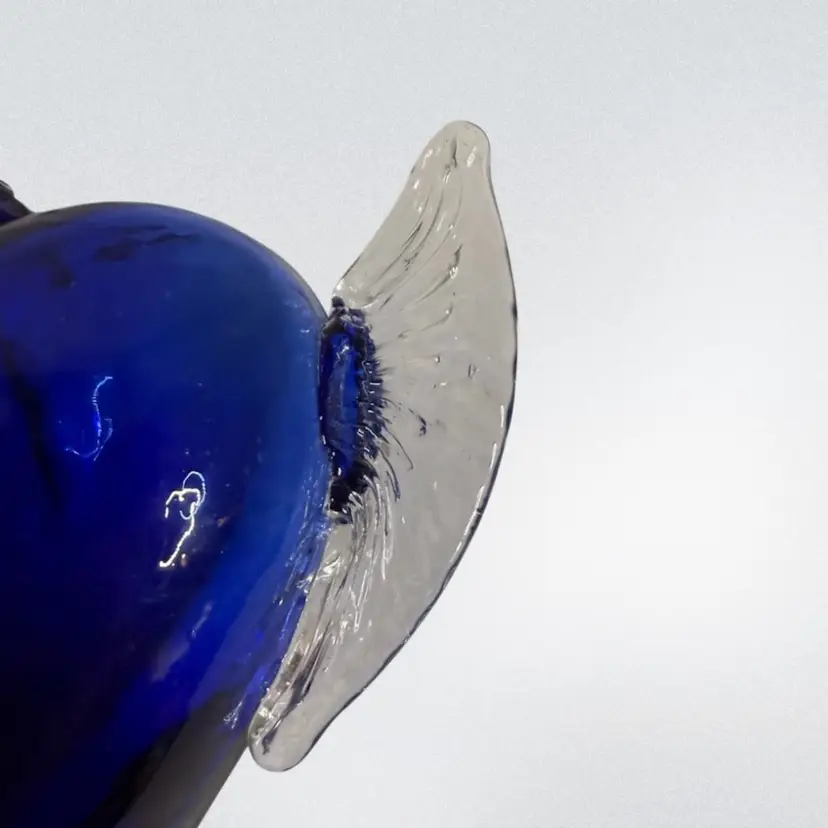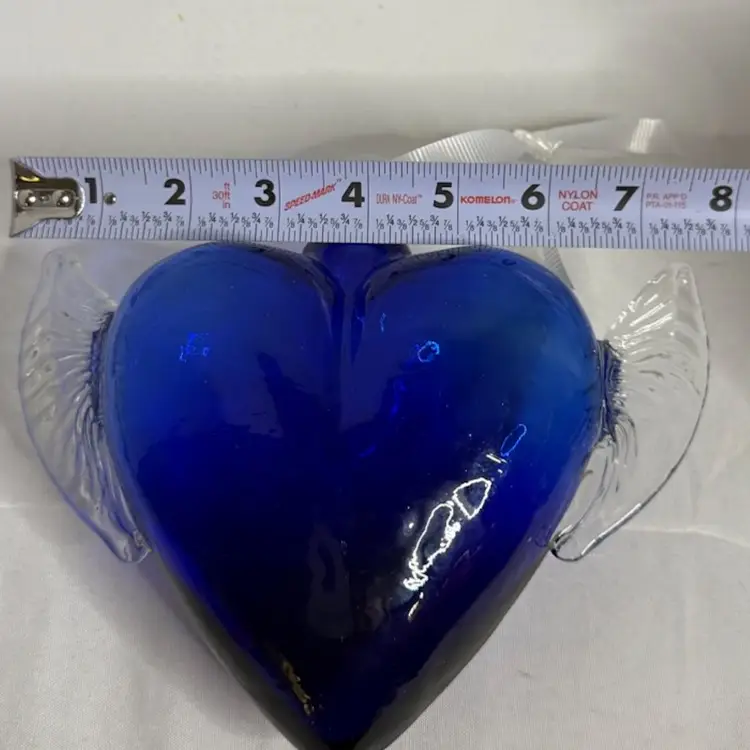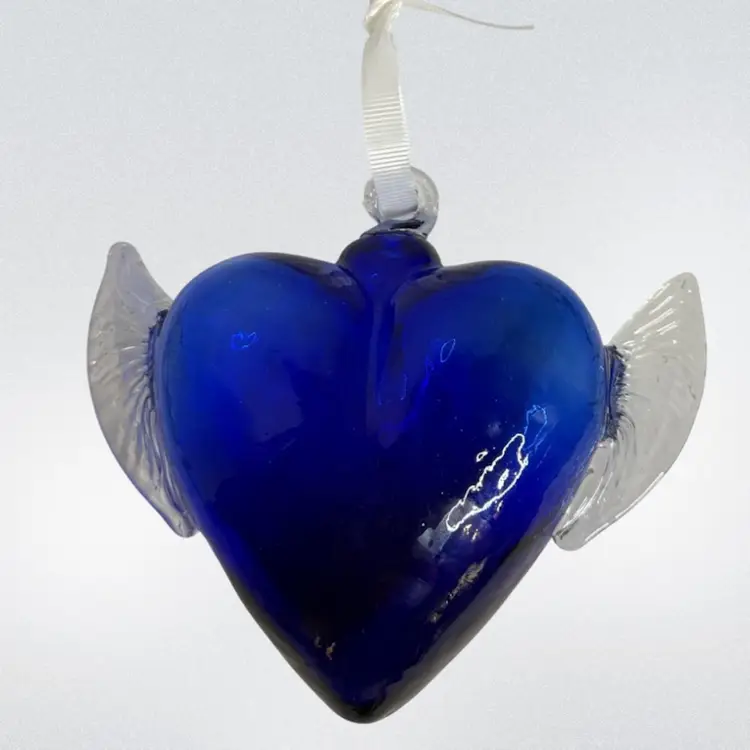 Add a touch of handcrafted charm to your décor with this beautiful handblown cobalt blue glass heart ornament featuring clear applied wings. This striking piece is perfect for year-round display, Valentine’s Day, memorial décor, or as a symbolic guardian-angel gift. Heavy 1.5lbs.