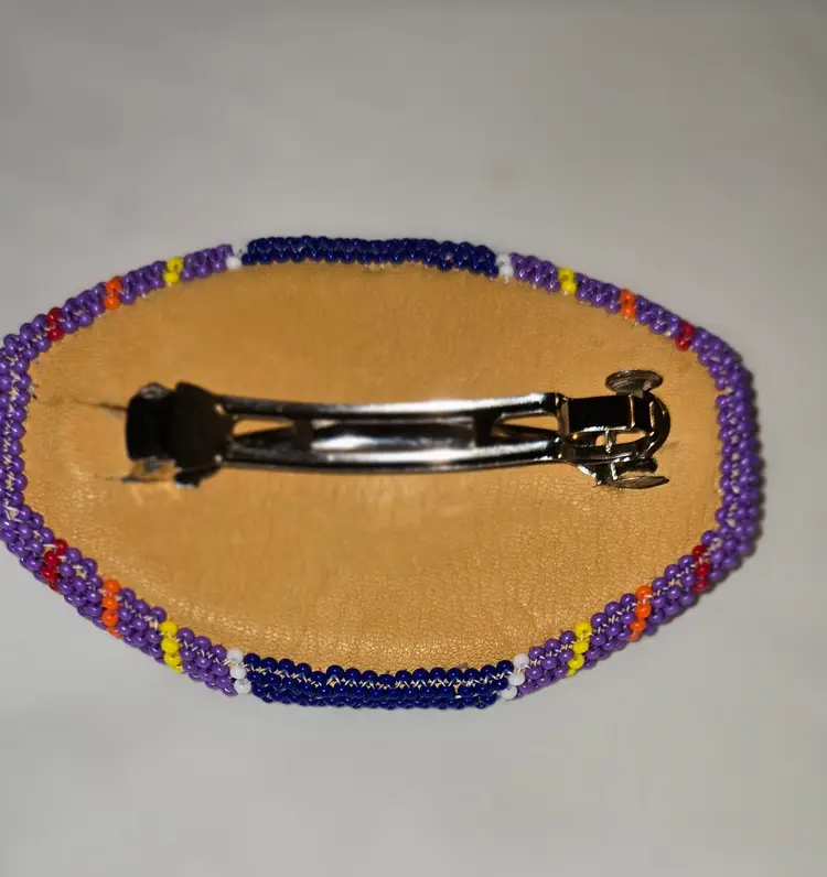 Handmade Beaded Hair Barrette Native inspired measures 4" long 2.75 top the back is genuine leather and has a metal spring clip barrette.