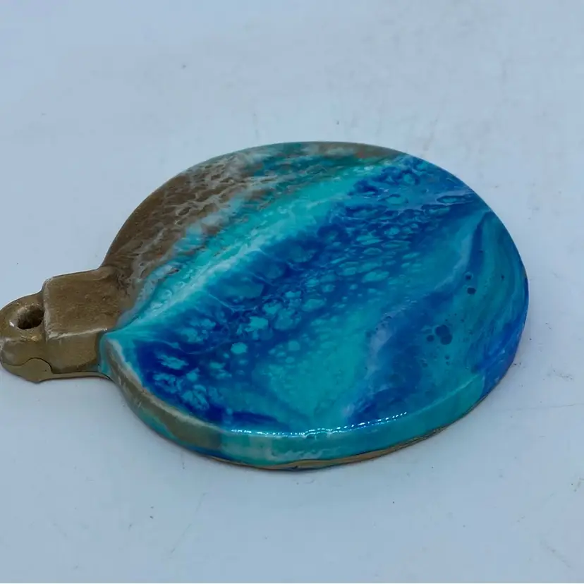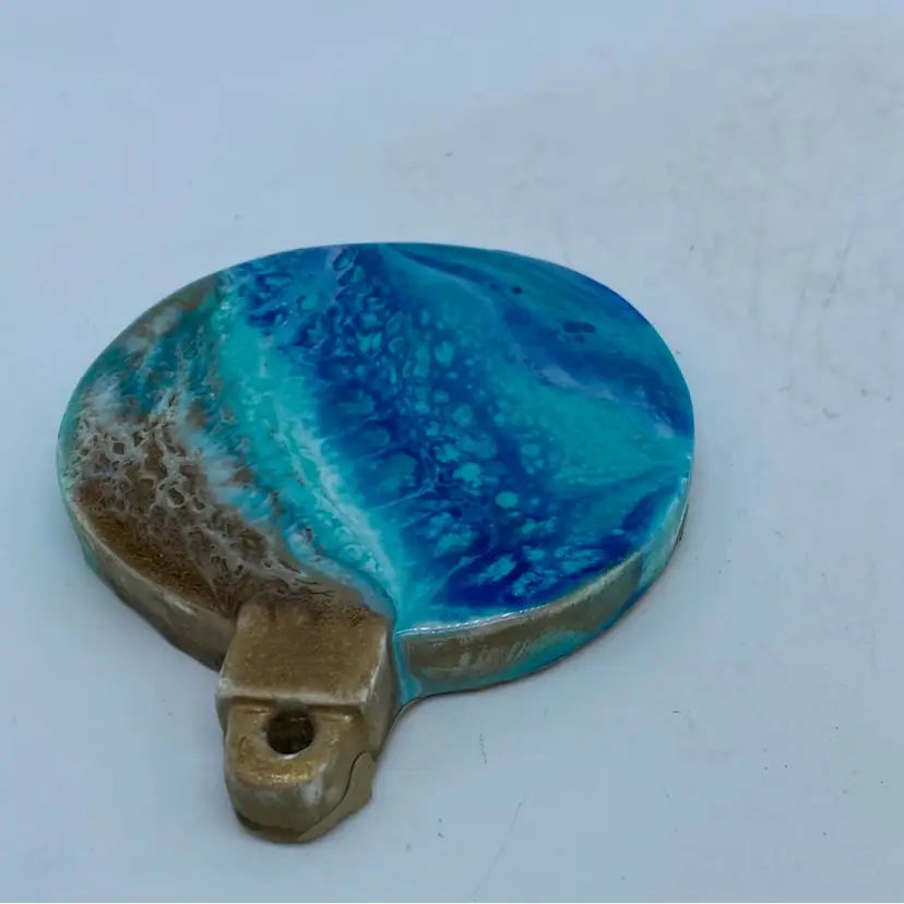 This particular hanging ornament appears to be crafted using resin to depict a seascape or abstract watery pattern. Such pieces are often handmade by independent artists and sold through online marketplaces or craft fairs. The design elements, with their fluid lines and vibrant blues, are characteristic of contemporary resin art inspired by natural phenomena.