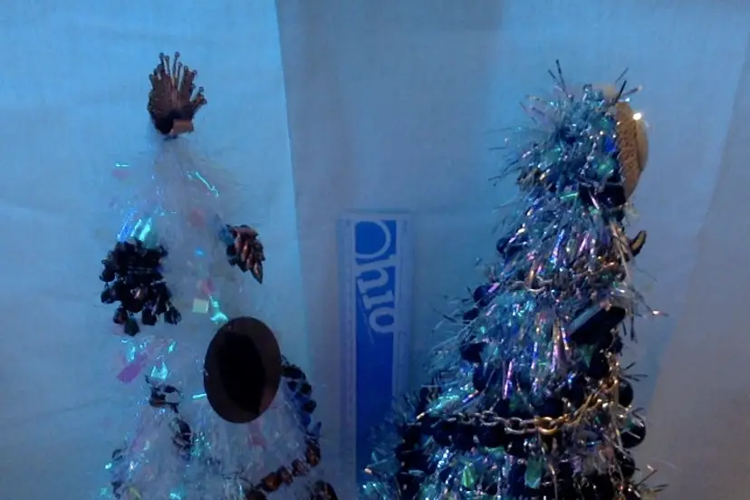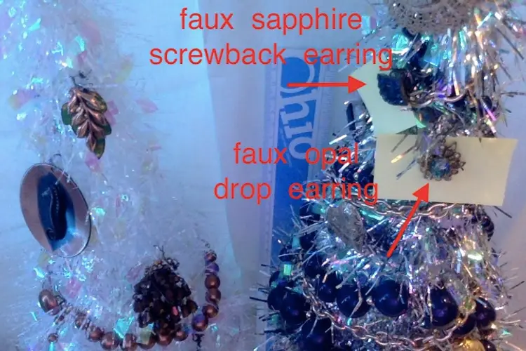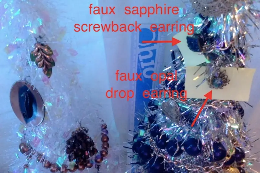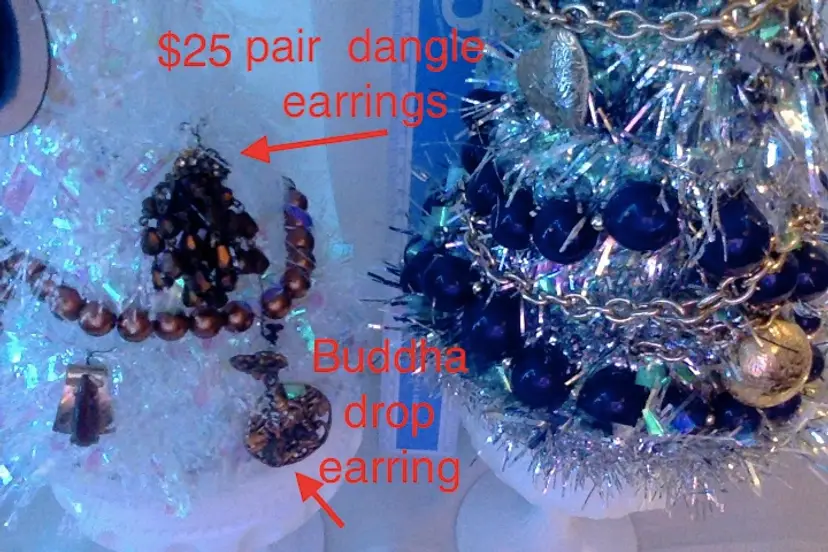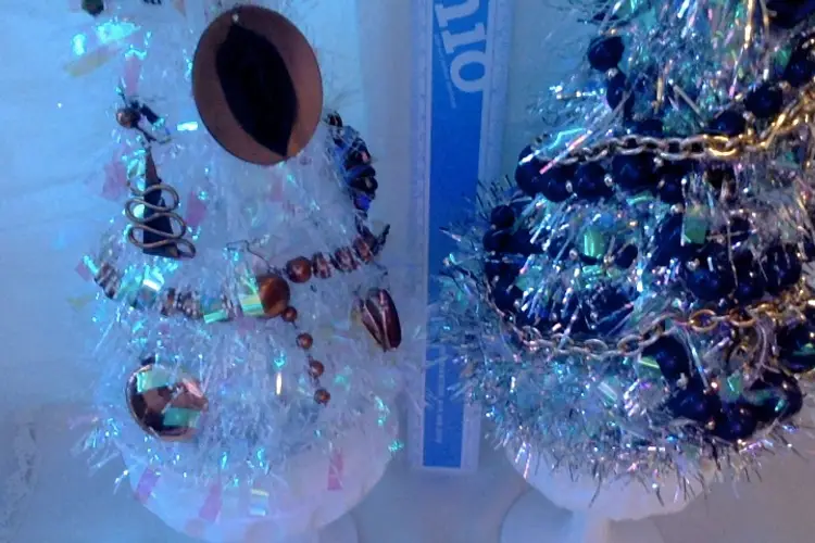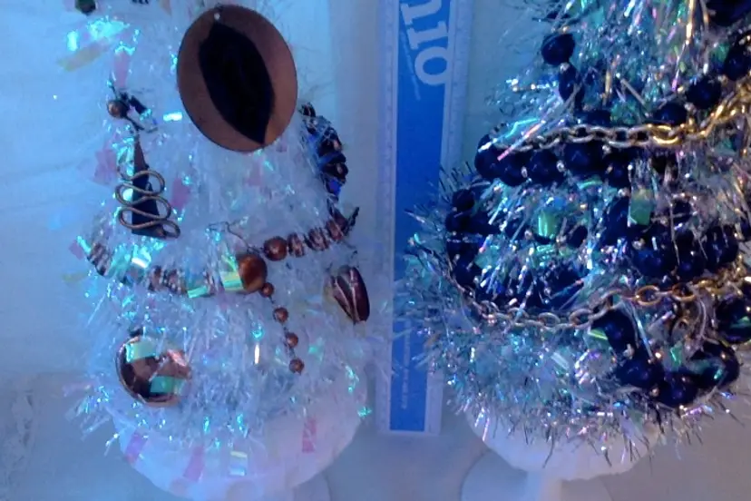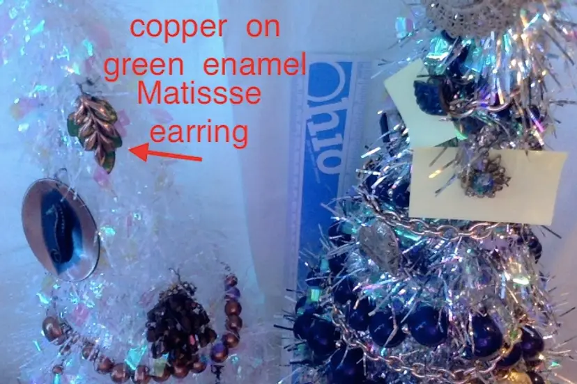 Handmade Vintage Jewelry Christmas Trees on Milkglass Pedestals. One of a kind designs. Great for someone who has everything. Nice to decorate a vanity, dresser, or bathroom counter. $35 and $25. copper $35: Is crafted with copper and copper color vintage jewelry. Features: copper finial earring on top, pair of metallic copper faceted dangle earrings (worth $25), copper seahorse pendant, Matisse copper leaf on green enamel base earring, copper color choker beads (1950's), copper color Buddha drop earring, copper geometric drop earring. Base is a King's Crown by Indiana Glass milkglasss pedestal. navy. $25: Is crafted with goldtone and navy vintage jewelry. Features: engraved goldtone sunburst earring topper, engraved goldtone heart, engraved goldtone dome earring, faux opal drop earring, faux 9 stone sapphire screw back earring, faux London topaz earring, square goldtone chains, graduated navy bead necklace with goldtone bead spacers. Base is an Acanthus Branch & Leaf pattern made for FTD milk glass pedestal. Please see my other listings. Multiple purchase discounts. Monitor 8PM nightly. (not 24/7)