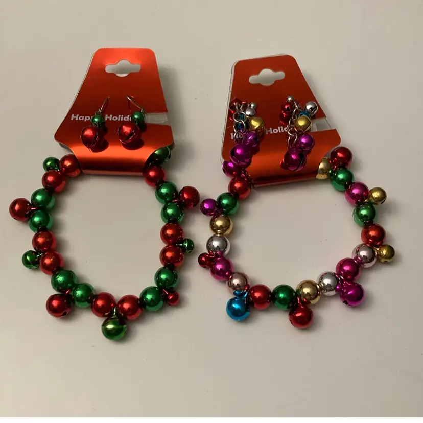 Set of 2 New old stock Happy Holidays stretch bracelets and earrings sets. One has red and green Shiny Bright Beaded Bells Bracelet with Matching Earrings. The other set has multicolor mixed beaded bracelet with matching drop earrings. They are jingly. The earrings have a standard post with push on back. They dangle down 1 1/2".
