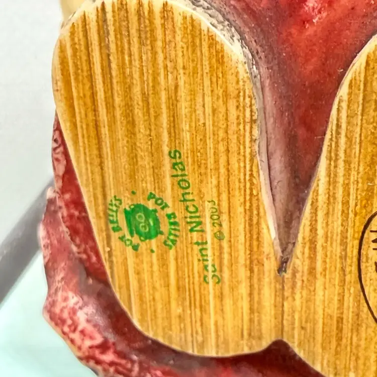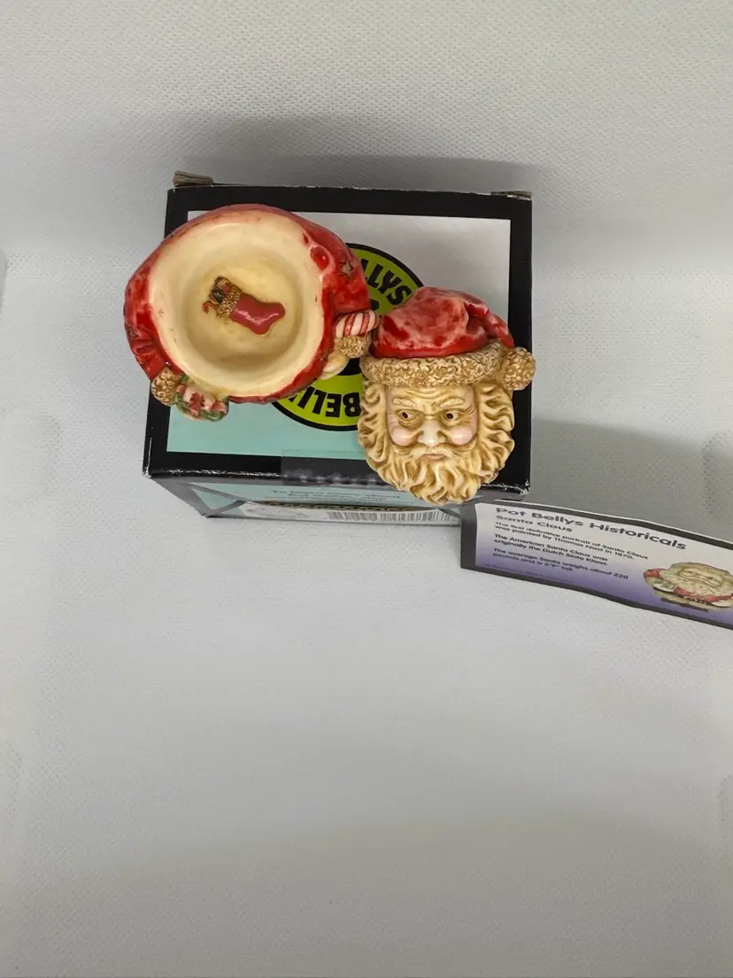 Features the classic rounded Pot Belly design with Santa holding a small present. hand-painted and cast from crushed marble, and includes a hidden compartment with stocking.