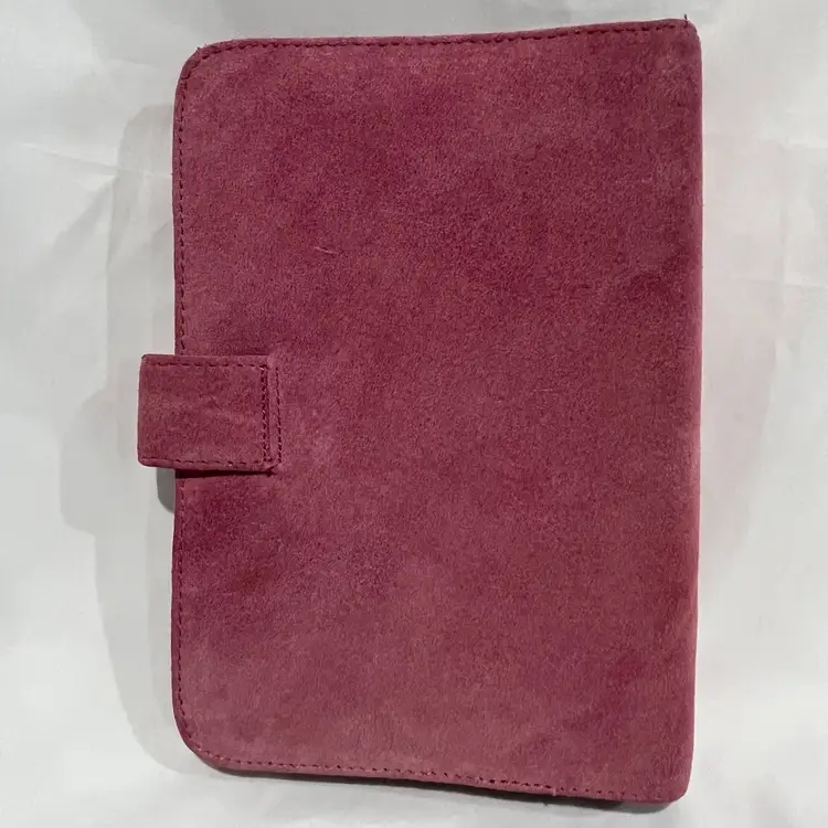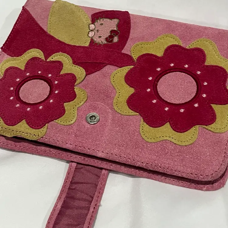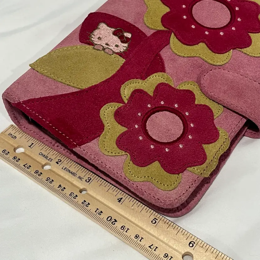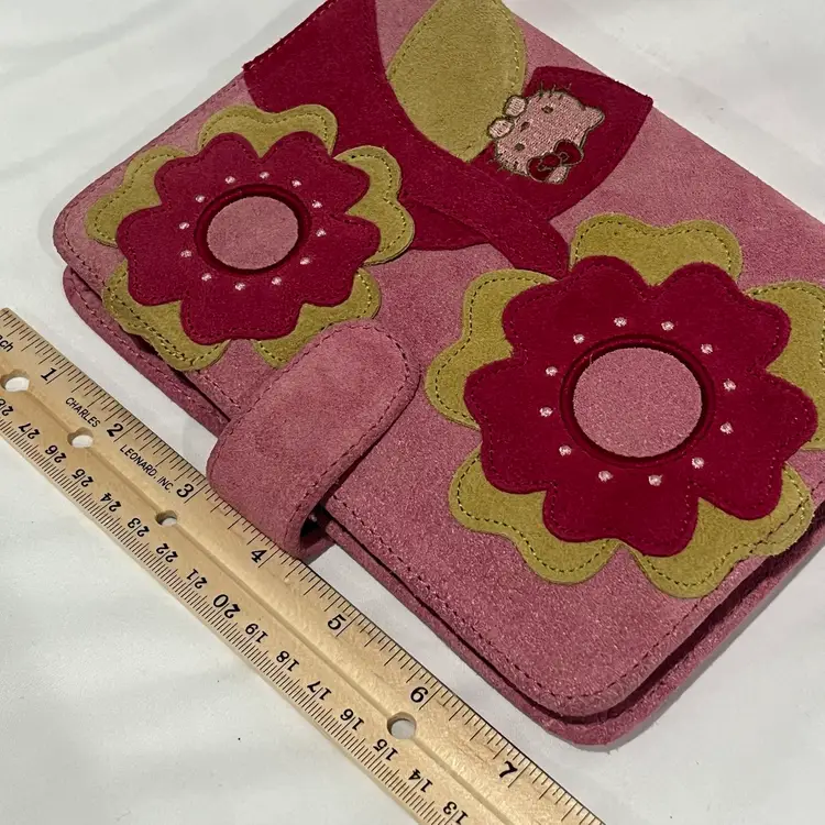 Adorable Hello Kitty suede-style planner from Sanrio (2004), featuring vibrant appliqué flowers and a peeking Hello Kitty detail. Measures approximately 7 in tall and 5 in wide and is in great condition with light signs of handling only. Inside includes pockets, a 6-ring binder mechanism, and original Hello Kitty divider inserts.