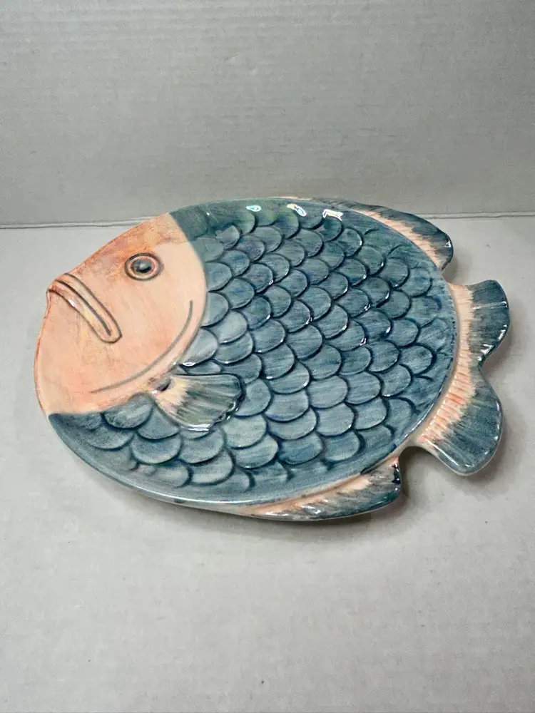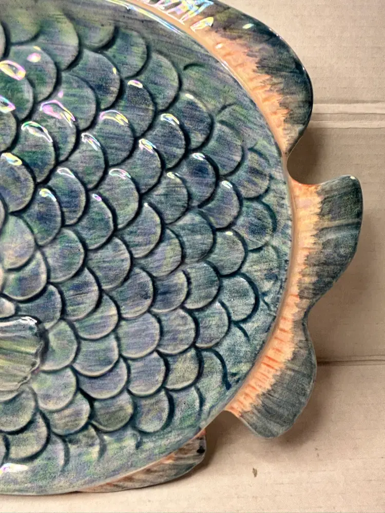 The Henricksen Imports Iridescent Blue and Peach Fish Plate is a vintage collector plate featuring a Japanese theme with a beautiful iridescent blue and peach color palette. This decorative piece showcases intricate details of fish, making it a unique addition to any collector's display. With its high-quality craftsmanship and cultural significance, this plate is sure to be a nice display.