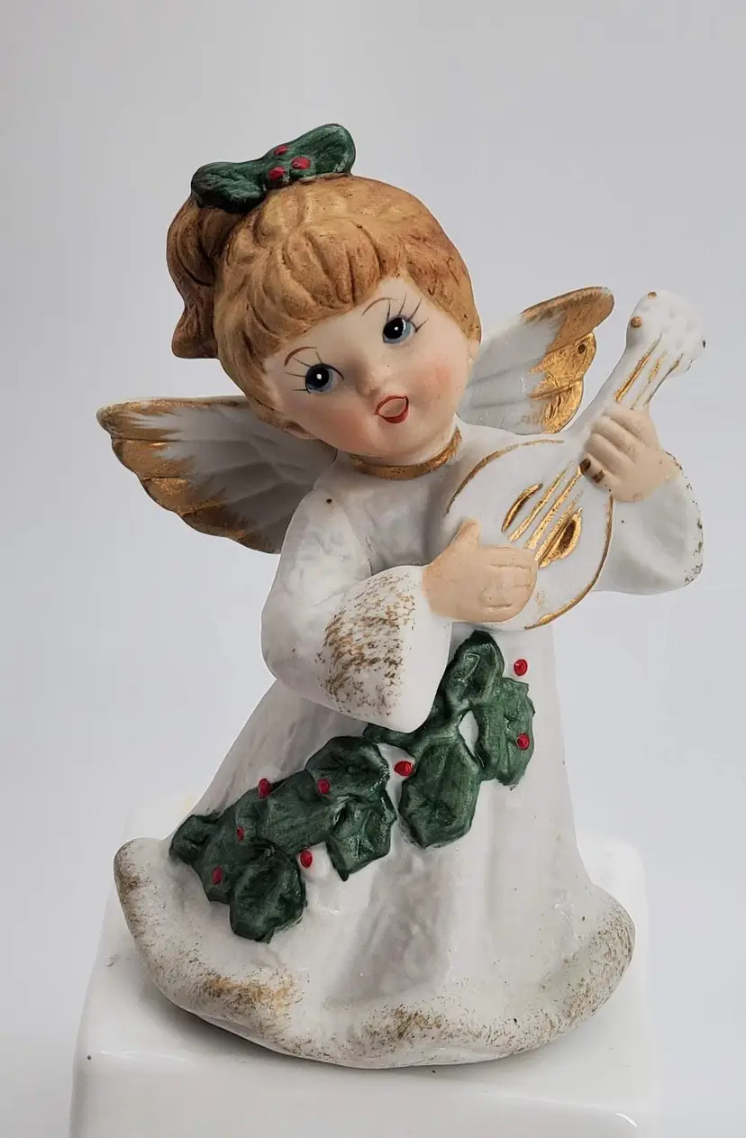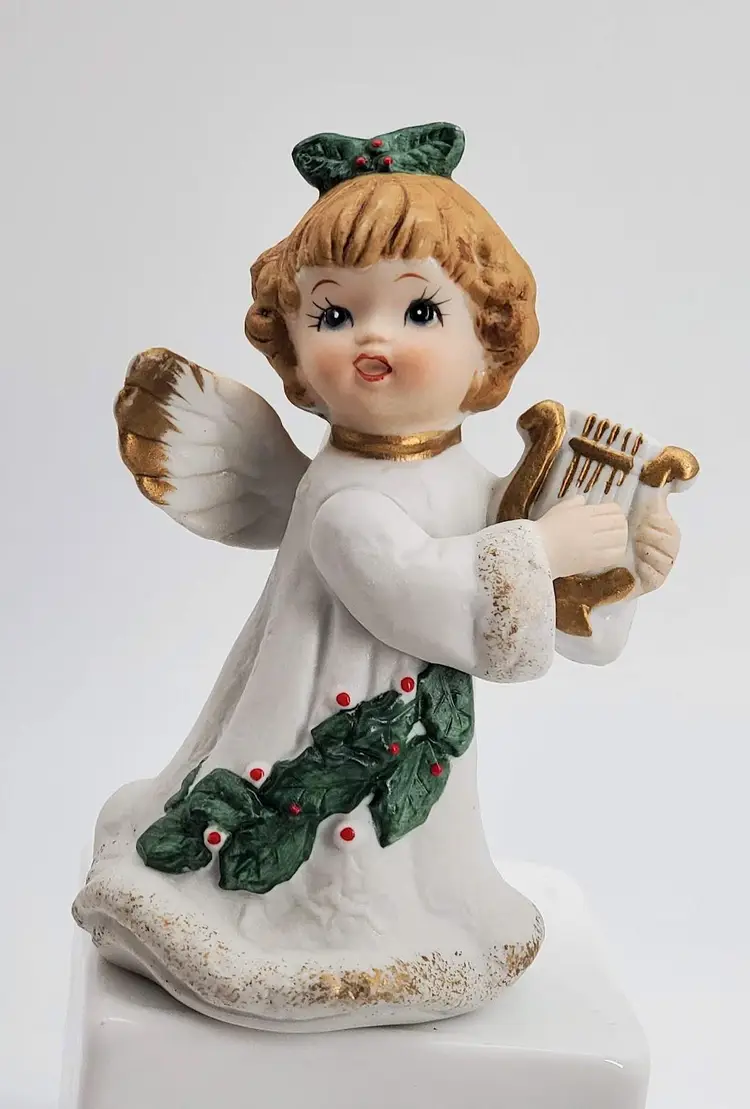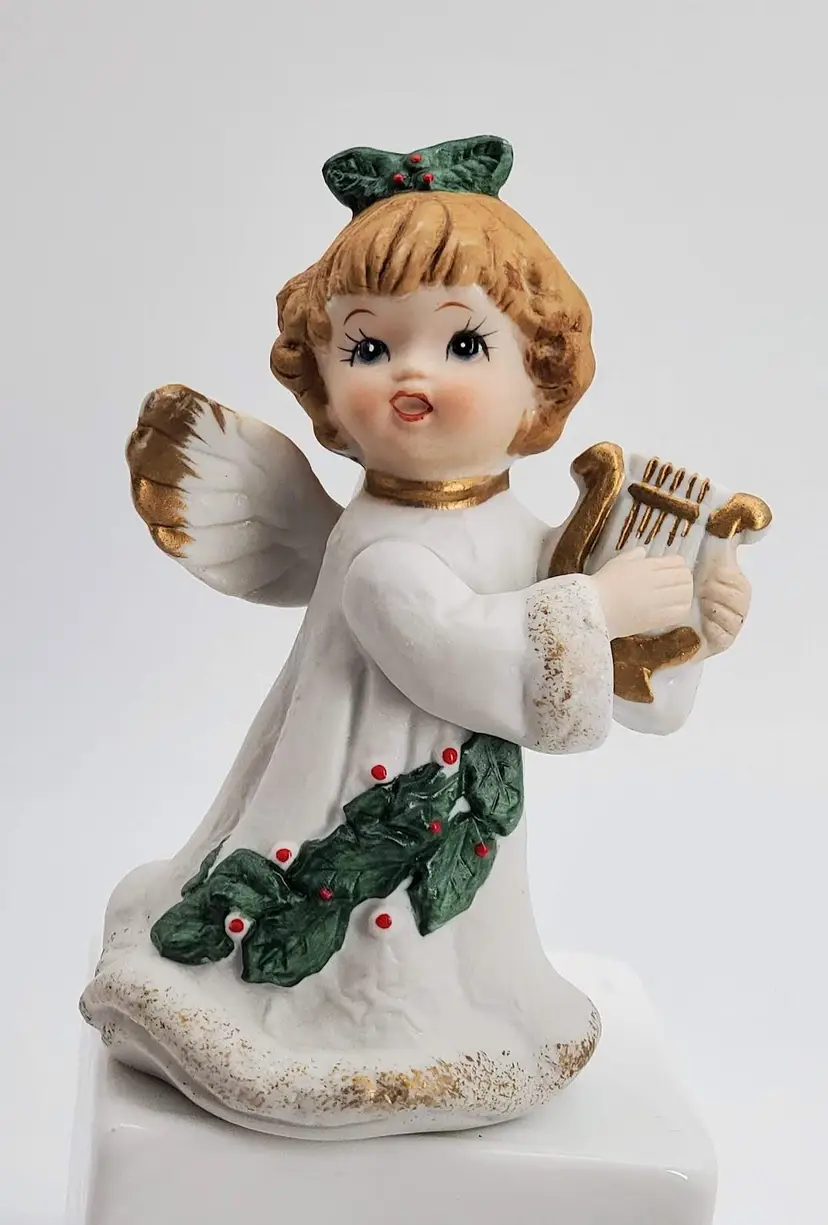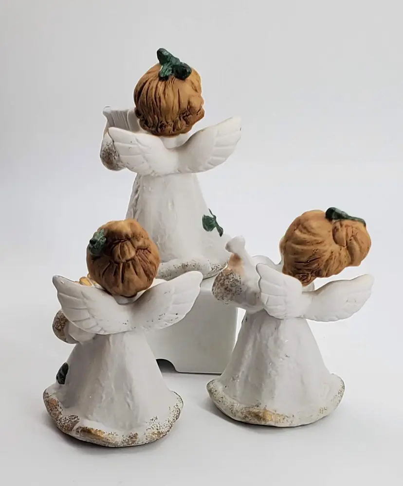 Pretty little trio of porcelain HomCo angels playing heavenly instruments and singing. Each is decked out in a holly sash and hair bow.