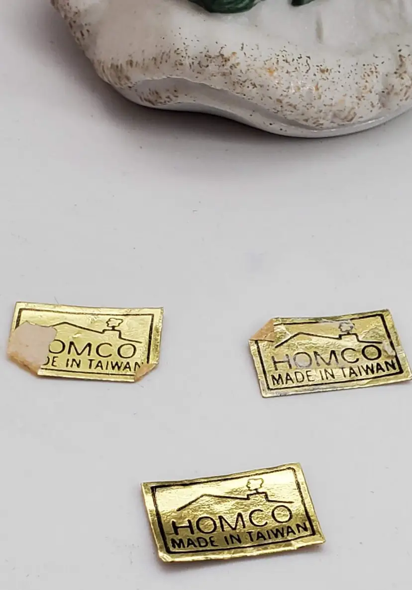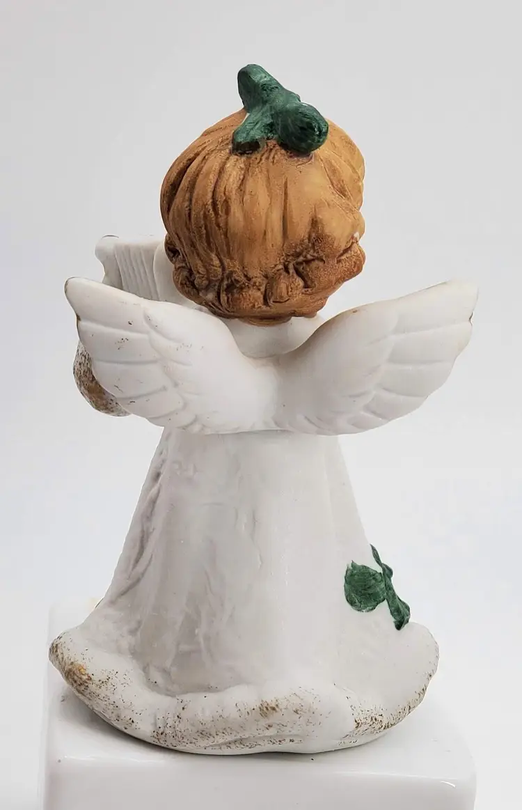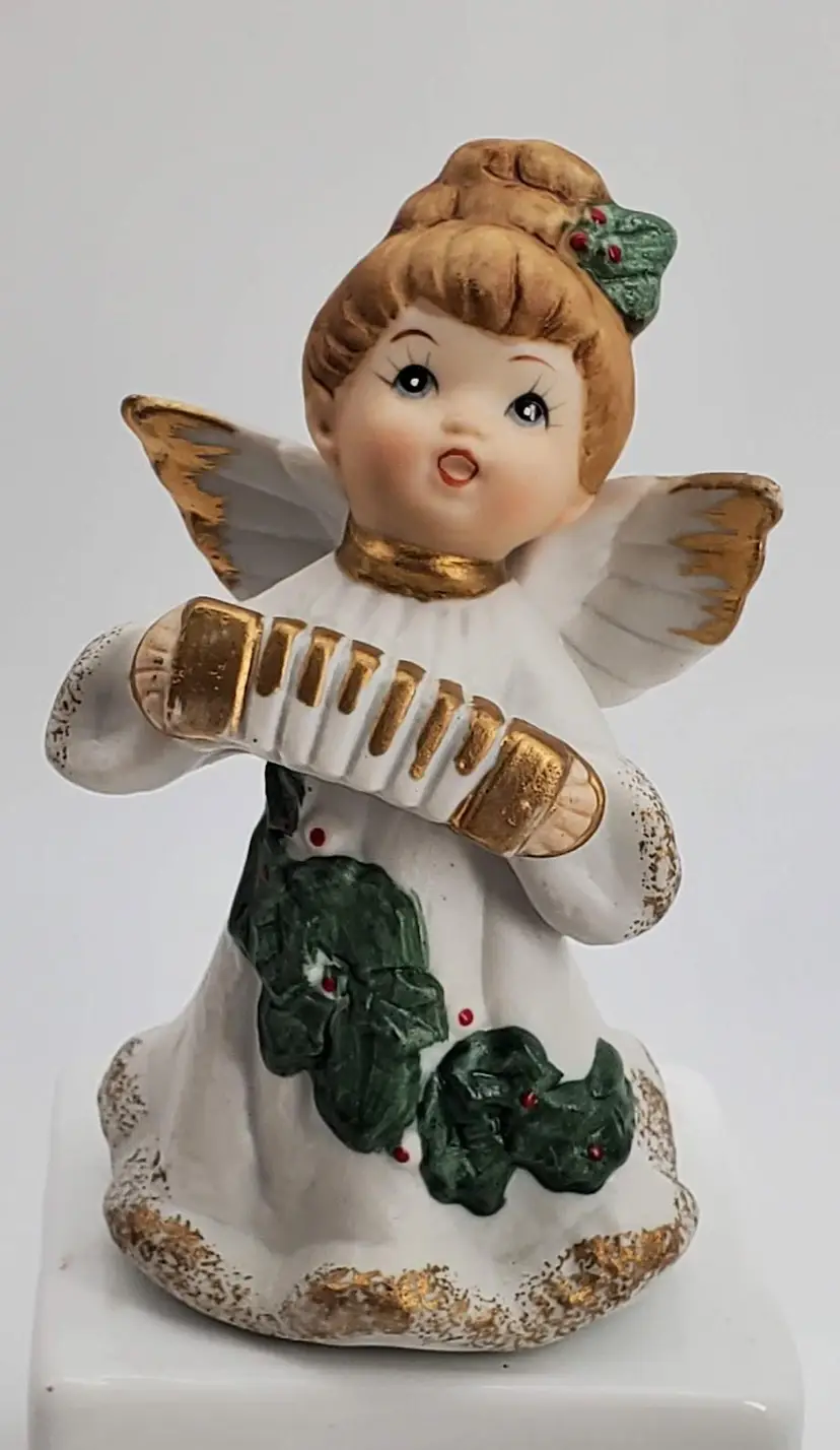 Pretty little trio of porcelain HomCo angels playing heavenly instruments and singing. Each is decked out in a holly sash and hair bow.
