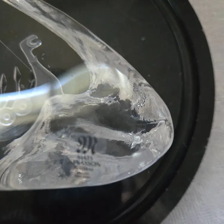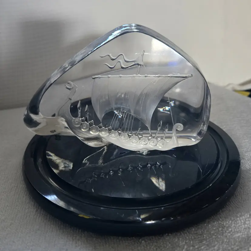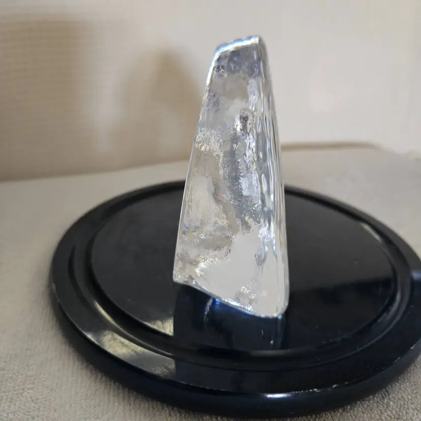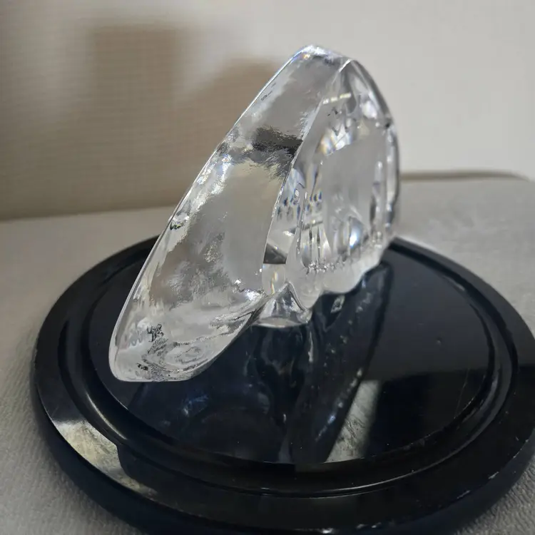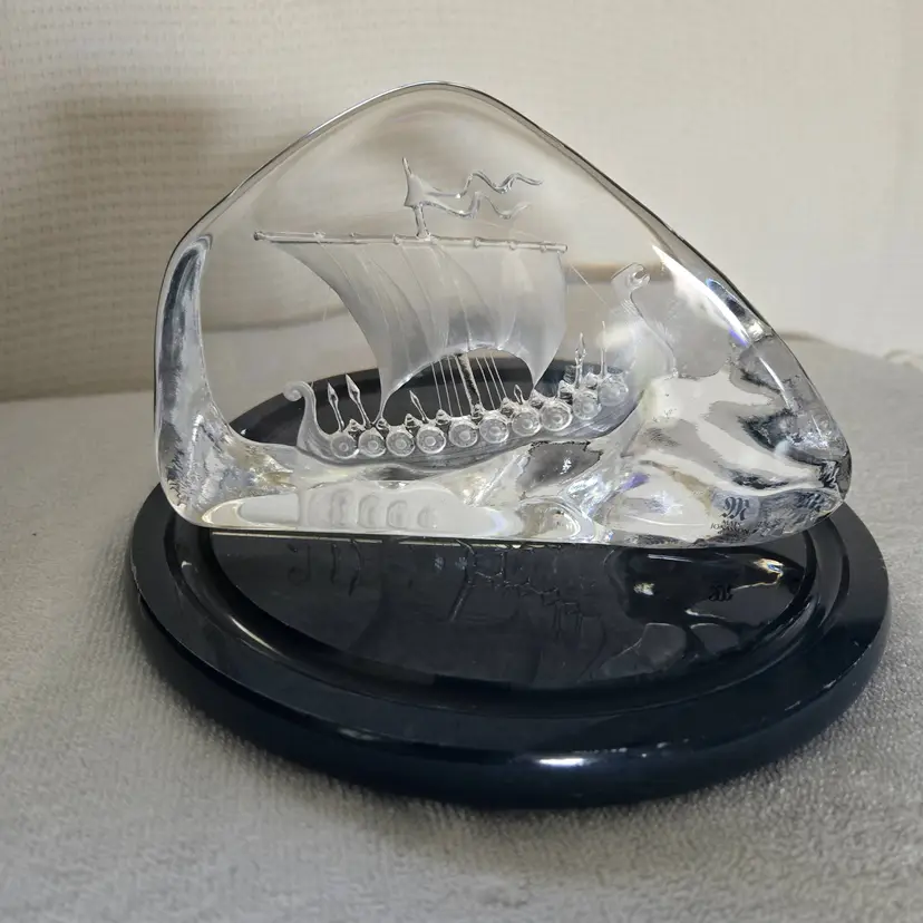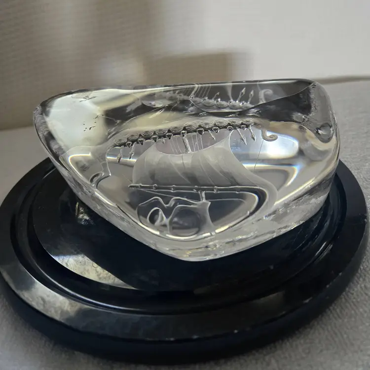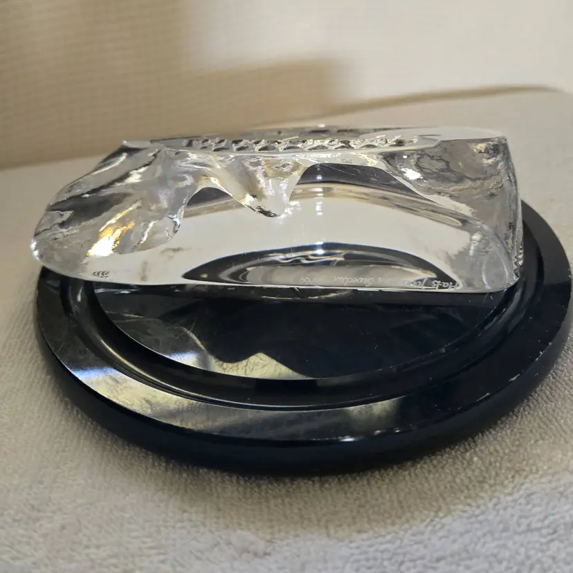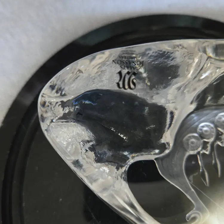 Mat Jonasson 33760 paperweight. Hand crafted by Mat Jonasson Crystal Studios in Sweden. Hand blown into a single mold, etched and polished to perfection. Has its original sticker and is signed on the bottom. Has 1 small scratch on the bottom but otherwise in excellent condition. 4" tall, 6 1/2" wide, and 1 1/2" deep. Comp prices are up to $165.00.