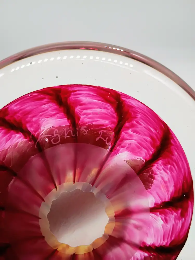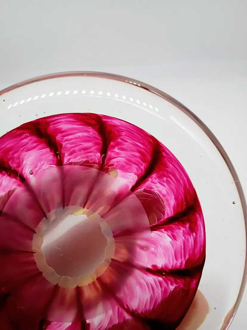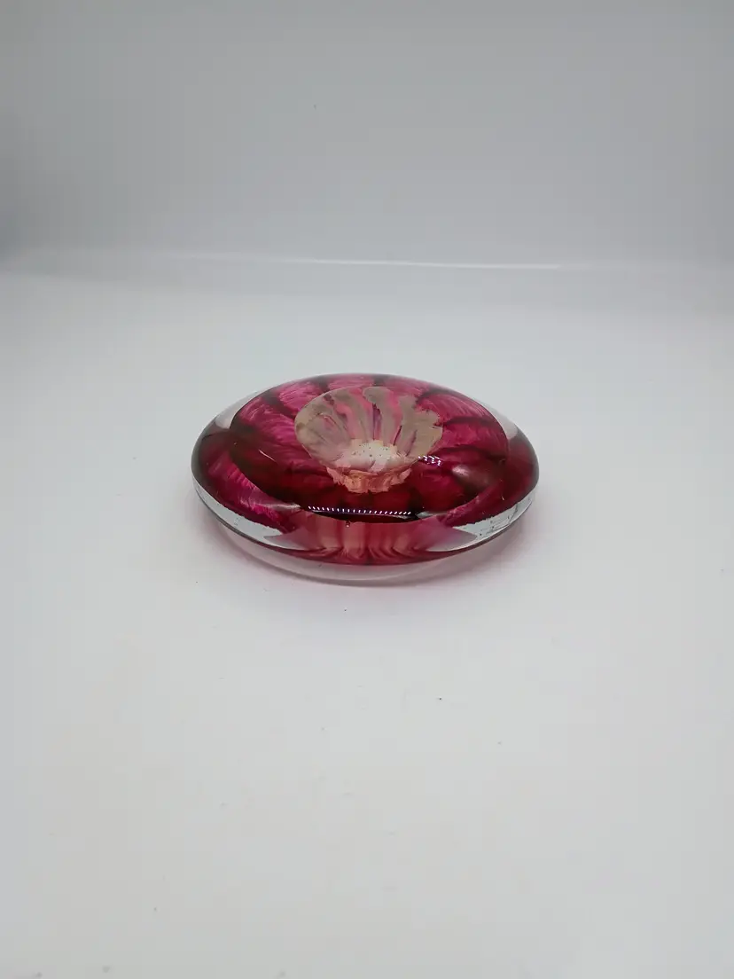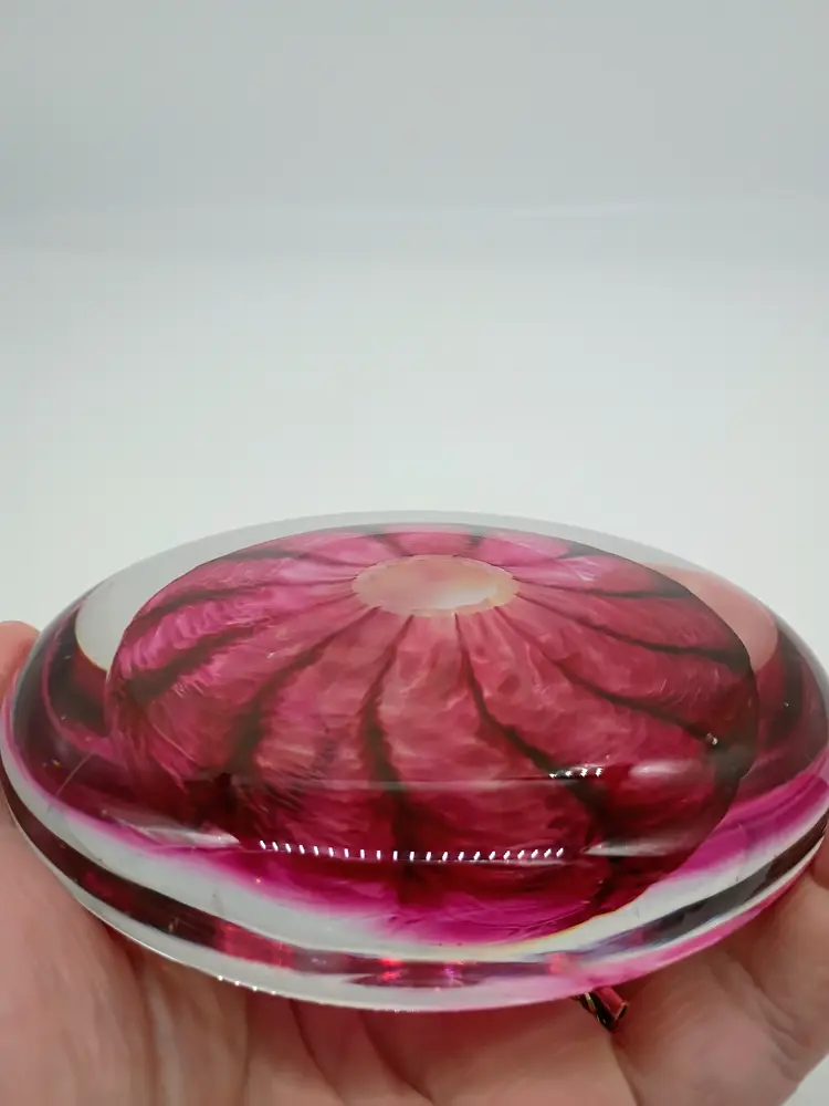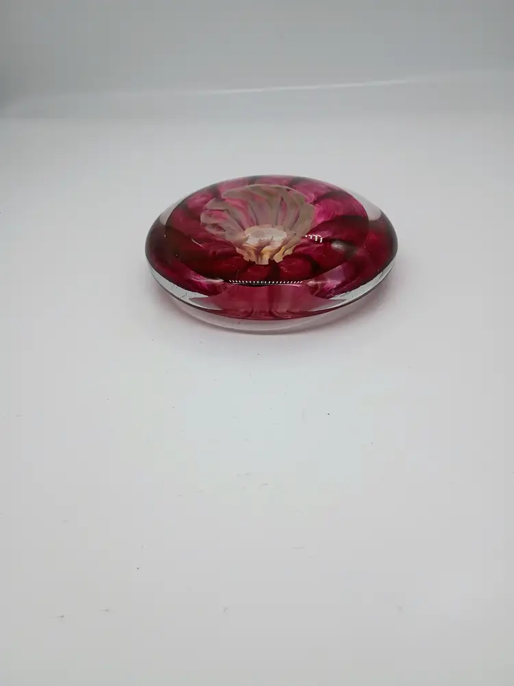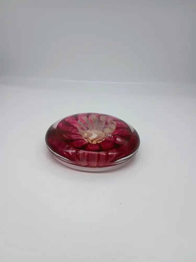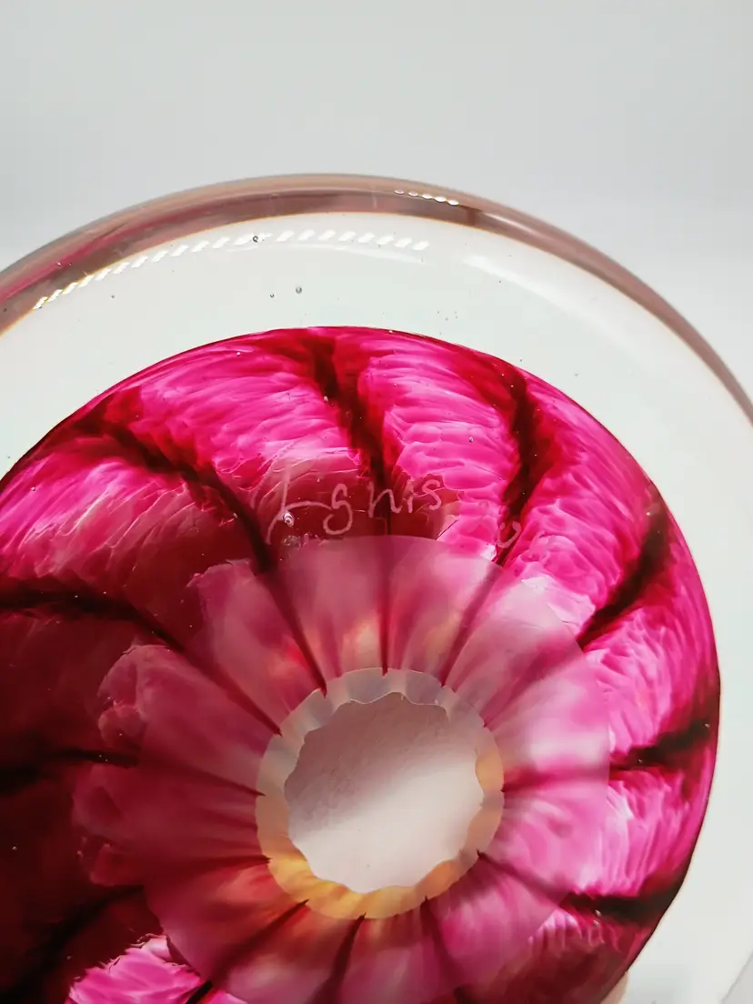 Large Hand Blown Art Glass Disc Paperweight Abstract Flower Eyeball Signed Ignis and Dated 2011. This is 1.5 inches tall and 5 inches in diameter. Solid heavy Glass. This is preowned, No Chips Cracks or Flea Bites no fractures or bruises. Polished Glossy bottom, Ignis is a Glass Blowing Studio in Chattanooga TN, USA. Excellent condition. Ships USPS Domestically and UPS Shipping Globally.