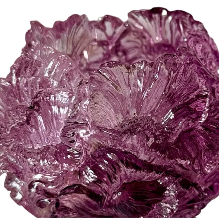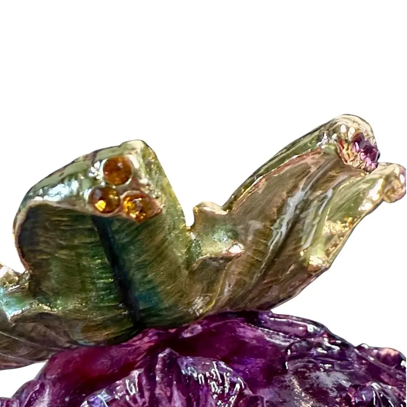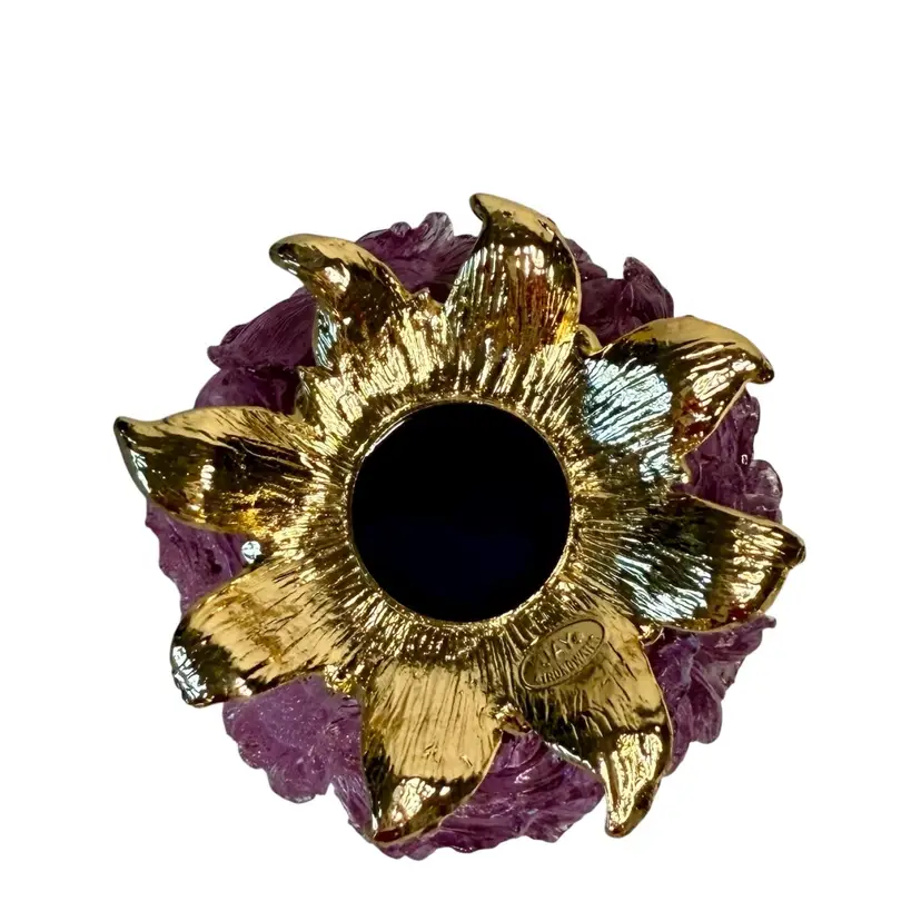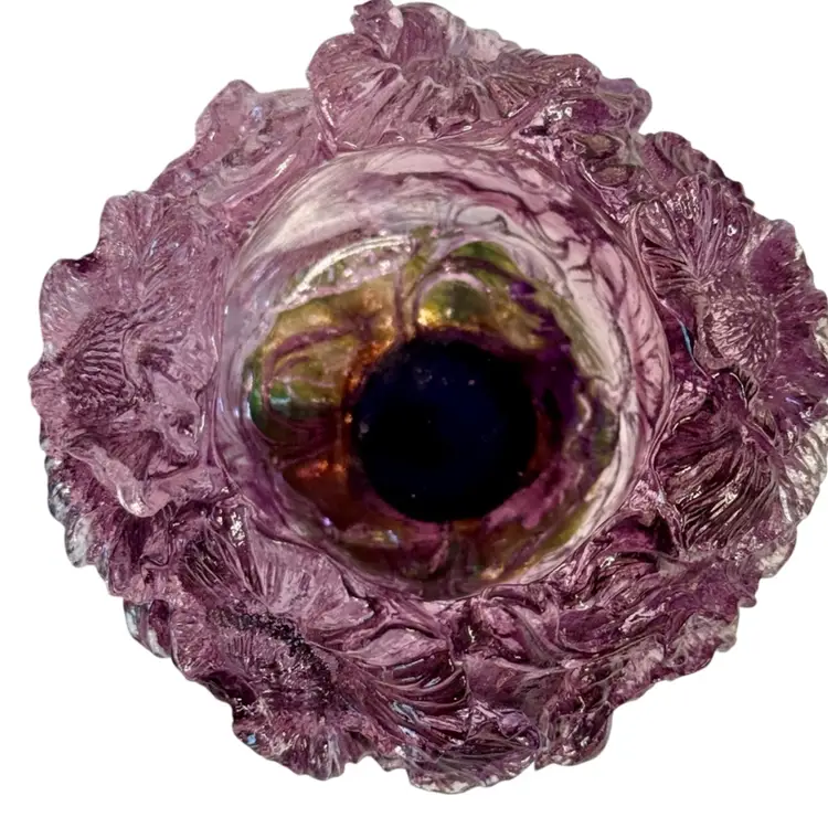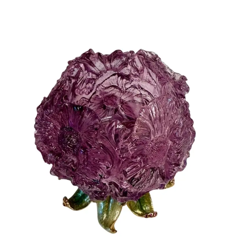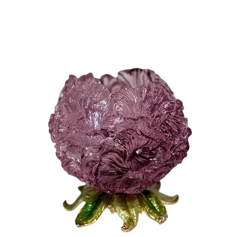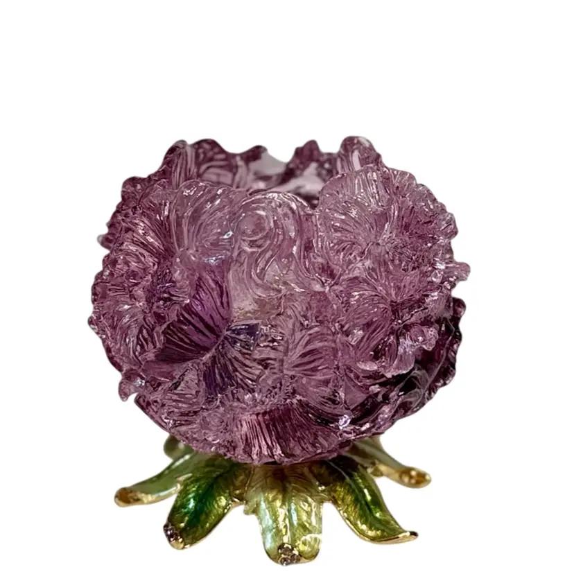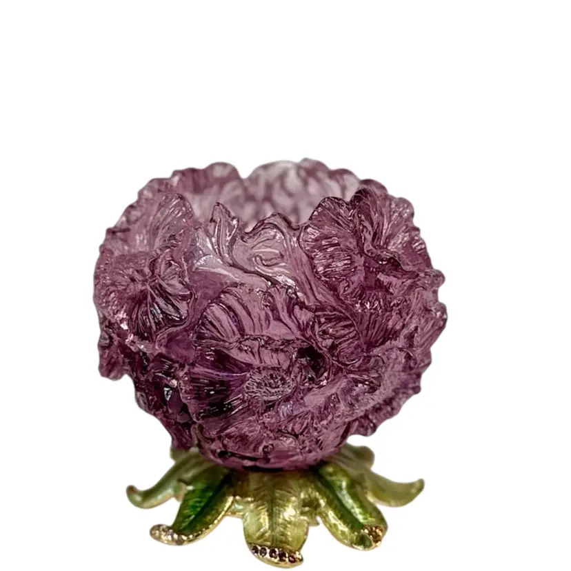 Exquisite glass and metal tea light candle holder. lavender floral design, enamel painted metal leaf base, tips of leaves decorated with Swarovski crystal’s. Glows with a 365 UV Light.