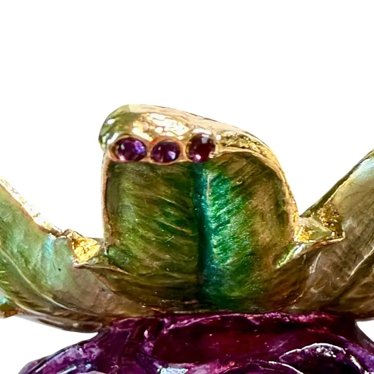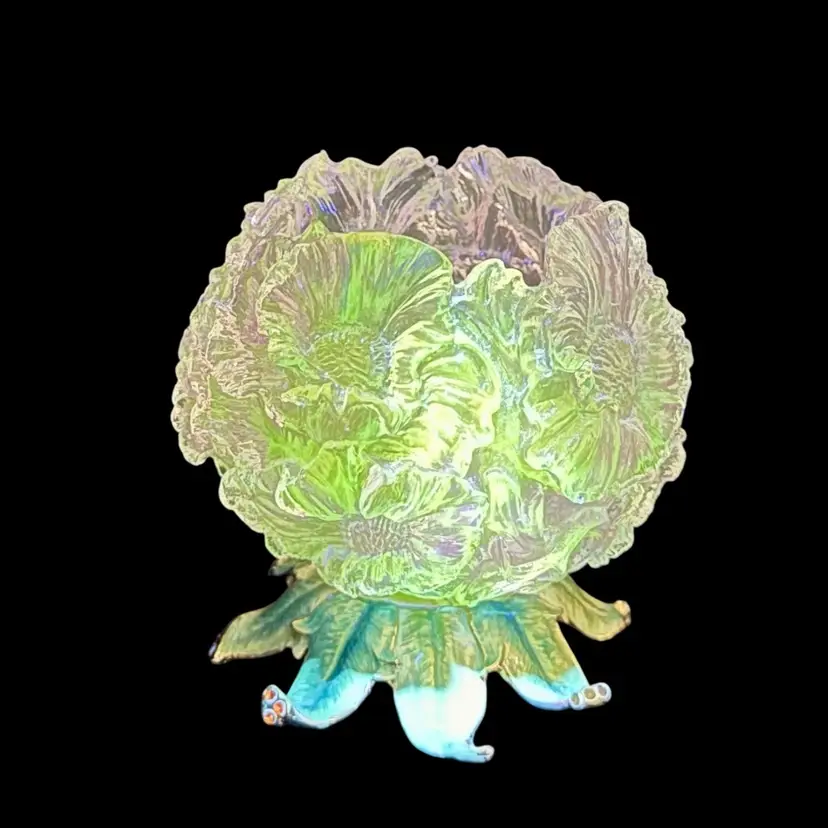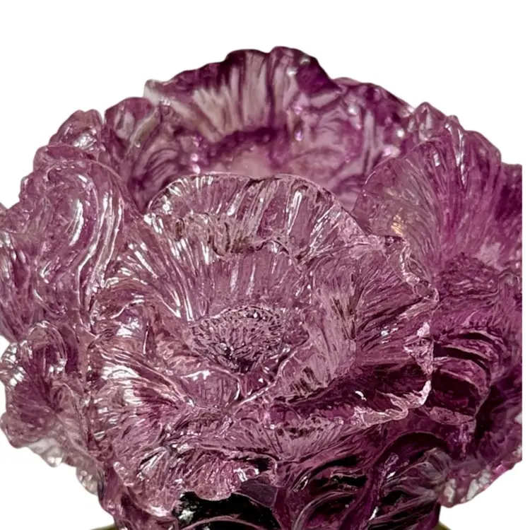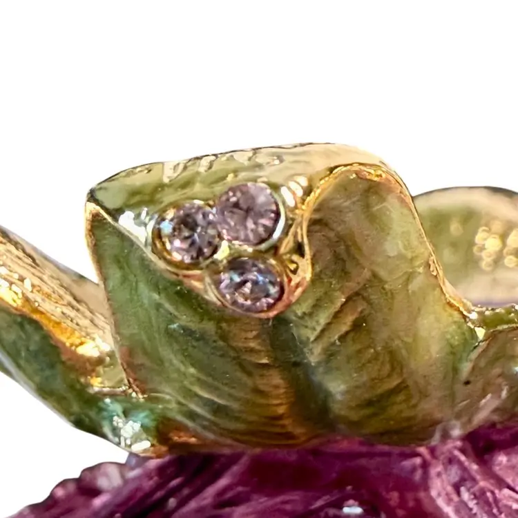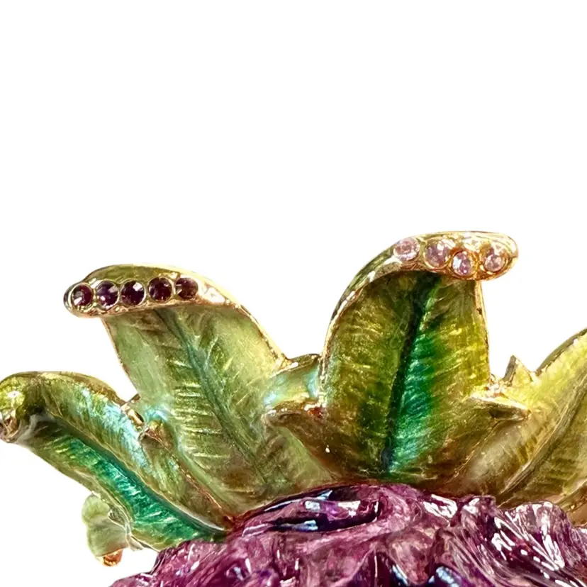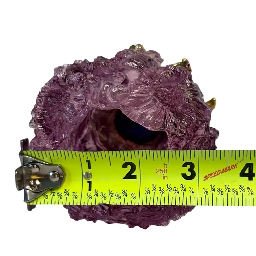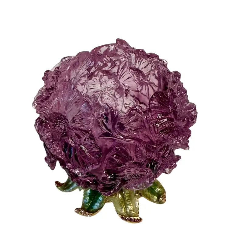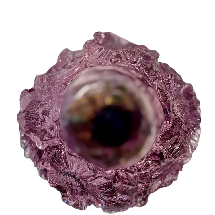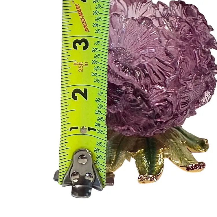 Exquisite glass and metal tea light candle holder. lavender floral design, enamel painted metal leaf base, tips of leaves decorated with Swarovski crystal’s. Glows with a 365 UV Light.
