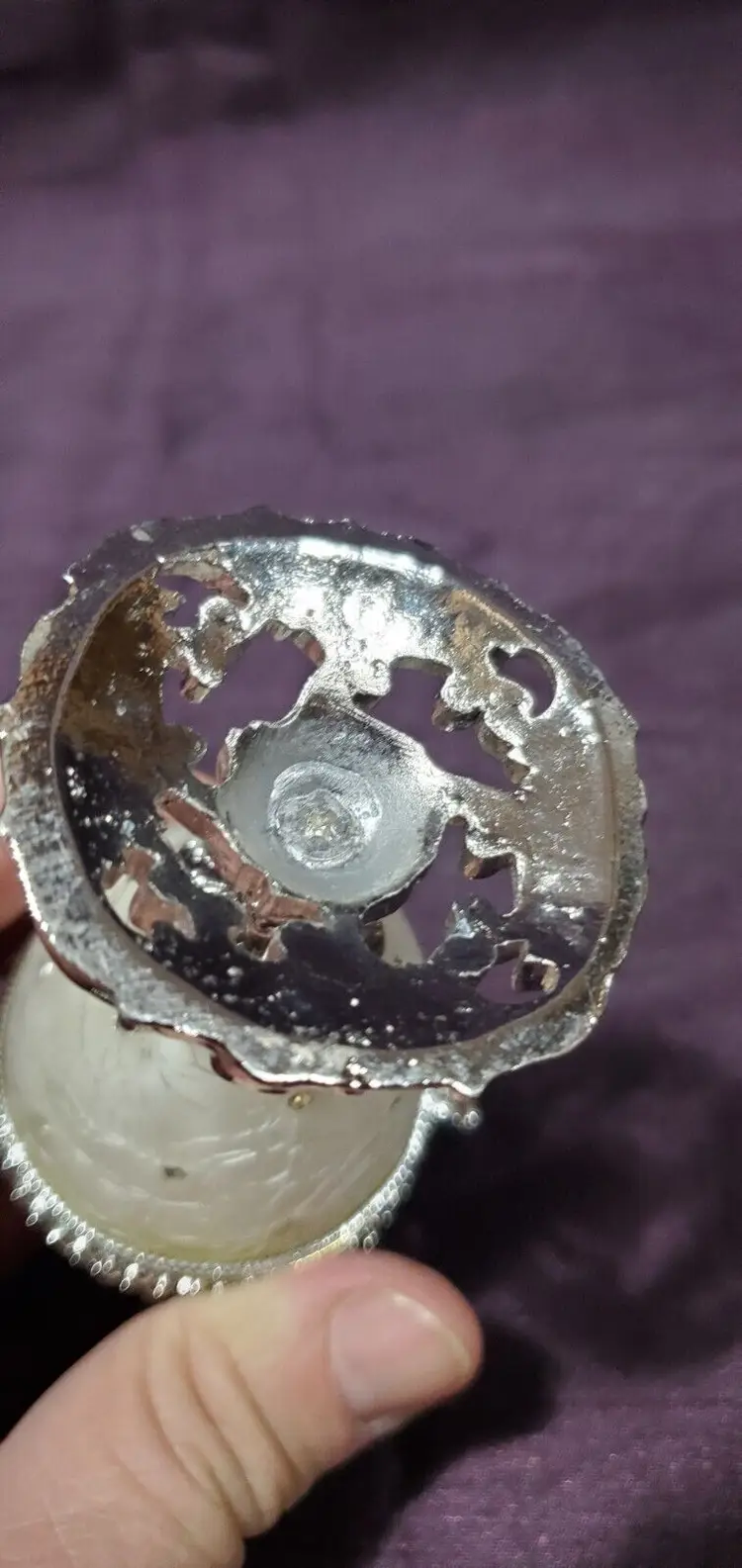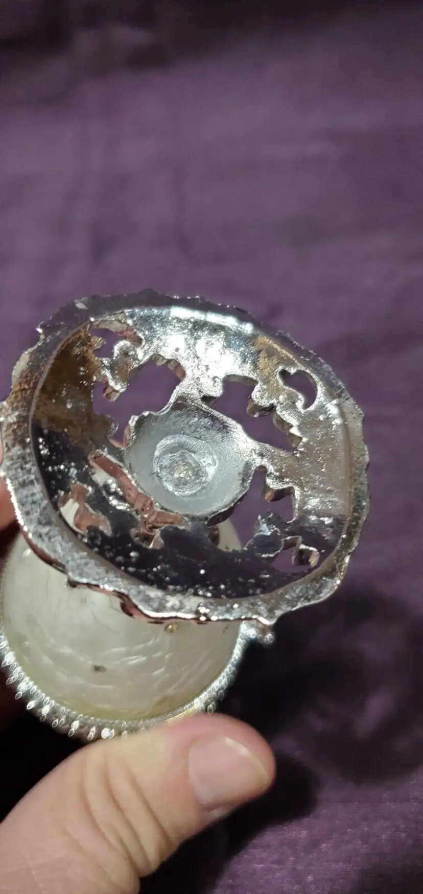 Excellent condition but a bit wonky lean to it but can be displayed to look straight. Silk liner and silver plated stand.