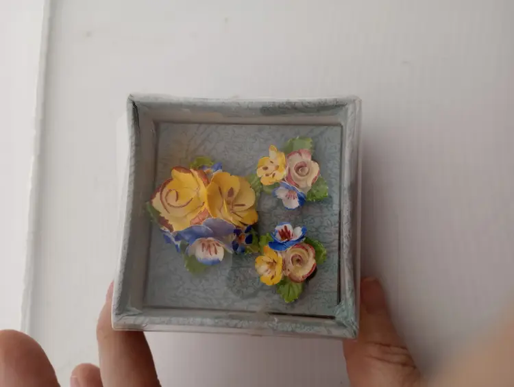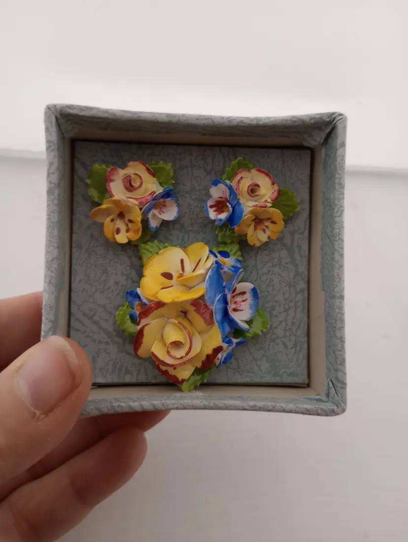 This is a beautiful bone china brooch and earrings set by Jon Anton, in the original box. They are in excellent vintage condition with no chips or cracks. The box is in fair condition as the plastic lid has a tear and a stain. The brooch is 1.5" across and each earring is 1" across.