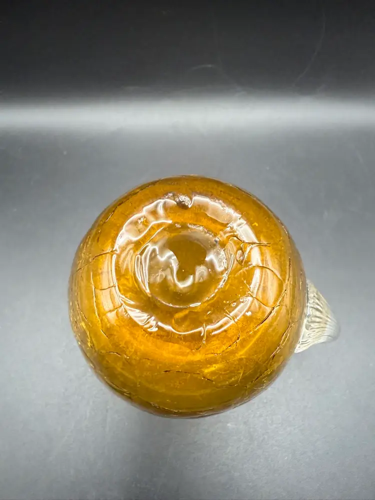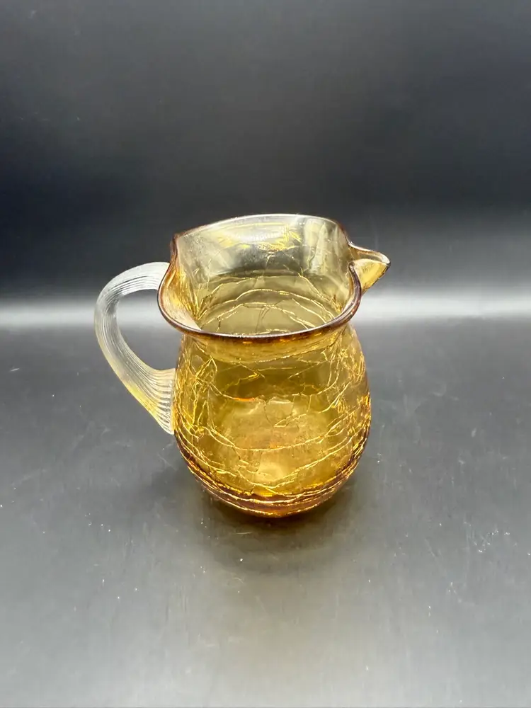 Crackle glass, also known as ice glass or fissure glass, is a decorative glass technique where the glass is heated and then rapidly cooled, causing it to fracture. It is then reheated at a lower temperature to seal the fissures, creating a unique, web-like pattern within the glass. This technique was popular in the mid-20th century for creating decorative items like vases, pitchers, and bowls.