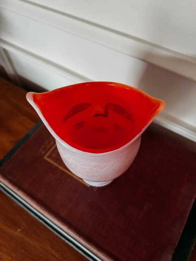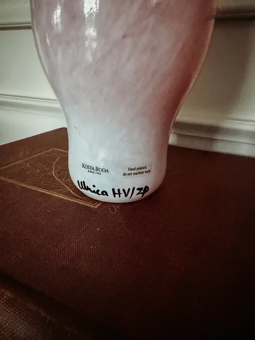 The glass is mouth-blown in Kosta, Sweden. The design, featuring stylized faces, is one of Hydman-Vallien's most well-known series, first introduced in 1986. The vase has appeared in popular TV shows such as Friends and Sex and the City.