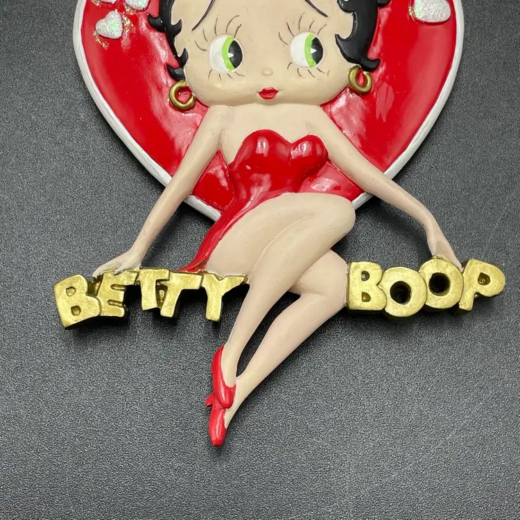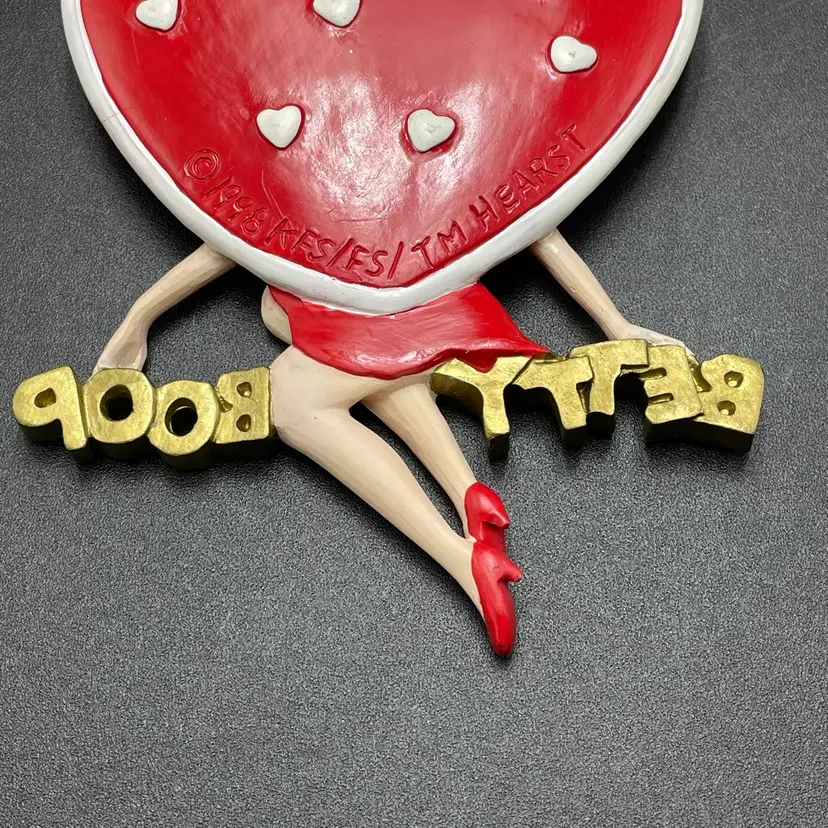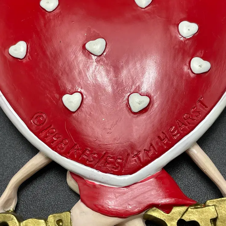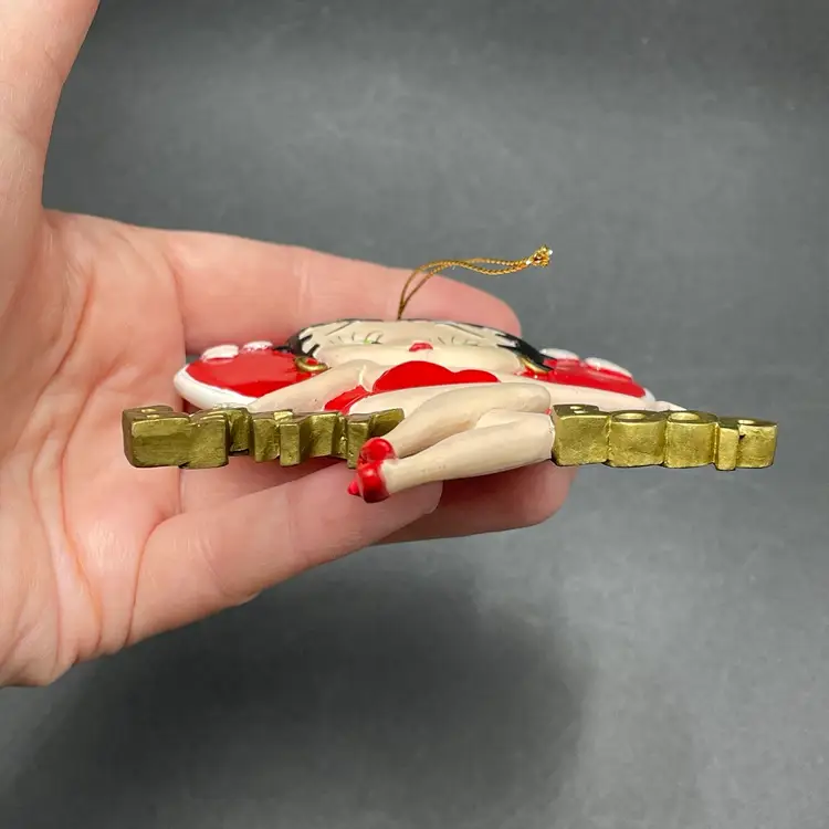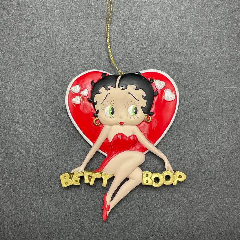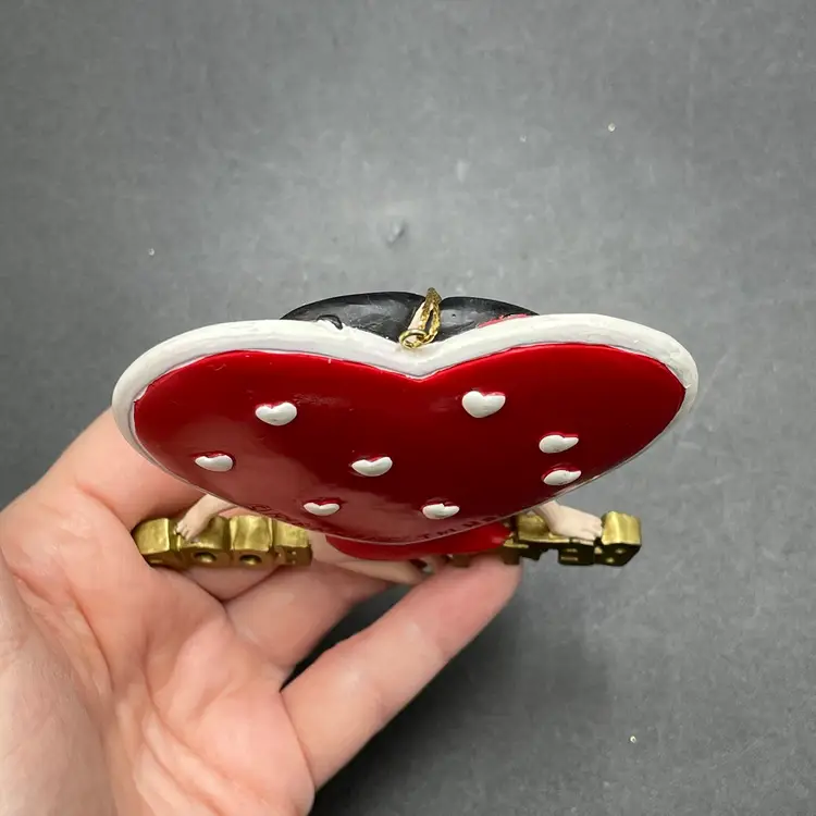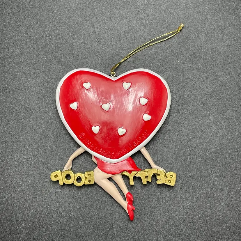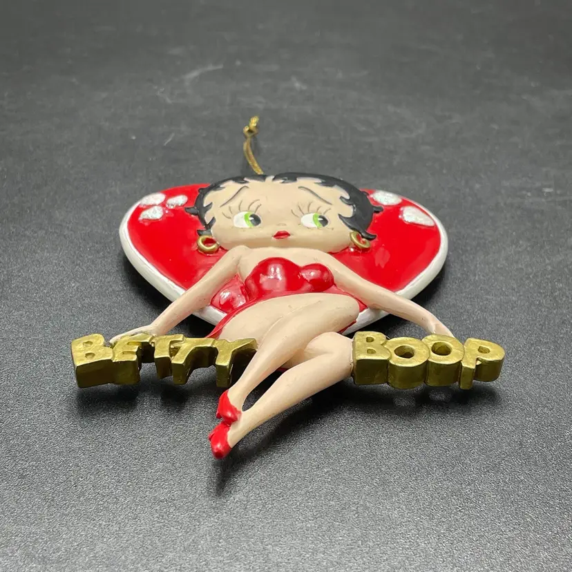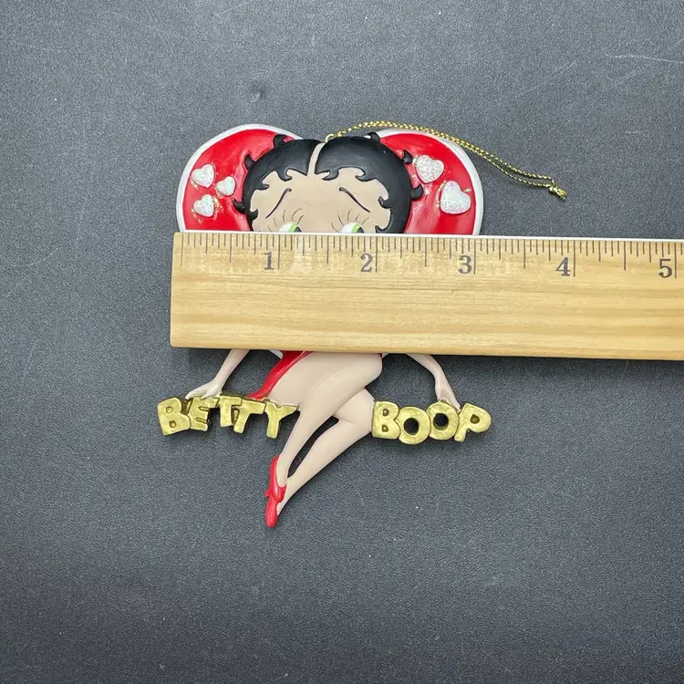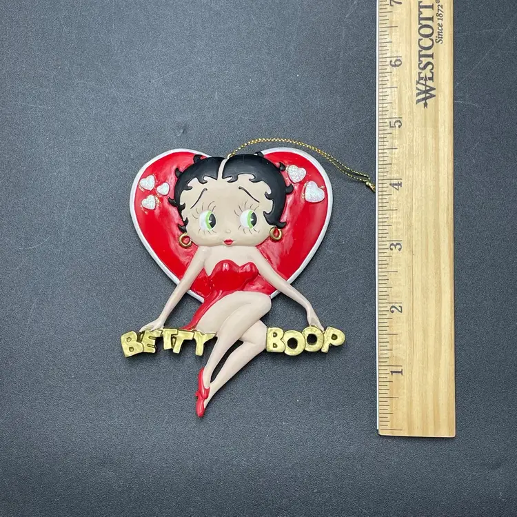 This is a vintage 1998 Kurt Adler Betty Boop with heart hanging ornament. Marked on the back. Made of PVC. Measures approximately 4.5" long x 3" across. No major flaws.