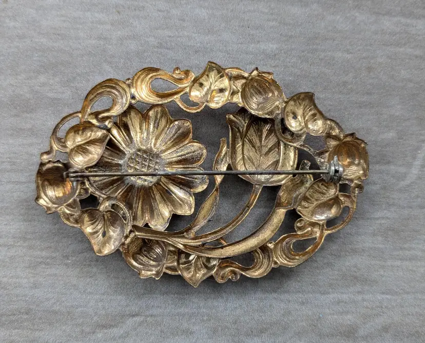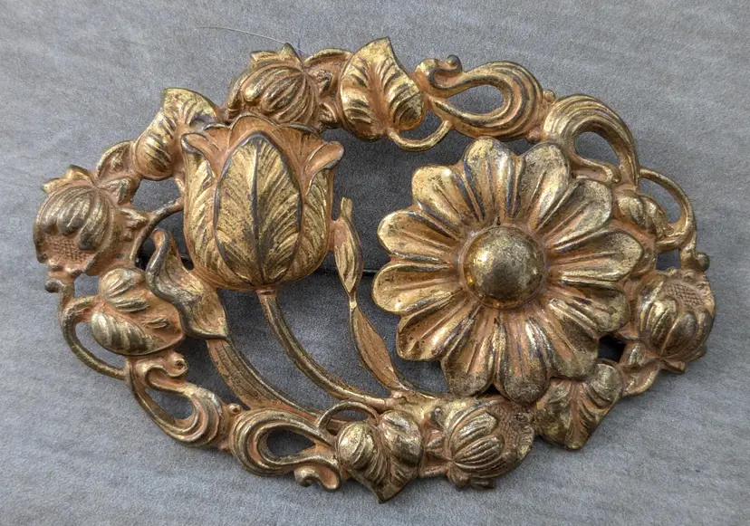 From the early 1900's, in a bright gold brassy finish, lightweight, 3"x2", hinge clasp
