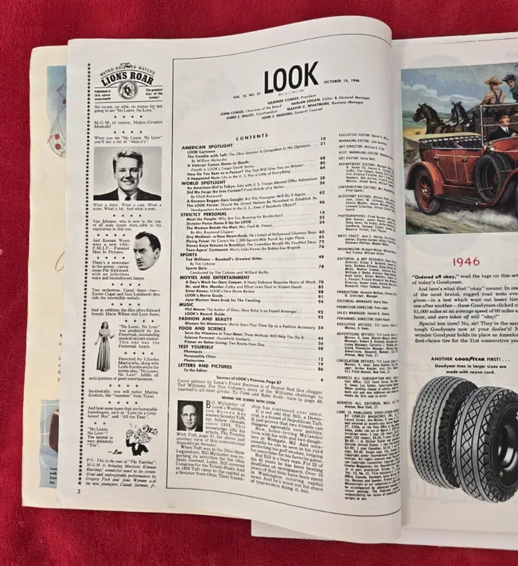 The product is a vintage issue of Look Magazine from October 15, 1946. Featuring stories on Ted Williams, the Red Sox, American Girl in Tokyo, Gary Cooper, and much more. This English-language publication from the United States offers a glimpse into the cultural and social landscape of the mid-20th century. With its distinctive blend of current events, entertainment, and lifestyle features, this magazine provides a unique snapshot of the era's news, trends, and personalities. The ads are amazing as well!