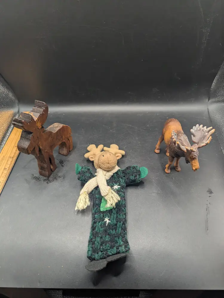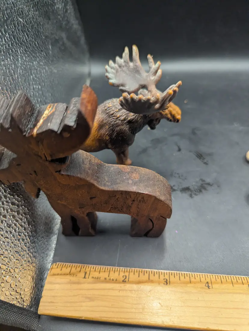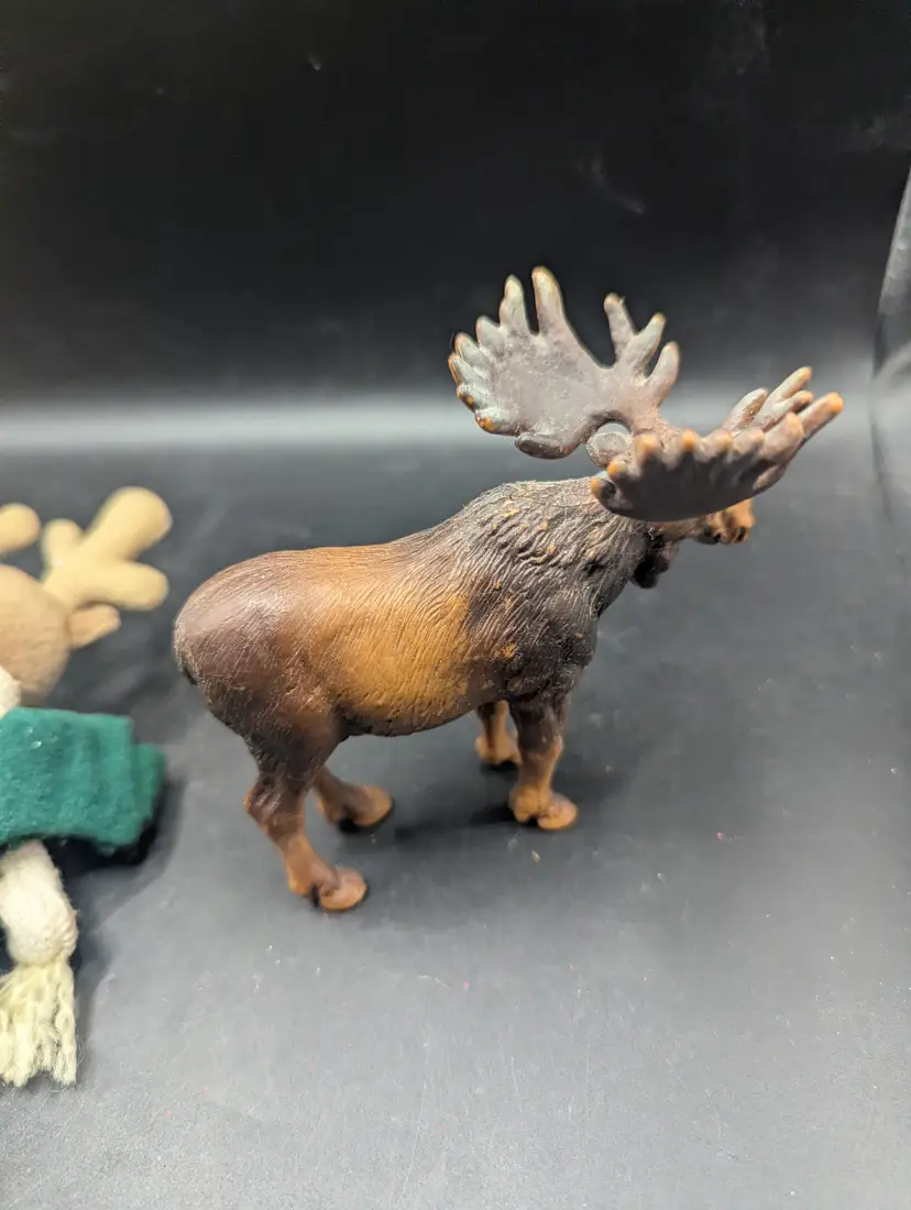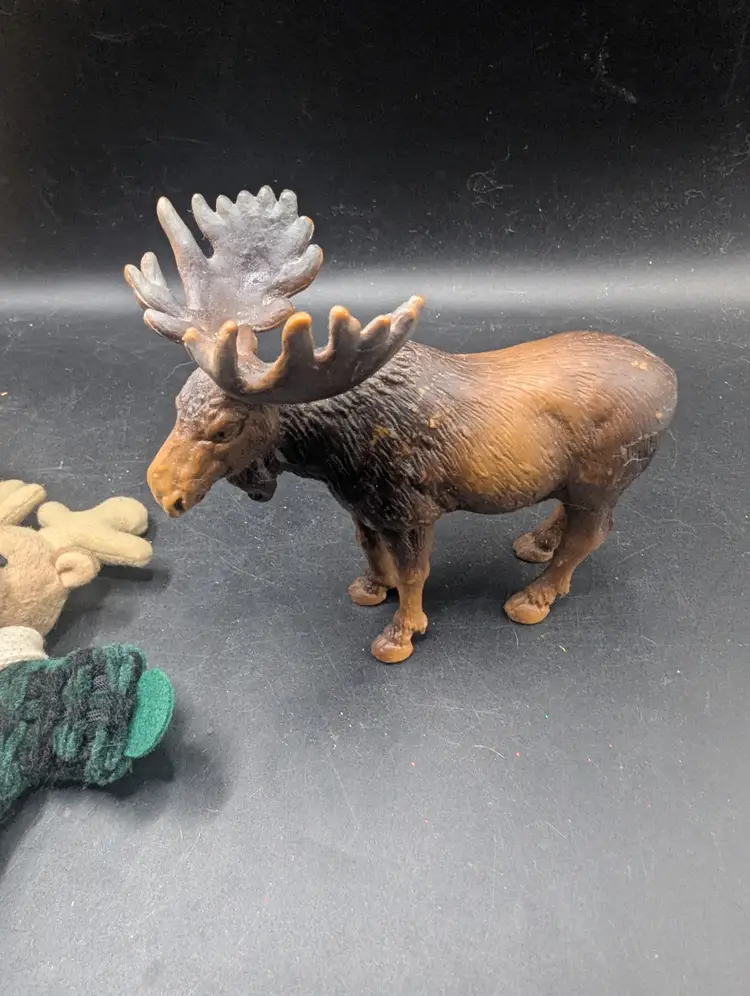 This is a fantastic Lot Of 3 Moose Themed Items Bookmark, Schleich And Handmade Wood Figurines. The wood does have a repair on his antler. The others are in perfect condition.