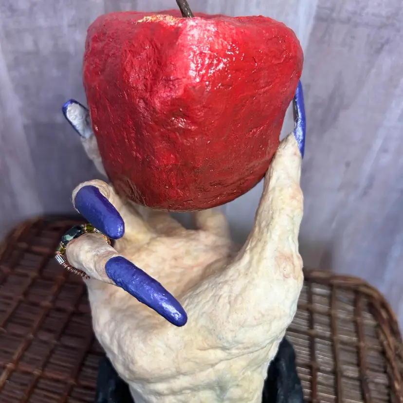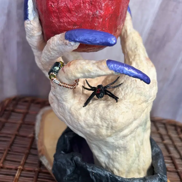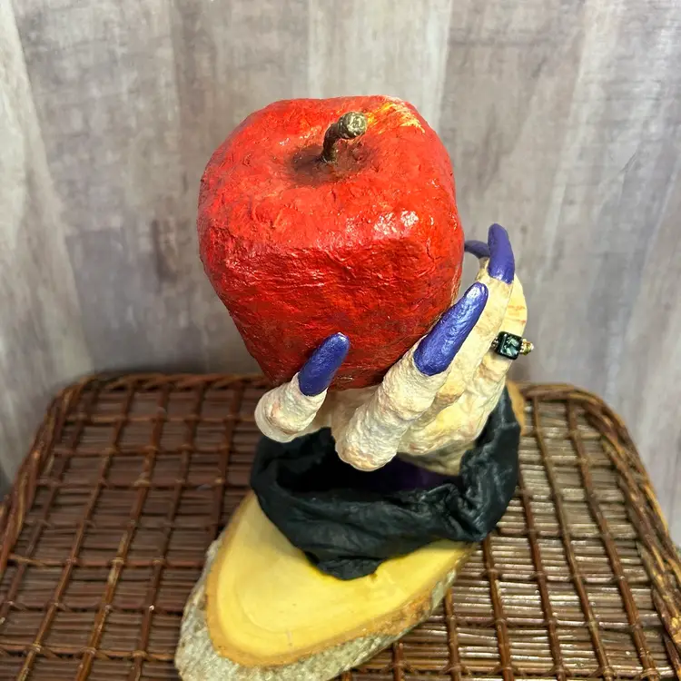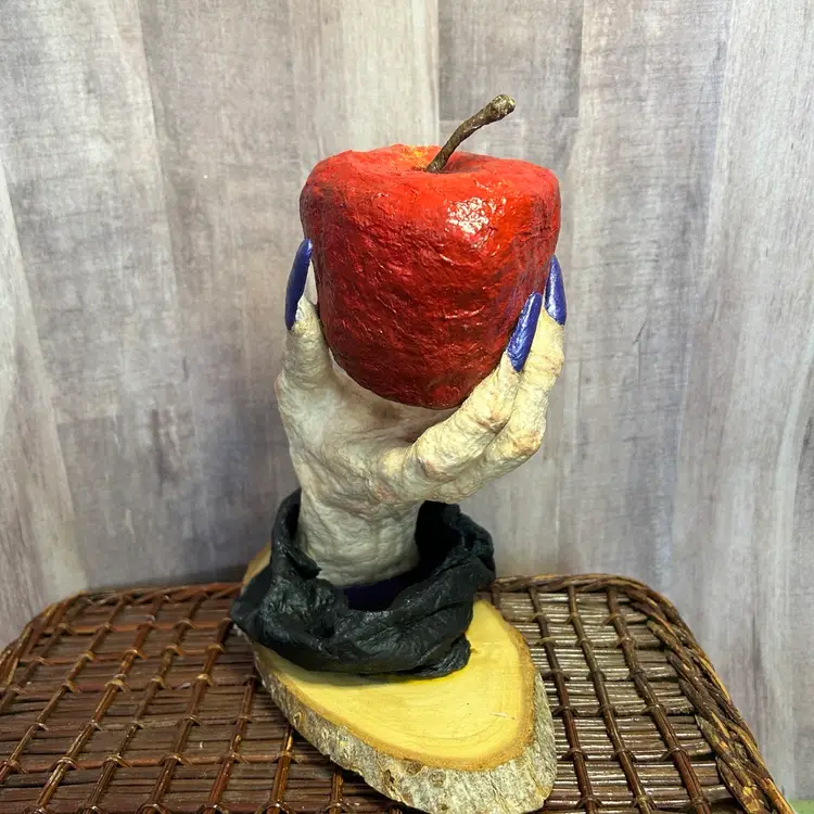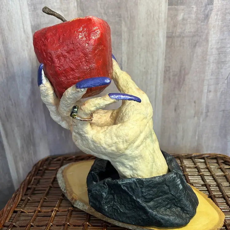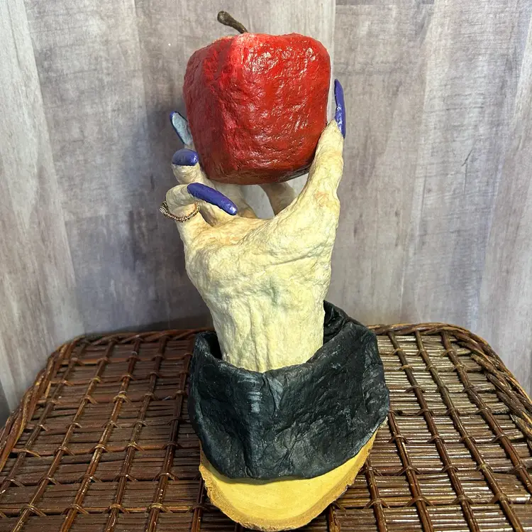 May I offer you an apple? ๐ This witchy hand and apple figurine is made of spun cotton and secured with 2 screws and wood glue to a wooden base. I also attached felt to the base. Spider is not attached so you can place it wherever you want! ๐ท๏ธ Measures 9 x 9 x 4.5