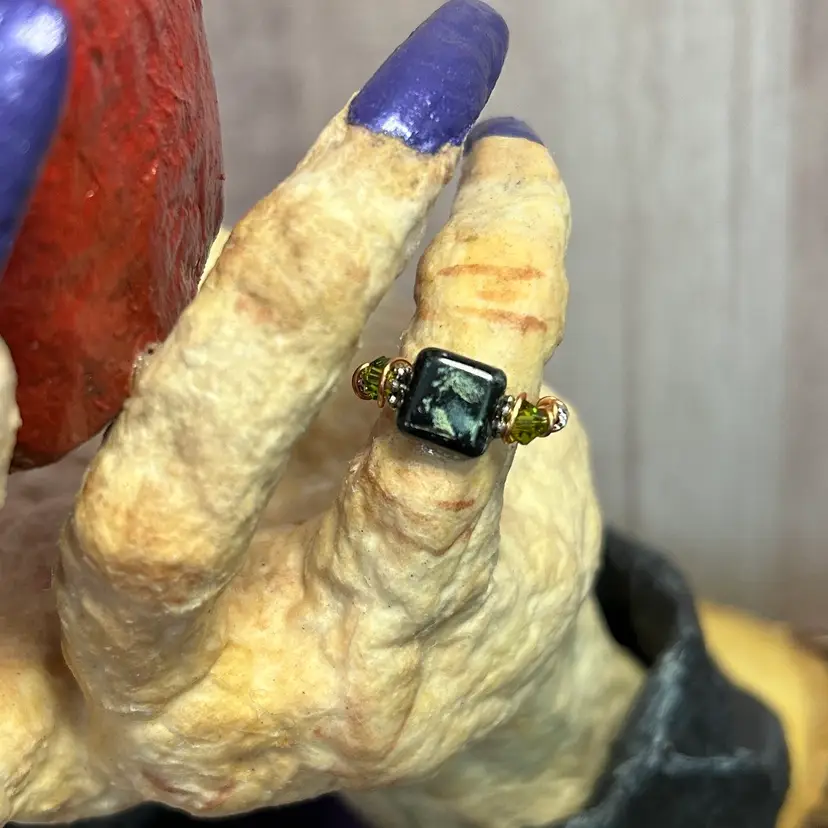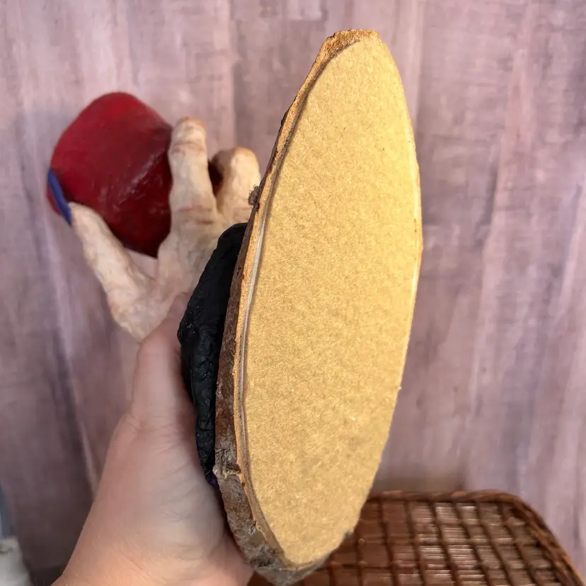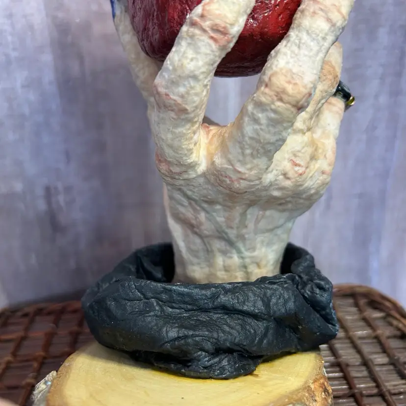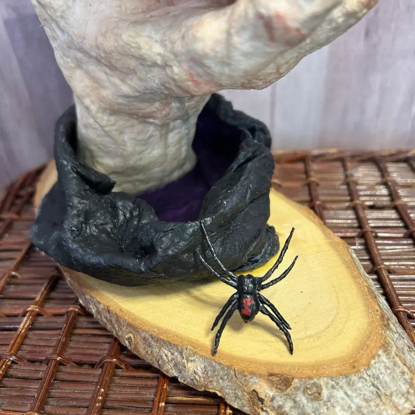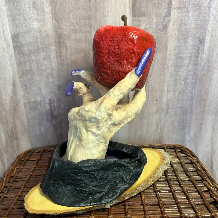 May I offer you an apple? ๐ This witchy hand and apple figurine is made of spun cotton and secured with 2 screws and wood glue to a wooden base. I also attached felt to the base. Spider is not attached so you can place it wherever you want! ๐ท๏ธ Measures 9 x 9 x 4.5