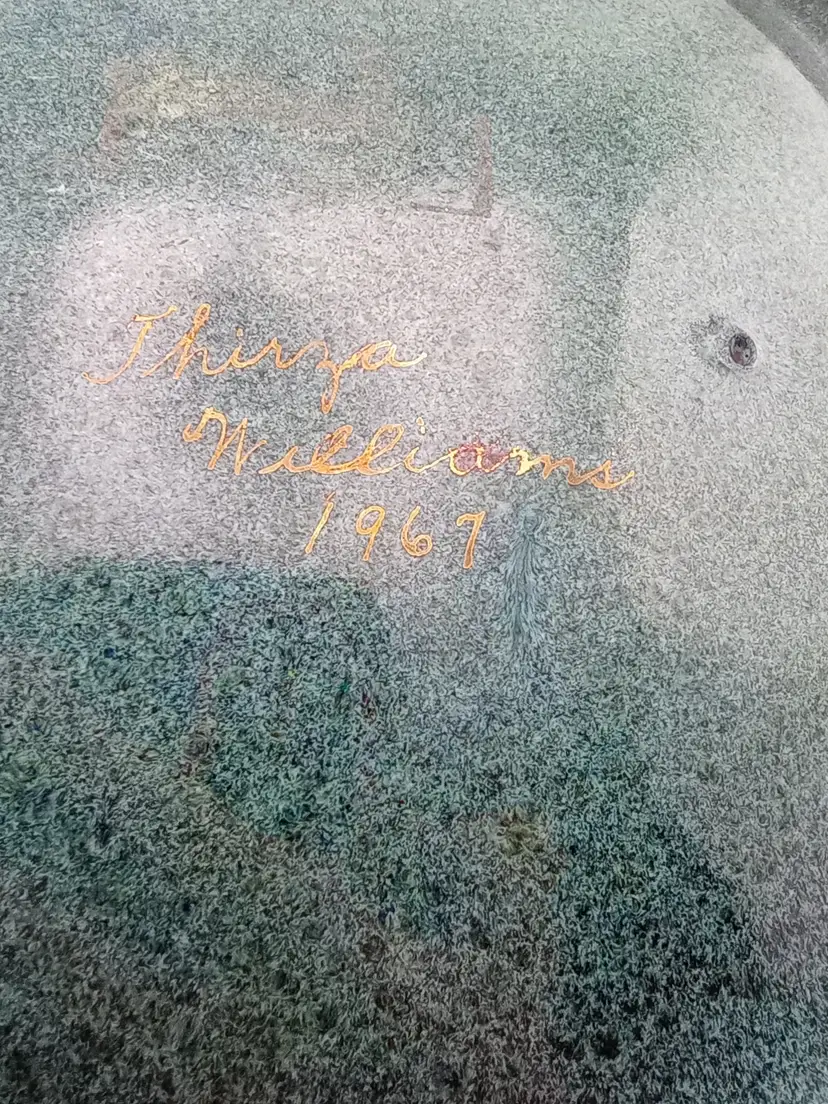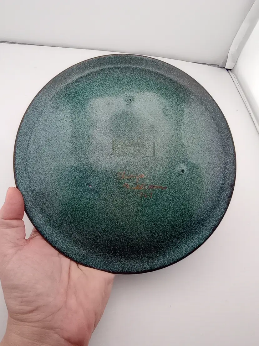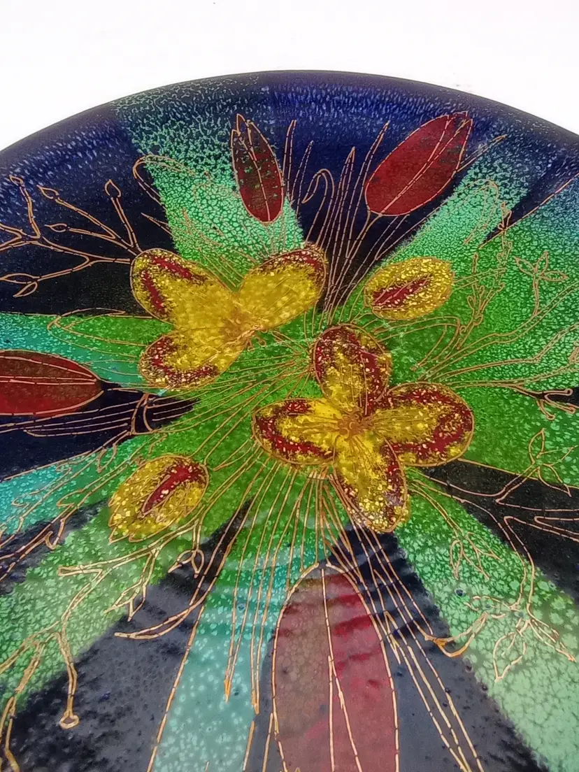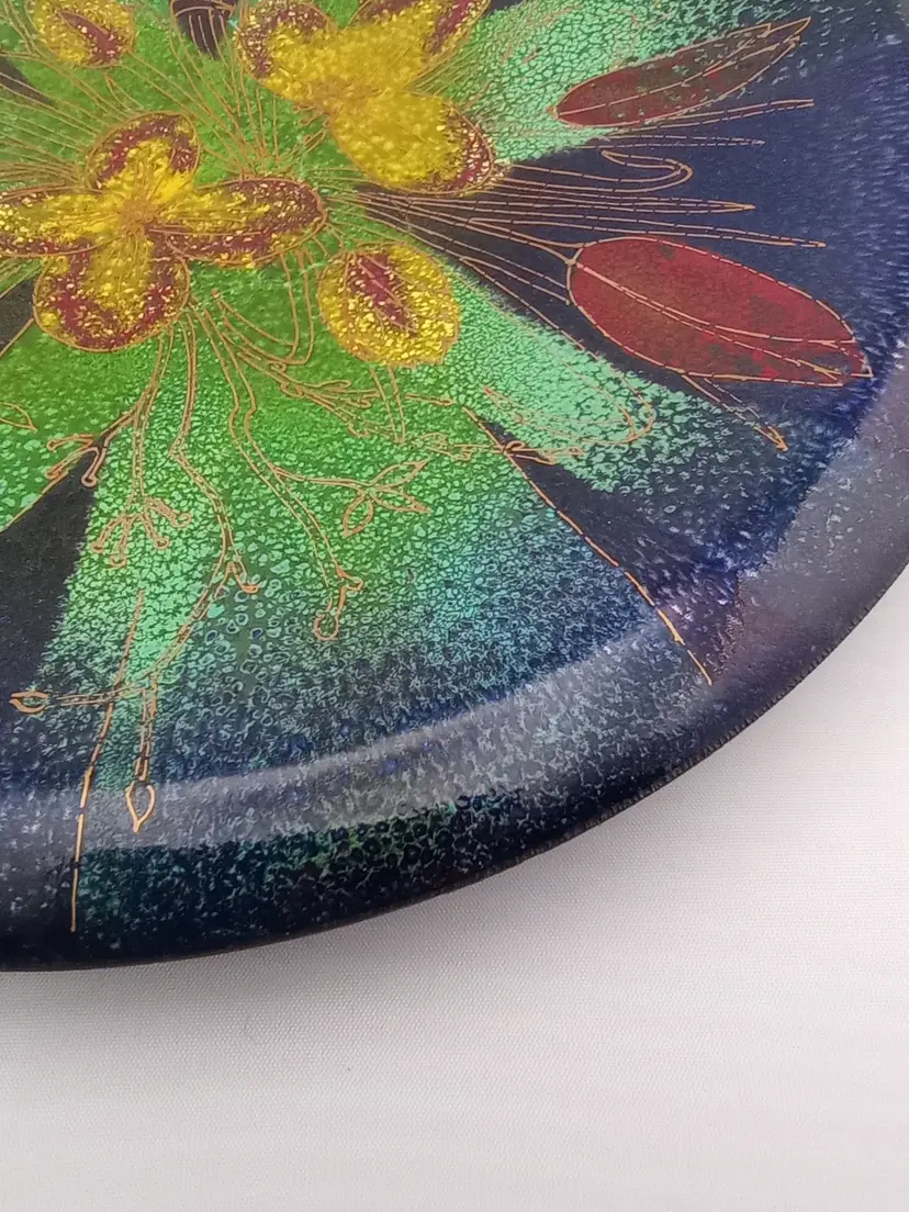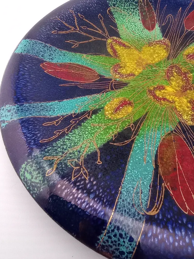 This is a gorgeous MCM enamel over copper plate from 1967 with spectacularly vibrant color. It is signed by the artist, Thirza Williams and is in excellent condition with no chips, cracks, or enamel loss. It's 7.75" across.