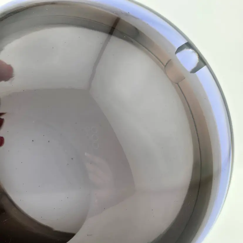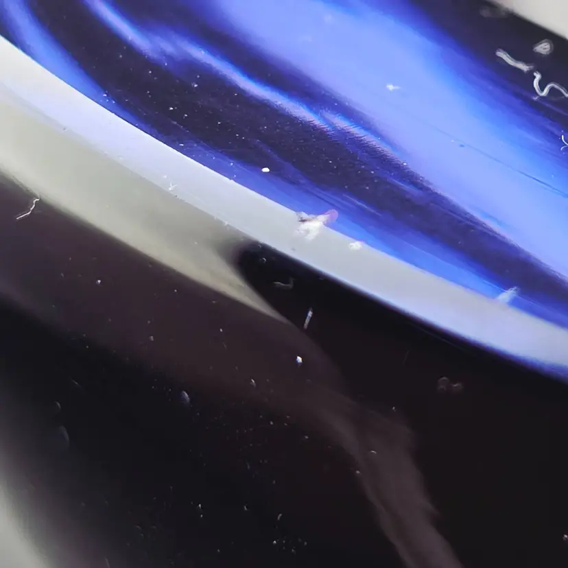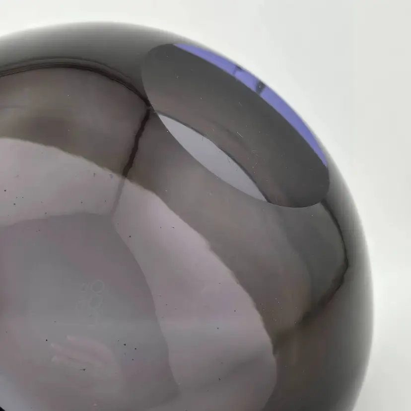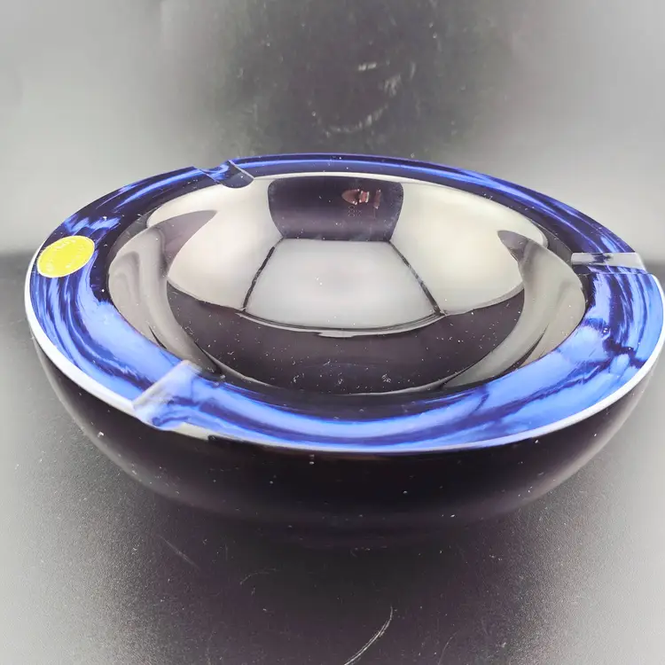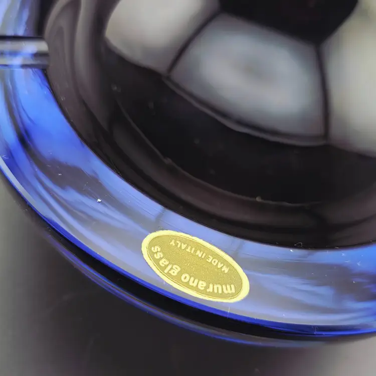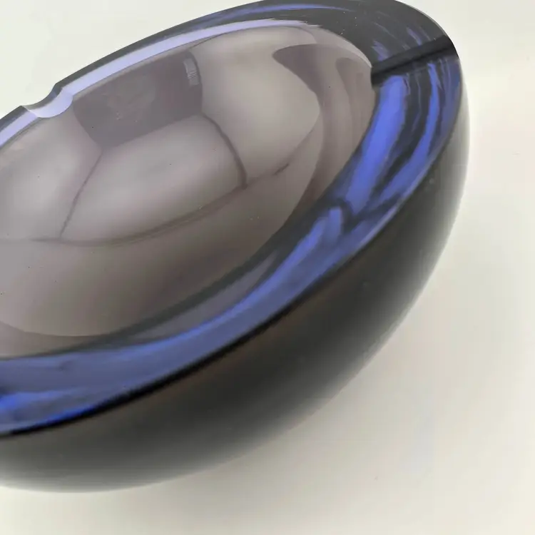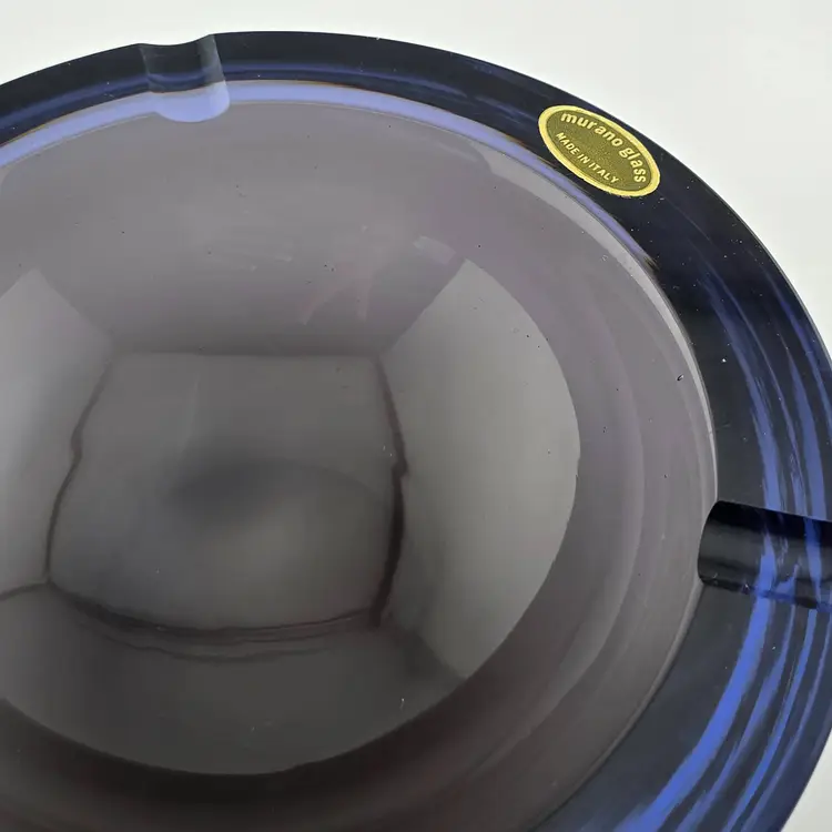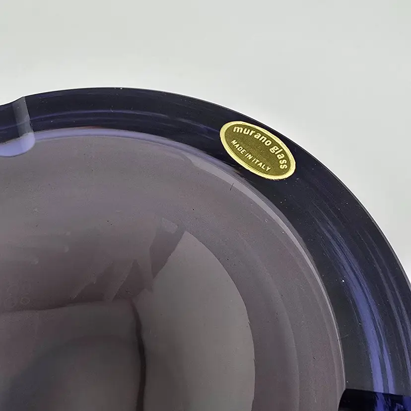 Surface scratches on bottom and inside but nothing serious. A very small flea bit on edge as seen in picutre. Stunning color. Changes in different settings. The rim has the Blue Glass Sommerso. Made in Italy. Production period 50s-70s. 7 inches round diameter and 2.75 inches tall.