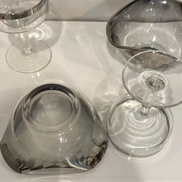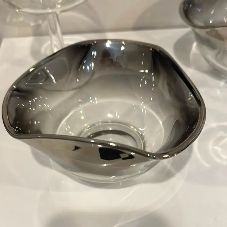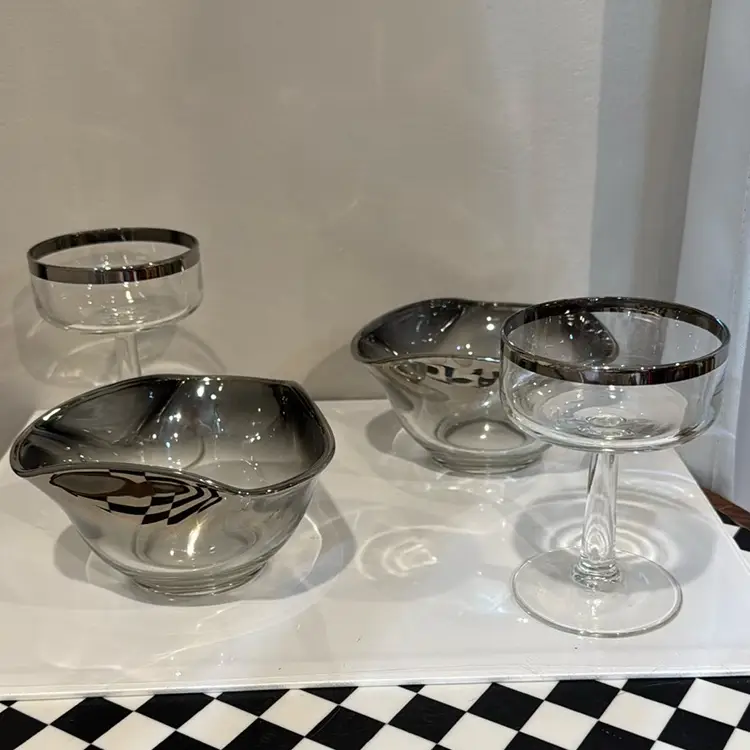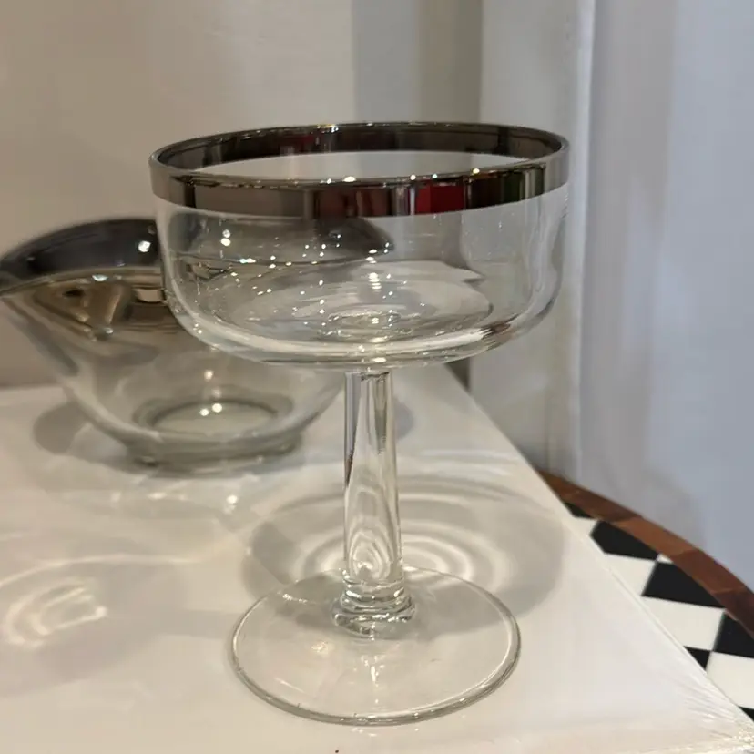 Beautiful mid-century, silver trimmed coupe glasses, and silver fade bowls. Amazing vintage condition. No chips or cracks. Coupe glasses measure 4 inches tall. Silver fade bowls are 2 1/2 tall by about 4 1/2 inches across. Great for champagne and snacks! Would be a great gift for any mid-century collector.